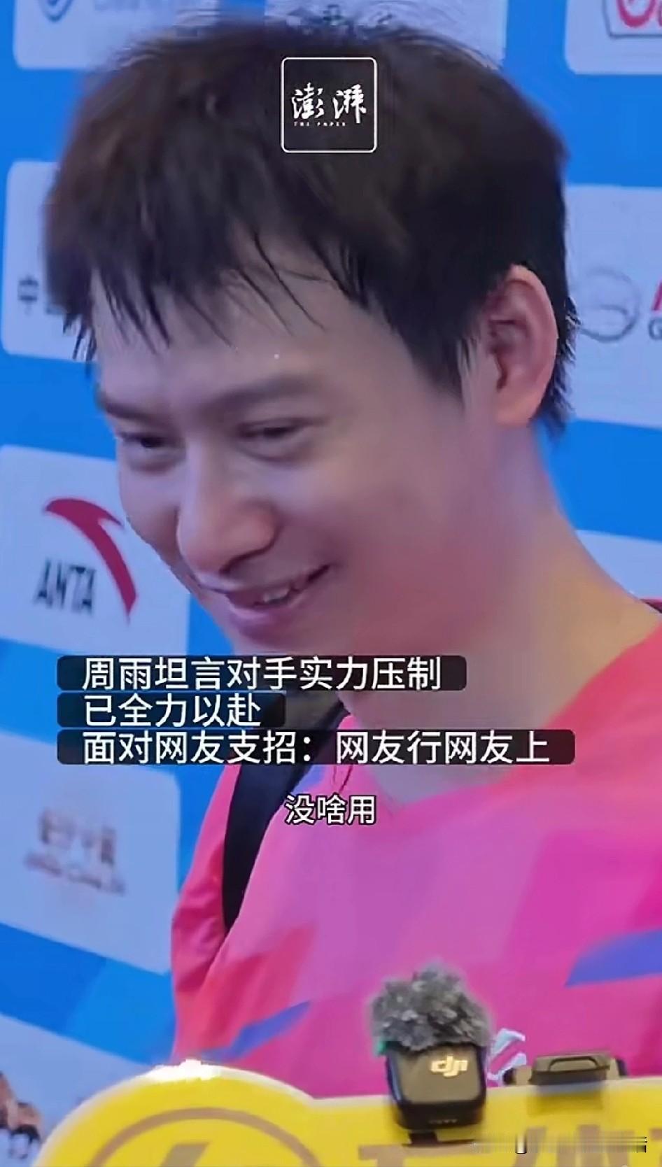 这是赢了比赛的樊振东 这是输了比赛的周雨 赢了比赛的一脸严肃 输了比赛的面带微笑 赢了比赛的满脸疲惫 输了比赛的一脸轻松 赢了比赛的眼里无光 输了比赛的满眼放光 赢了比赛的想好了再说 输了比赛的可以随便说 赢了比赛的从不提网友 输了比赛的说网友说的没啥用 赢了比赛的不怎么行 输了比赛的怎么的都行