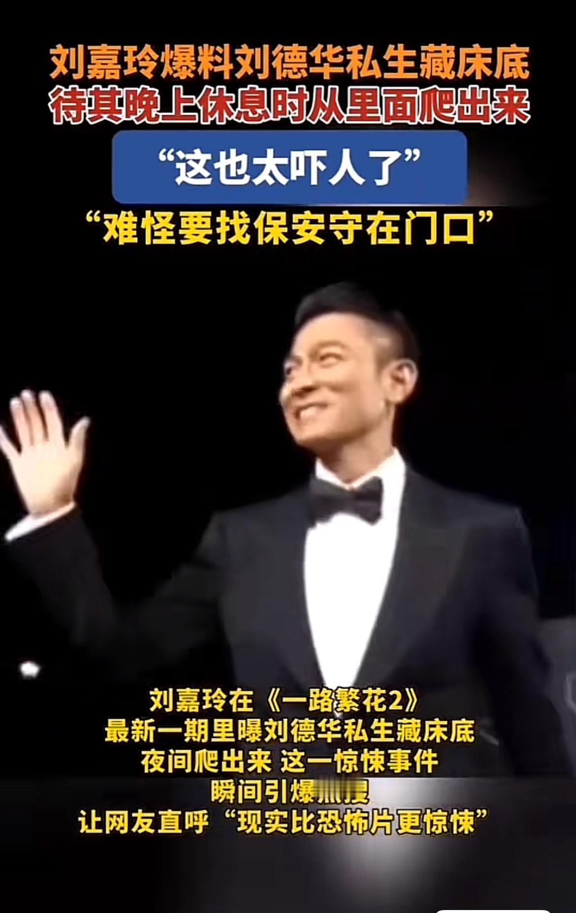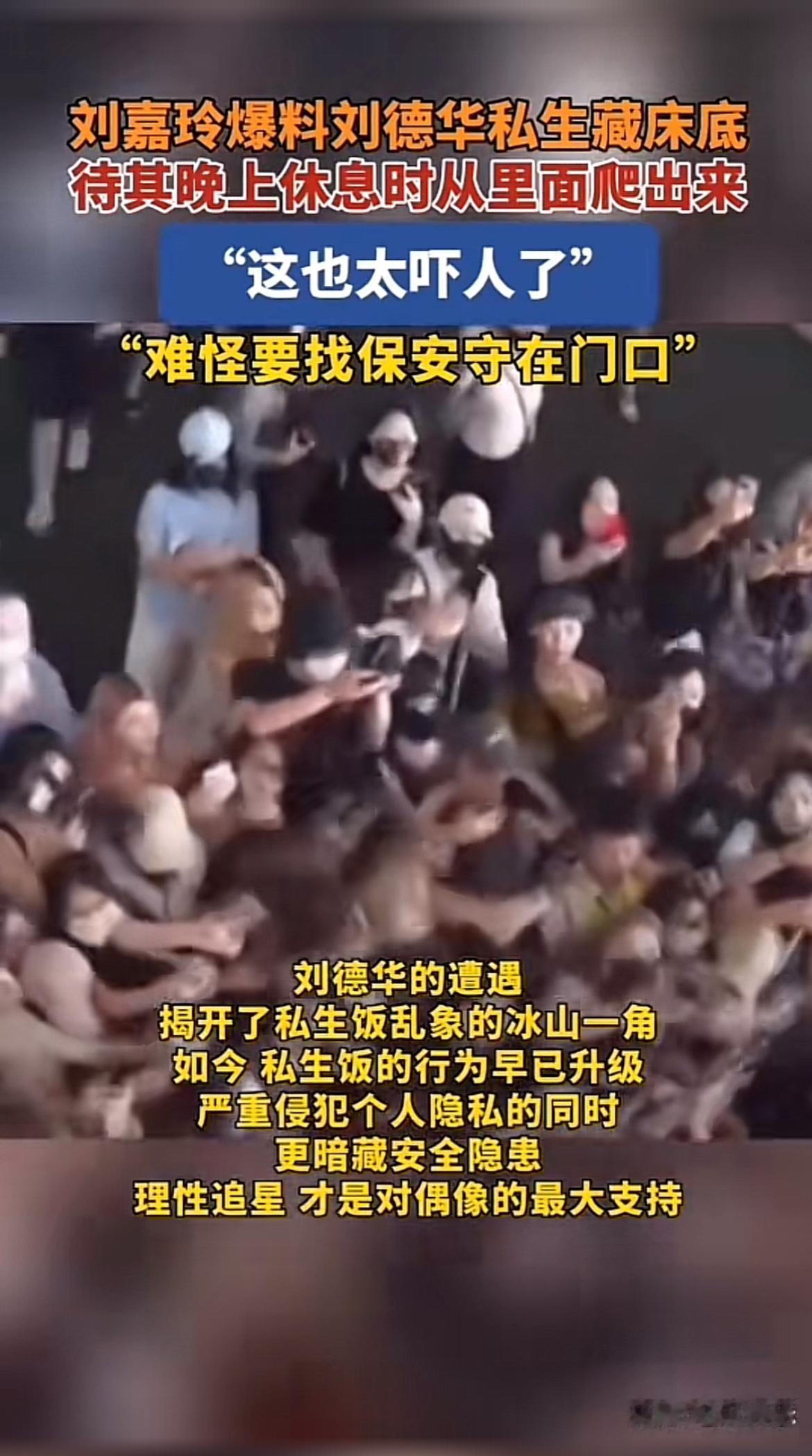刘嘉玲在综艺里讲的刘德华被私生饭缠疯的事儿,真让人惊掉下巴。当时他们在横店拍《狄仁杰之通天帝国》,刘德华雇保安24小时守在住所门口。原来是之前有天深夜,他收工回房准备休息,竟有私生饭从床底下爬出来,这场景想想都恐怖。 不止刘德华,刘嘉玲老公梁朝伟也被私生饭困扰,为避免麻烦都很少外出。明星也是人,需要私人空间。这种疯狂的私生行为真该被制止,别让追星变成对他人生活的侵犯。