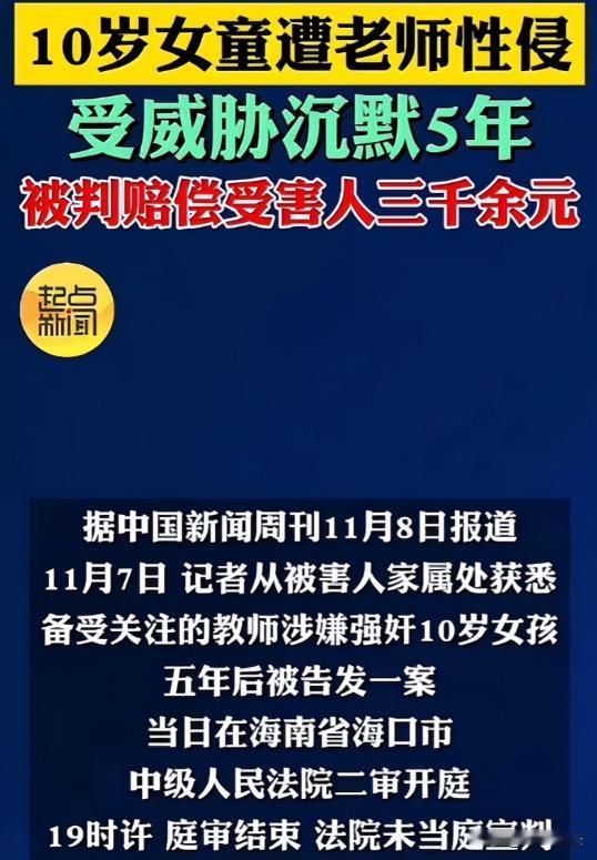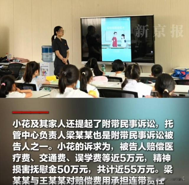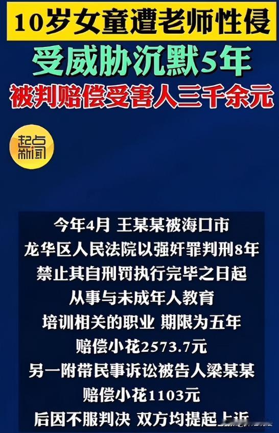 海南海口,10岁女孩被爸妈送到熟人开的托管中心,没想到,熟人的丈夫,趁小女孩在宿舍上厕所出来时,把她强 奸了,还威胁她不许说出去,小女孩回家路上一直哭,妈妈发现异常但没深究。5年后,小女孩上高中了,才告诉妈妈并报了警。 小花周一到周五都吃住在托管中心,周五下午爸爸才会来接她回家。 2018年6月的一个周五,下午4点10分,她回托管中心等爸爸,去三楼宿舍收拾衣服,上完厕所出来,就看到王某某站在门口。 这王某某是谁呢?他是托管中心负责人梁某某的丈夫,还是某中学的美术老师。 40岁的王某某,外表看似正人君子,实则行为卑劣,他关上门后对小花实施了侵害,并在过程中打了她的脸。 小花当时肯定害怕极了,一个10岁的小女孩,哪经历过这种事。 事后,王某某还威胁小花,不许说出去,不然就S她全家,还让她洗干净,这一威胁对于一个孩子来说极为恐怖,导致她不知所措,在回家的路上一直哭泣。 妈妈注意到小花一直在哭泣,并发现她下 体有出血现象,于是询问了几句。 然而,小花根本不敢说出实情,妈妈询问后也未得到有用信息,只以为是走路或骑车时磨破了皮,于是用酒精擦拭并涂抹了药膏。 妈妈当时要是能多问几句,多深究一下,也许小花能早点摆脱阴影。 但随后几年的折磨一直深藏在小花的心底,她陆续向三位同学透露了此事,或许在他们的同情中得到了些许安慰,然而,这点安慰仍不足以让她鼓起勇气将真相告诉对她期望和要求极高的母亲。 直到2023年9月,小花上高中了,懂了点法律知识,她想到自己受的苦,又怕别的女孩也被王某某欺负,这才鼓起勇气告诉了妈妈。 妈妈知道后,肯定又气又心疼,找王某某夫妻沟通,可人家根本不承认,沟通无果。 妈妈没有放弃,10月就带着小花报了警。 这一报警,就牵出了王某某的罪行,原来,当时有证人证实王某某案发时在托管中心,学校课程表也显示他无课有时间作案。 小花就医还有处 女 膜 陈旧性损伤记录,心理评估也显示她有抑郁倾向,王某某自己的供述还前后矛盾。 2025年4月,一审法院判决王某某犯强奸罪,判处有期徒刑8年,刑满释放5年内不能从事和未成年有关的工作。 尽管该案的刑事判决对王某某的罪责做出了较为明确的定性,但小花及其家属对民事赔偿方面并不满意。 小花及其家属要求赔偿约55万元,其中包括误学费、精神损害抚慰金等。 然而,法院仅支持了实际发生的部分交通费和护理费,共计3676.7元,其中王某某承担70%,即2573.7元,梁某某因疏于管理承担30%,即1103元。 为什么会这样判呢? 法院指出,误学费和精神损害抚慰金缺乏直接证据支持,且超出了刑事附带民事诉讼的赔偿范围。 小花及其家属对此表示不服,认为赔偿金额与他们的预期相差甚远。目前小花的上诉案件尚在二审的审理中,法院尚未作出最终的裁定。 从这件事能看出来,家长把孩子送到托管中心,本是为了孩子好,可谁能想到会遇到这种事。 托管中心负责人梁某某,作为王某某的妻子,平时疏于管理,也有一定的责任。 而王某某,作为一个老师,本应该教书育人,却做出这种伤天害理的事,简直不可原谅。 小花这些年一直活在痛苦里,好不容易鼓起勇气说出来,可赔偿问题又让她和家人犯了难。 作为家长,尤其需要关注孩子的异常表现,及时与孩子沟通,尽早发现孩子的问题,对于那些对未成年孩子造成伤害的行为,必须予以严厉惩戒,绝不能姑息迁就。 小花及其家属认为赔偿金额过低,但法院有其判定标准,这背后涉及法律规定和证据认定,并非一方简单主张多少就能决定。 某某除了要承担刑事责任,在民事赔偿上,对于小花的精神损害抚慰金不要应该给予支持吗? 根据《刑事诉讼法》及相关司法解释的规定,刑事附带民事诉讼的赔偿范围主要限于因犯罪行为造成的物质损失。 对于误学费、精神损害抚慰金等项目,法院认为缺乏直接证据支持,且超出了刑事附带民事诉讼的赔偿范围。王某某承担70%的责任,是因为他作为直接侵权人,对损害结果的发生起到了主要作用。 确实,这事对小花的精神造成了极大的伤害,这种伤害可能会伴随她一生,而且,王某某的威胁对小花心理产生了长期的负面影响,精神损害抚慰金是合理的赔偿要求。 梁某某作为托管中心负责人,对王某某的行为负有监管不力的责任,在民事赔偿上应承担更大比例,毕竟托管中心是孩子吃住的地方,梁某某有义务保障孩子的安全。 托管中心对在其场所内的小花有安全保障义务,梁某某作为负责人,没尽到管理职责,导致王某某有机会实施侵害行为。 依据《民法典》第一千一百九十八条规定,经营场所、公共场所的经营者、管理者,未尽到安全保障义务,造成他人损害的,应当承担侵权责任。 法院也判决梁某某因疏于管理,承担了30%,1103元的责任。 请从您的角度出发,阐述您对这件事的看法和态度。