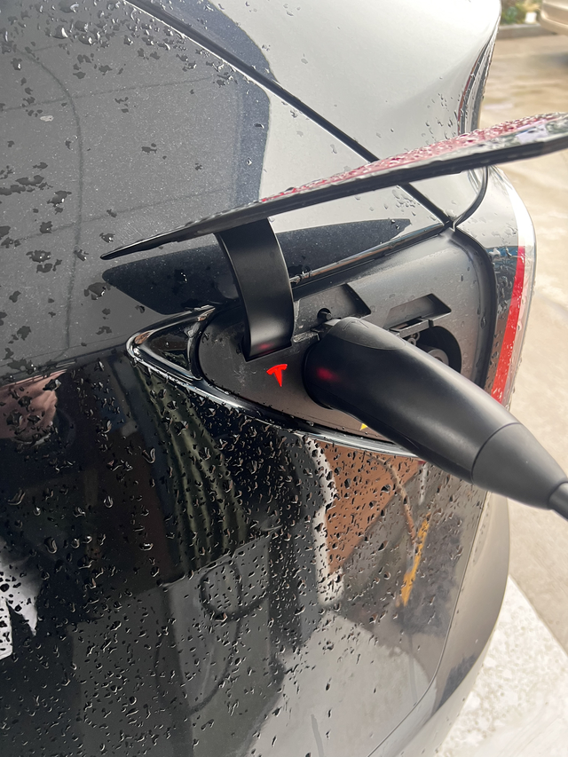 特斯拉家用随车充充电速度非常慢! 最近为了回家方便充电,在某东购买了家用随车充,1999块,比前几个月提车的时候便宜了1千块。 随车充线长6米,有两个插头,一个8安,一个16安,8安的连接家用普通三孔插座,16安的连接空调三孔插座,家里三孔插座一定要有接地线,如果没有接地随车充无法使用,充电口会一直亮红灯,主要是为了保障安全,这一点特斯拉做的不错。 试用了8安的插头,充电速度非常慢,每小时充电11公里,充了4个小时续航增加了44公里,不过在家里如果不出远门,充一夜够用了。 16安的要连接空调插座,由于距离比较远,没有试,理论上应该比8安快一倍。 图3的插座没有接地,充不进电,图4是充不进的情况。图5是正常充电情况。