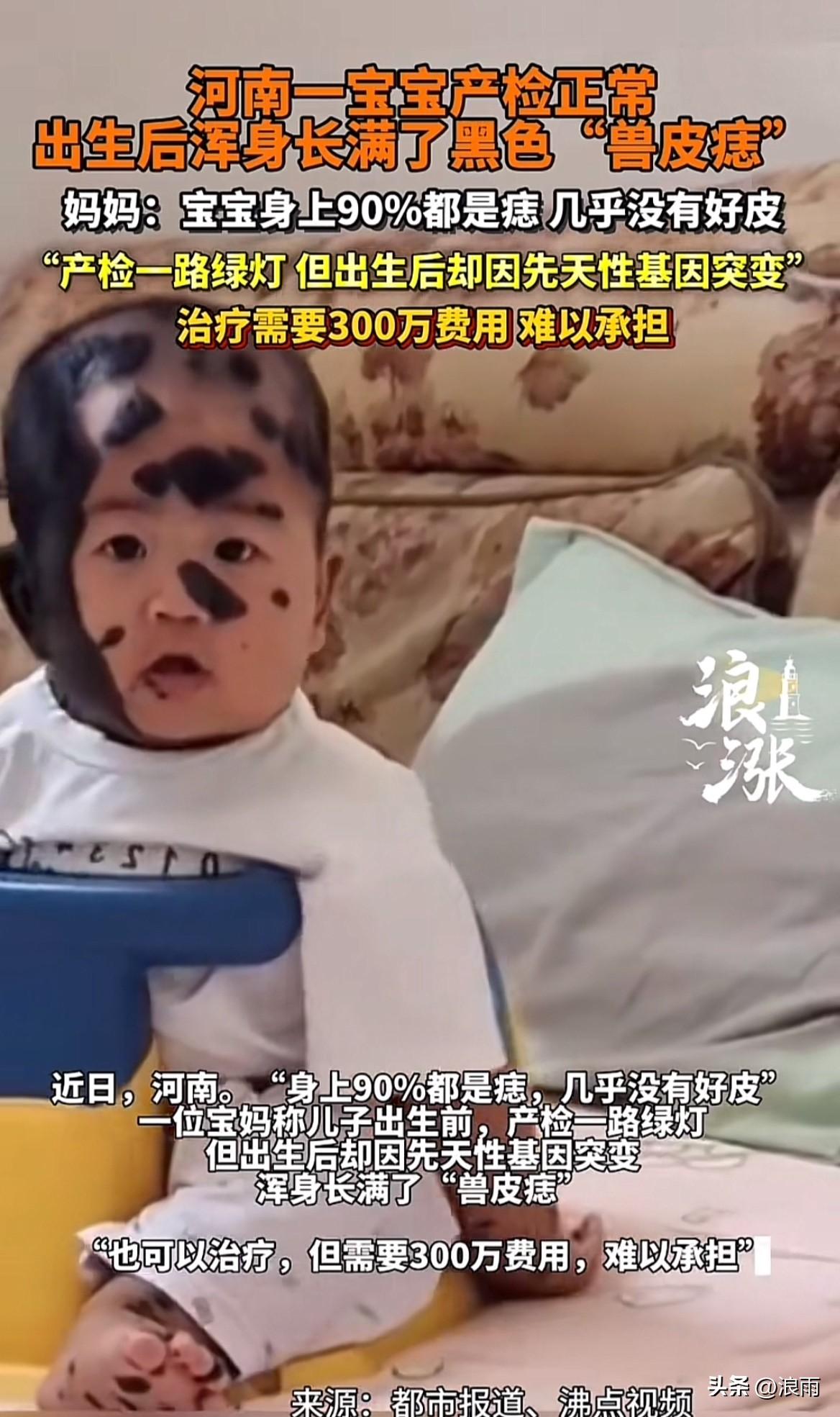 小孩的脚底都长了这种黑皮。全身90%的皮肤被这种黑皮覆盖。这个小孩子天真可爱的样子让人心疼,他还不知道这覆在他身上的东西会对他造成什么的伤害。 查了一下,这种黑痣被称为兽皮痣。治疗难度很大,面临多种挑战。尤其复发这么大面积的可能难以完全去除,而且还有复发的可能性。 尤其是脸部的治疗,切除不彻底可能复发,完全切除了,还有可能留下疤痕。 还有就是兽皮痣还存在转变为黑色素瘤的风险,所以,越早干预越好。但300万的治疗费用却让这个家庭难以承受。 一路产检路灯,却还是发生了这样的意外情况。确实让人很难接受。