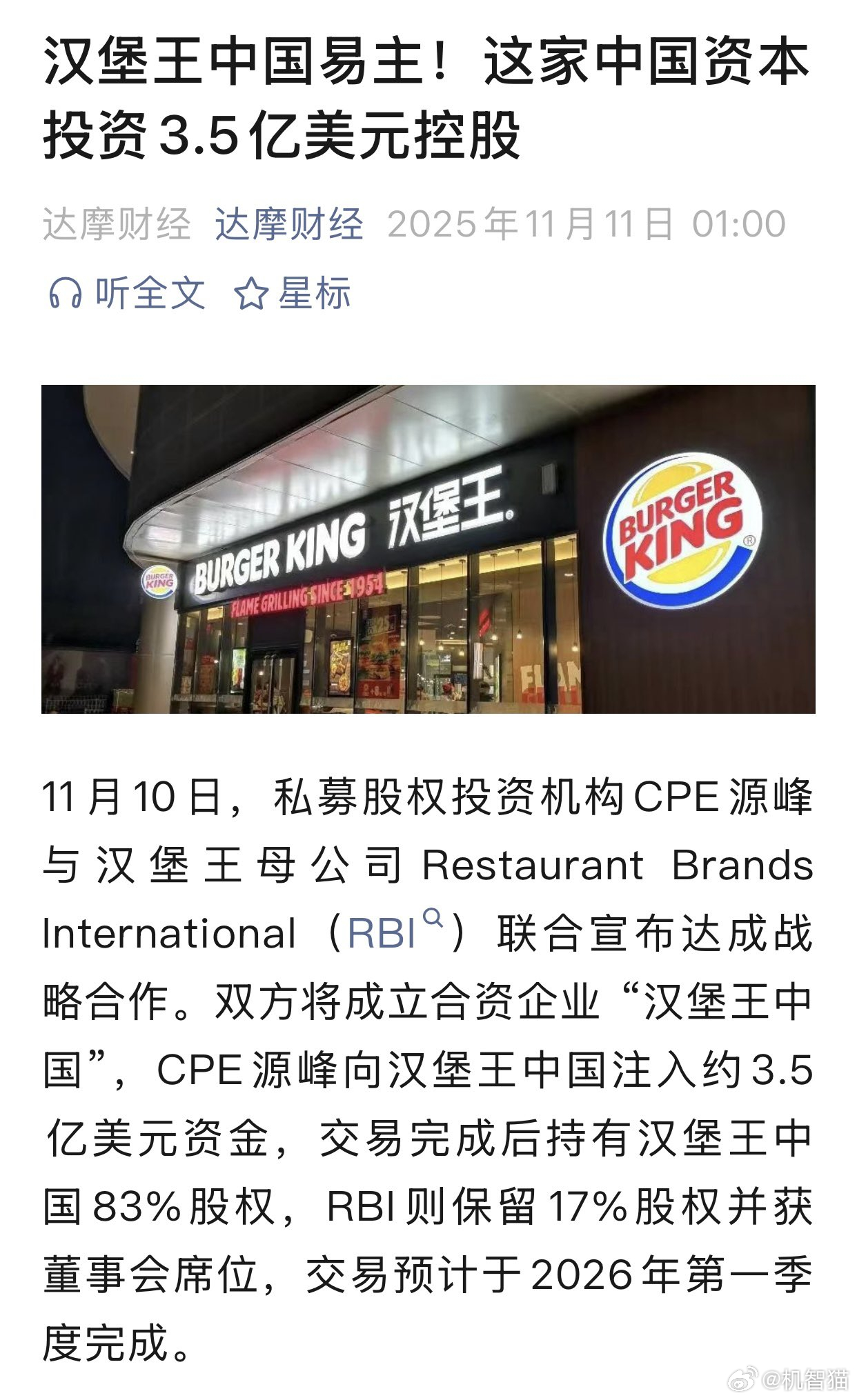 汉堡王(中国区)也被卖了