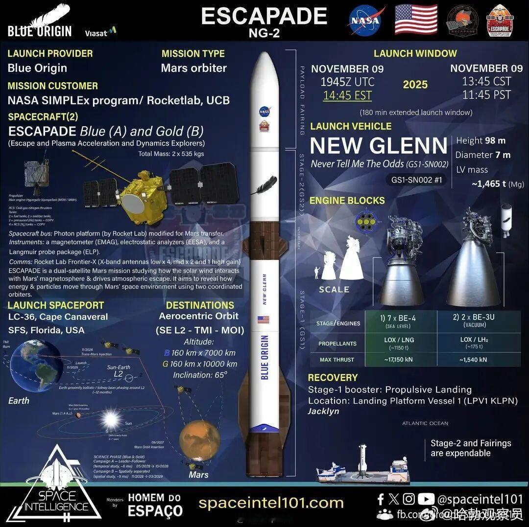 今天(10日),据Space.com报道,蓝色起源的新格伦号 NG-2 火箭即将执行其第二次发射任务,将名为“蓝色”与“金色”的双子 ESCAPADE 航天器送往火星。