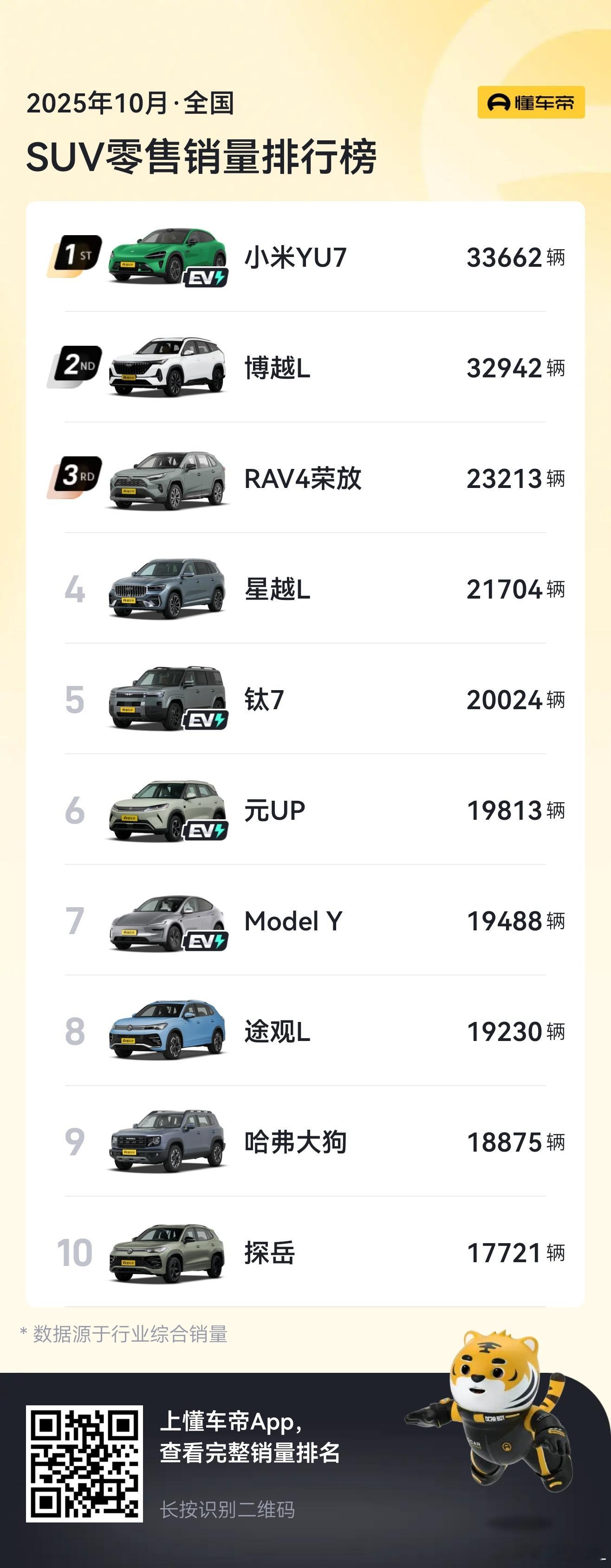 10月份的SUV销量,前十里面已经六台纯燃油车了。