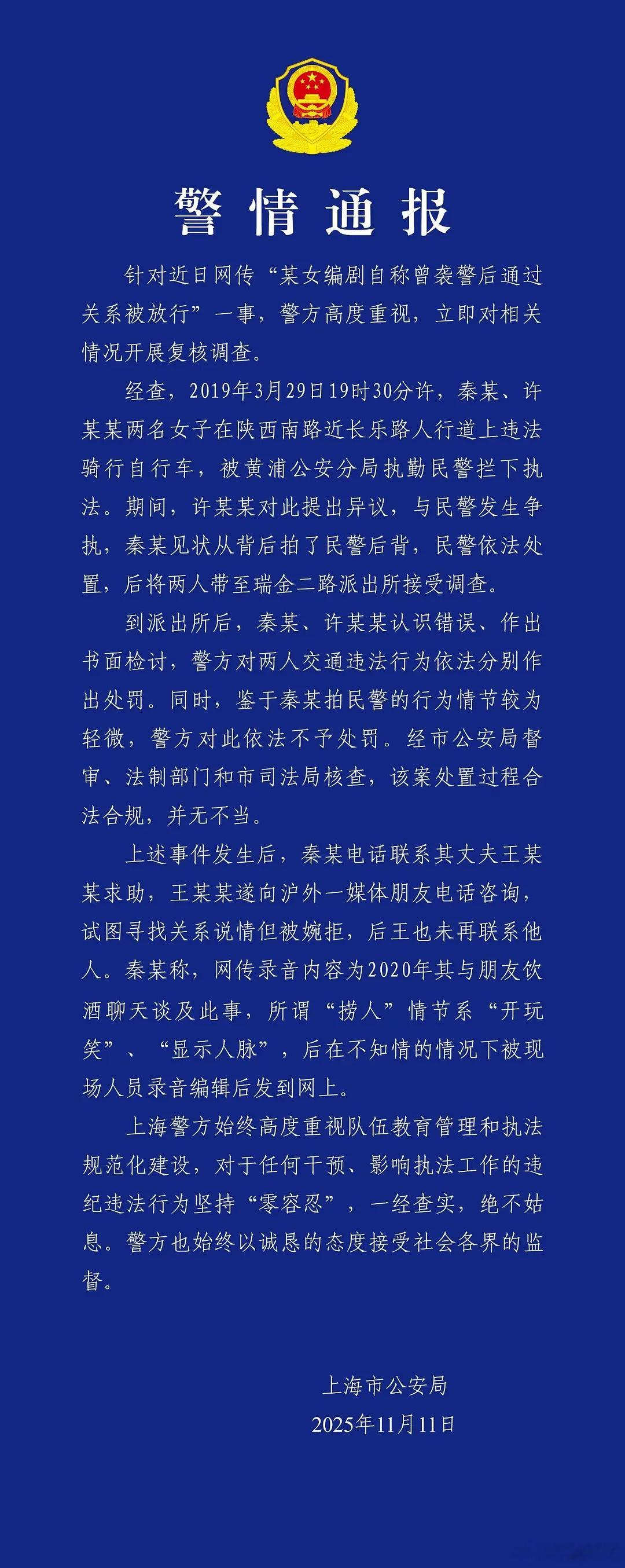秦雯吹牛装逼被蓝底白字通报警方通报编剧秦雯自称袭警捞人