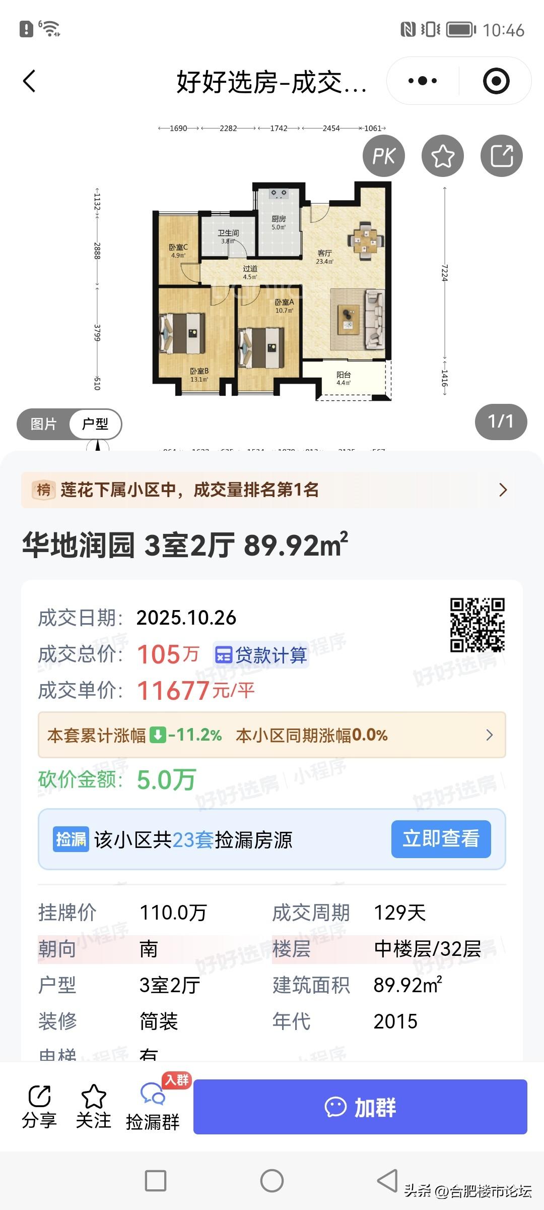 合肥二手房市场比较热门的几个小区最新成交的。买二手房的都是会砍价的高手。 公园万象小高层中间楼层,四室的单价一万六。高新区最好的位置,祥源城单价一万五。经开区翡翠湖旁边的世茂单价一万二千多,山姆超市旁边的华地润园单价一万一。