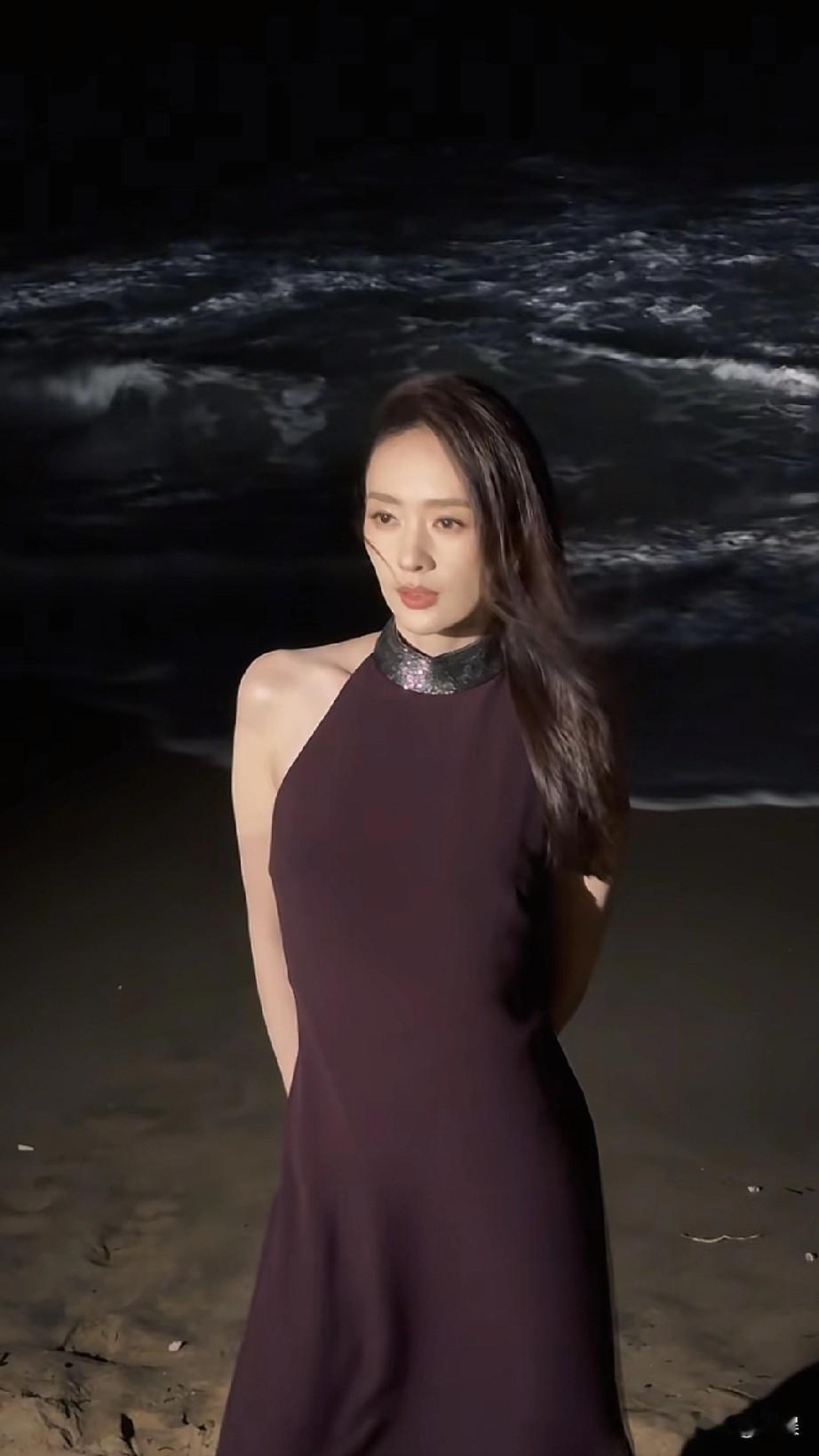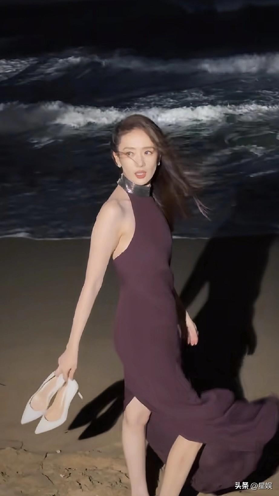 童谣紫色裙子,提着高跟鞋在海边