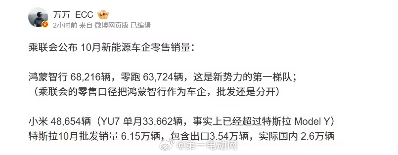 按博主 分析,小米 YU7 销量事实上已经超过特斯拉 Model Y,因为特斯拉 10 月批发销量 6.15 万辆,包含出口 3.54 万辆,实际国内 2.6 万辆 小米汽车10月零售销量48654辆