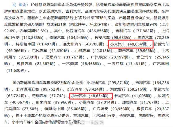 乘联会25年10月最新数据显示,小米汽车 新能源乘用车零售 48654 辆,小米YU7 批发销量达33662辆