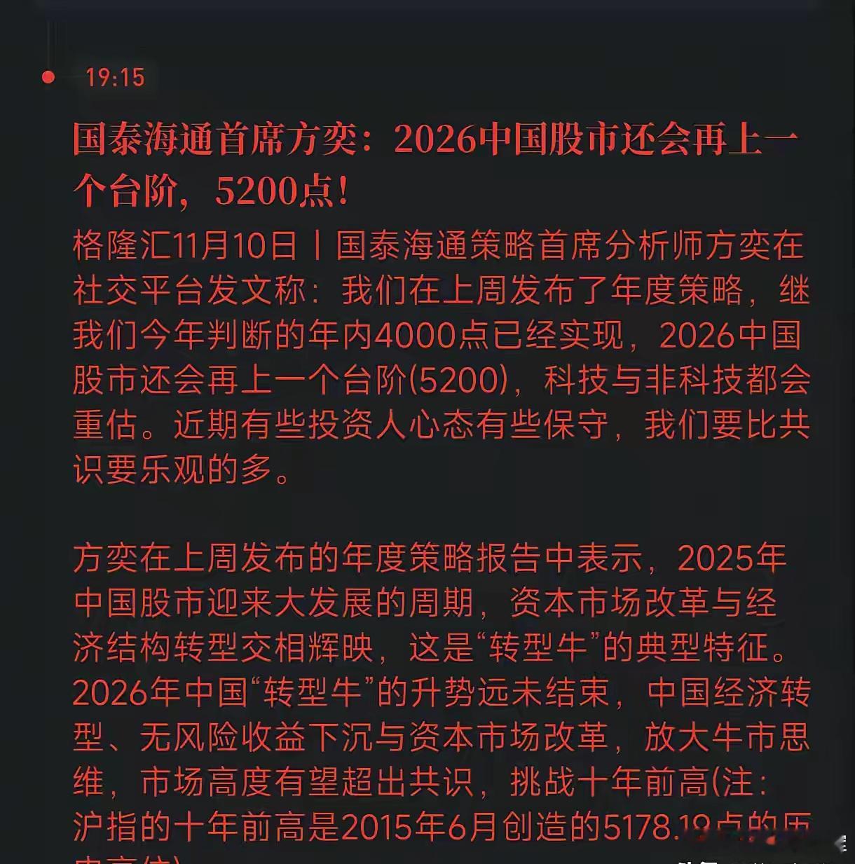 看到国泰海通首席方奕直接喊出2026年看5200点,比今年4000点还要再涨30%!
