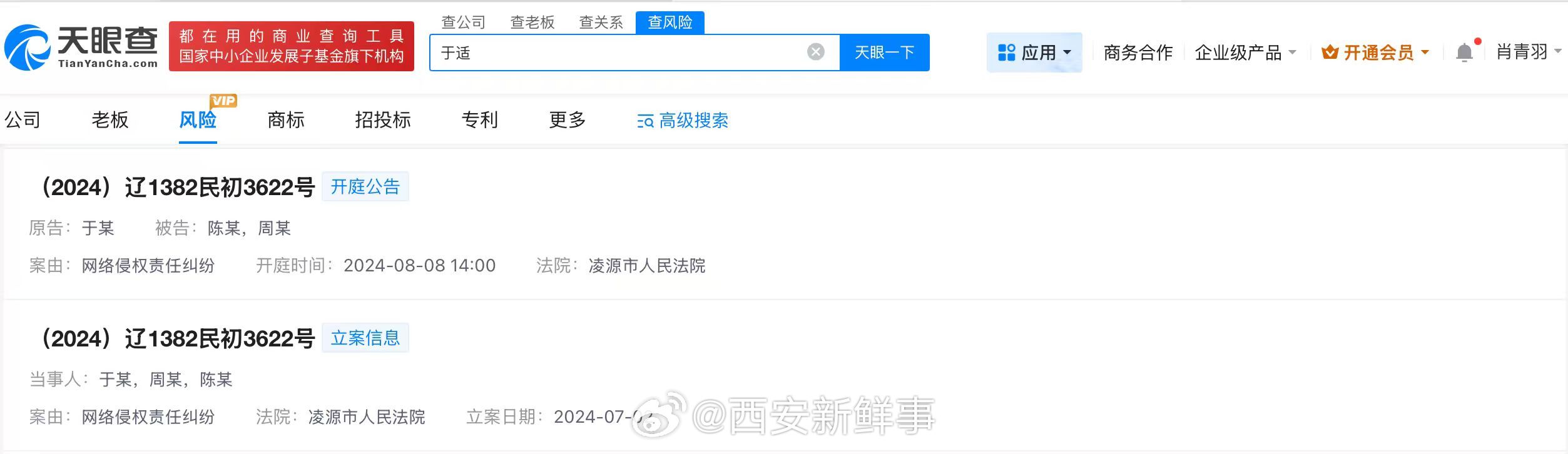 【于适方发布维权进度说明】于适方维权新进展11月11日,于适方发布“关于近期网络各平台侵权内容的维权进度说明”,针对部分网络用户在多平台恶意散布的造谣、侮辱等侵权内容,已委托律师团队对相关侵权内容进行全面取证。天眼查App显示,于适曾多次发起维权诉讼,被告包括陈某、周某等。