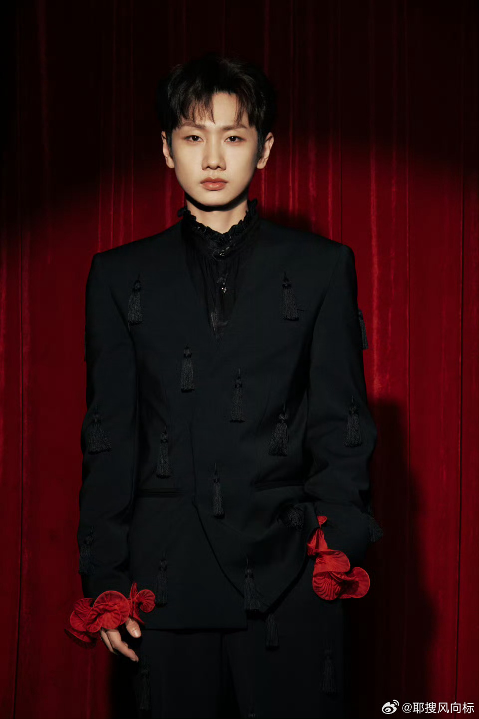 汪苏泷好六夜造型汪苏泷疯狂好六夜一袭黑西装搭配红色花朵装饰,在红色幕布背景下尽显