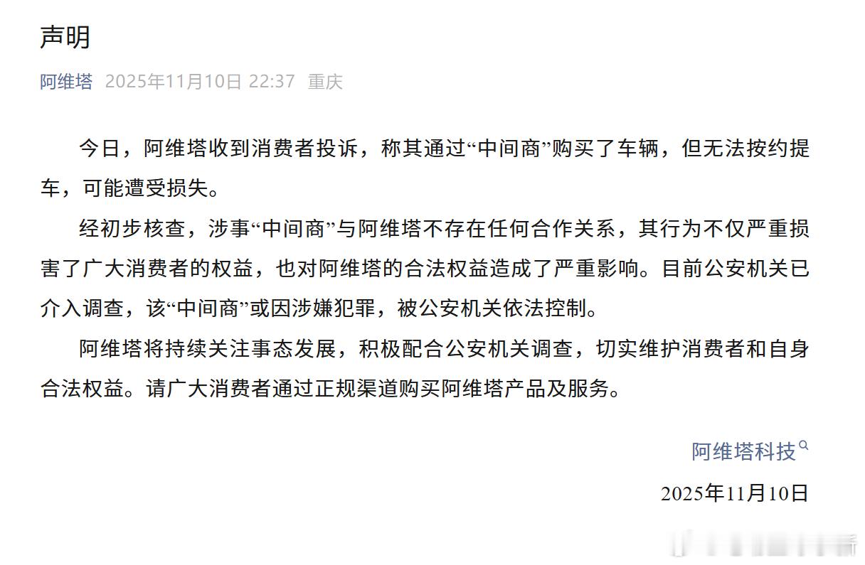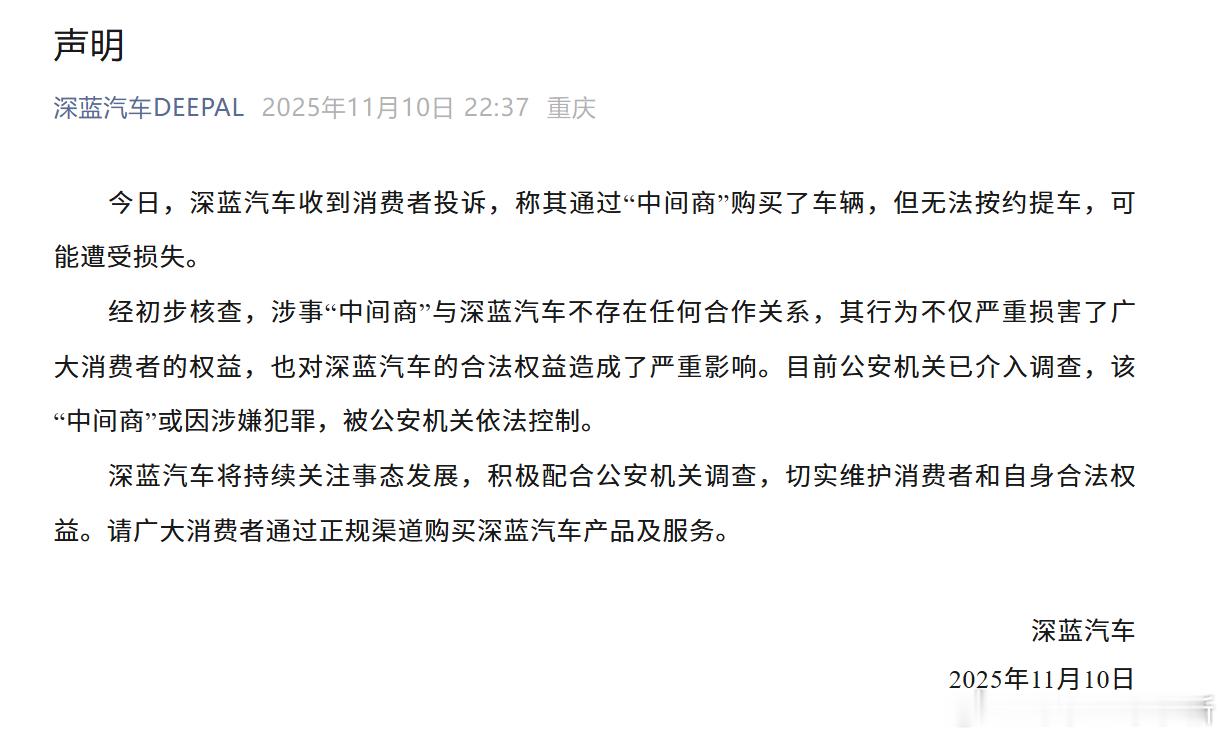深蓝汽车、阿维塔发布声明:涉事“中间商”与我们不存在任何合作关系