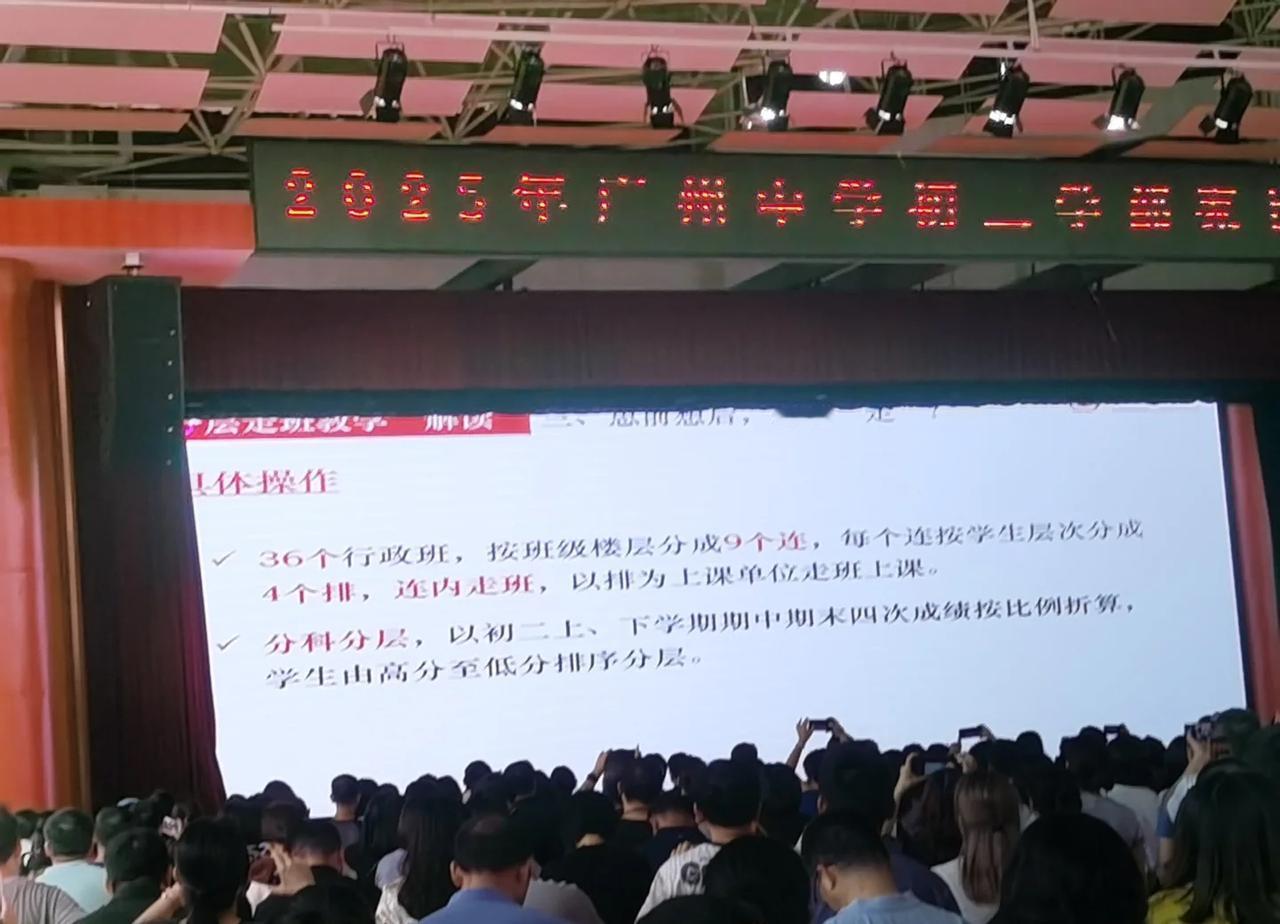 广州中学初三分层走班? 孩子自从上了初三,感觉作业明显多了起来,我们作为家长跟老师们一样进去了紧张的备战状态。 班主任换成了有丰富带中考班经验的老师,月考、单元测试不断,开学的家长会时候说,从初三开始部分科目进行分层走班教学,估计是同一届学生太多了,所以根据学习能力跟现有水平划分,这样才能更有针对性的安排教学内容,后续也会结合每轮月考的成绩做一定的升降班型的调整。 月考后又进行了一轮家长会,那叫一个折腾,先是在篮球体育场开了全年级大会,然后转到班级会议后,要根据走班的科目穿插着去参加各科老师的会议,每一科老师只有10分钟的分享时间,到时间马上就要结束,结束后老师赶去下一场,家长们也要赶紧去找下一科所在的分层走班的班级教室,希望下次安排能够更合理一点。 不过整体感觉广中的老师们还是很负责任的,老师们每天都会在群里分享作业完成情况等。中考对孩子来说是第一次真正意义的人生路口,现在基本都是自己管理时间跟各项作业安排,我们只能精神上支持了,加油!备战中考 家长 广州中学生 初三生 广州中学