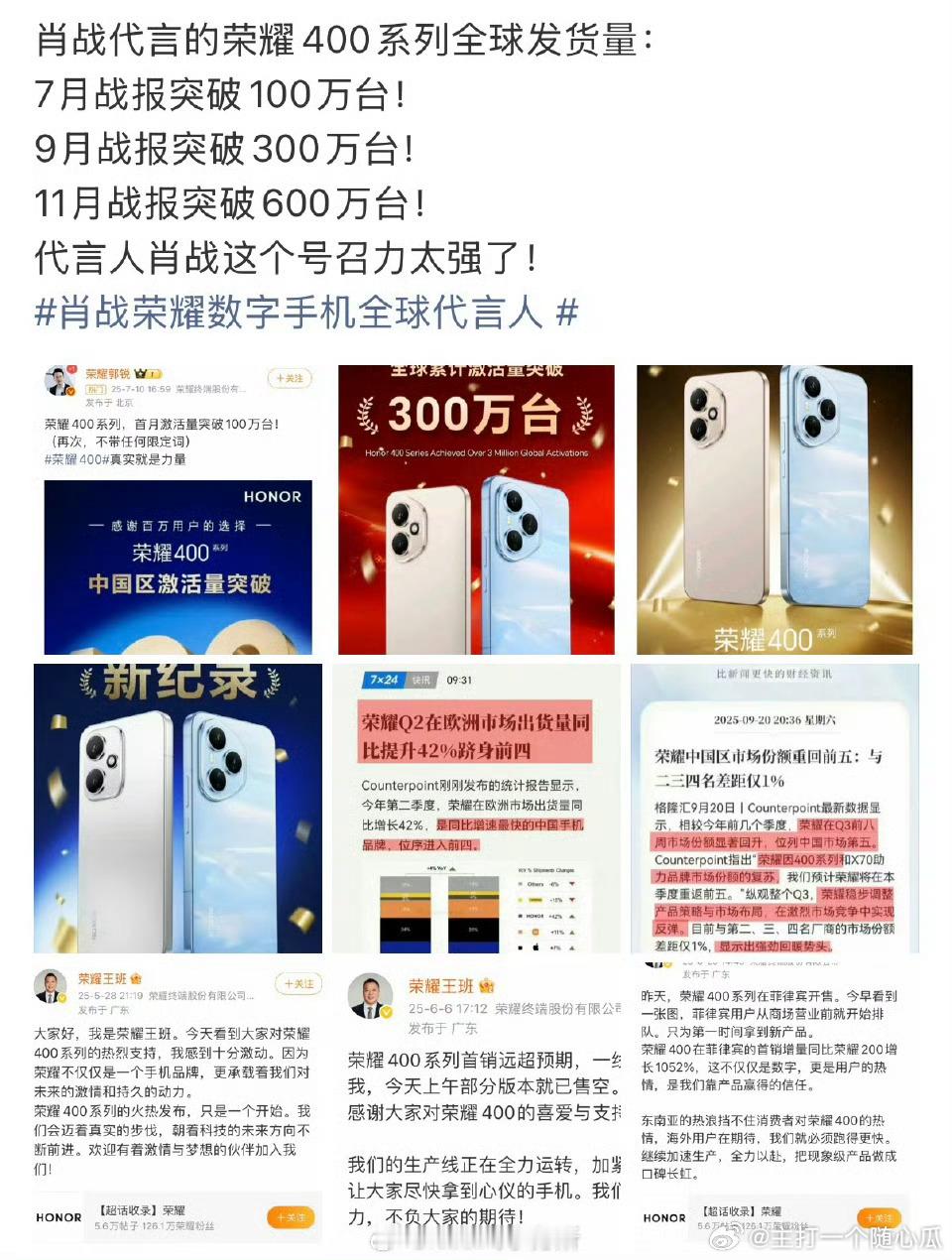 肖战代言荣耀400系列,全球发货量已经突破600万台了,太牛了这个号召力!500