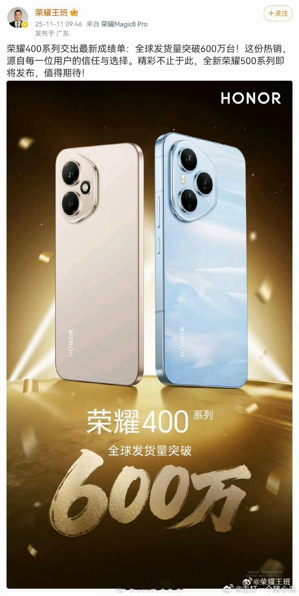 肖战代言荣耀400系列,全球发货量已经突破600万台了,太牛了这个号召力!500系列也马上来了