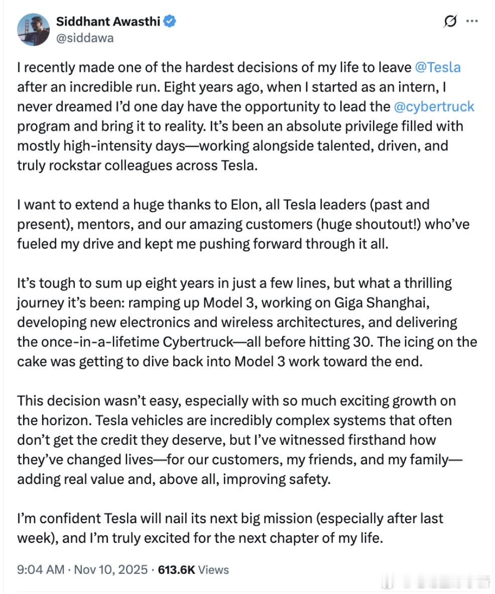 当地时间 11 月 9 日,Cybertruck 项目负责人悉达恩特・阿瓦什蒂宣布离职,结束 8 年特斯拉生涯,他一路从实习生成长,主导 Cybertruck 从研发到量产。