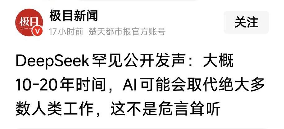 是不是代表人类趟着就有钱赚?DeepSeek罕见公开发声:大概10-20年时间,AI可能会取代绝大多数人类工作,这不是危言耸听!它还画了AI发展的三条时间线。未来3到5年是“蜜月期”,AI得靠人带着,像设计师、程序员用它还能提高效率。但5到10年就进入“风险期”,AI开始抢饭碗,失业风险升高。10到20年,AI可能把剩下工作都包了,社会秩序都受挑战。 哪些工作易被替代呢?像流水线工人、基础会计这类重复性高的工作,很可能是AI最先“吃掉”的。而有创造性的工作,比如顶尖战略顾问、艺术家,AI短期内难超越。大家得给自己的工作打打分,别躺平,打造核心竞争力。