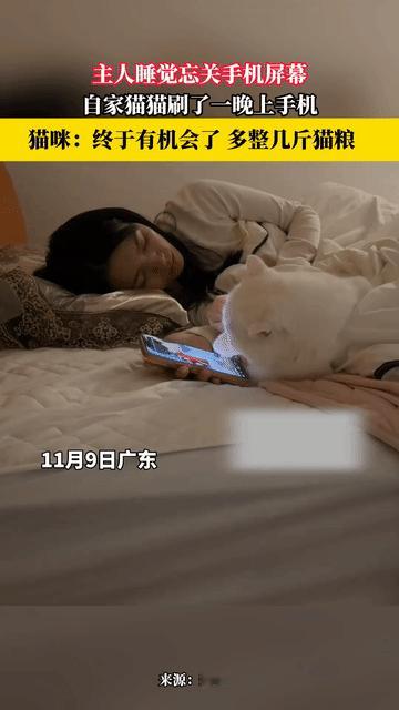 广东一女子睡前躺在床刷手机,结果睡着了,她把手机攥在手里,充电器也没插,猫当时在旁边,看到亮着的屏幕一直动,就用爪子不停戳屏幕,监控显示猫划拉手机到天亮,电池耗光电死机。 网上有人说猫根本不会主动刷手机,怀疑是人设局,也有人说猫可能是被屏幕光点吸引,或者想用爪子标记气味。 专家说猫对快速移动的东西敏感,屏幕画面会让猫以为是猎物,手机屏幕被猫爪戳坏的概率挺高,建议睡前别让宠物靠近电子产品。 《图片来源于网络》