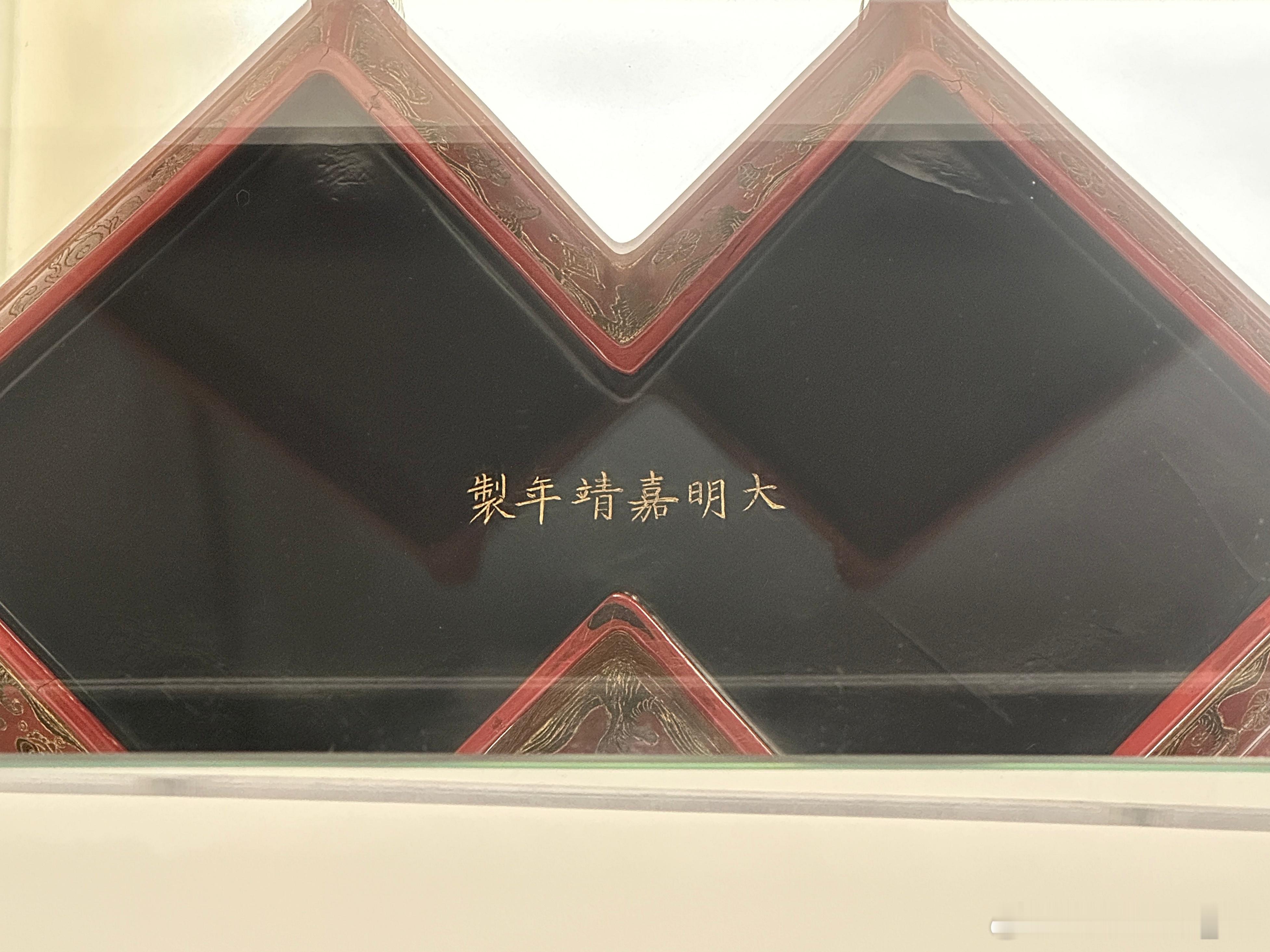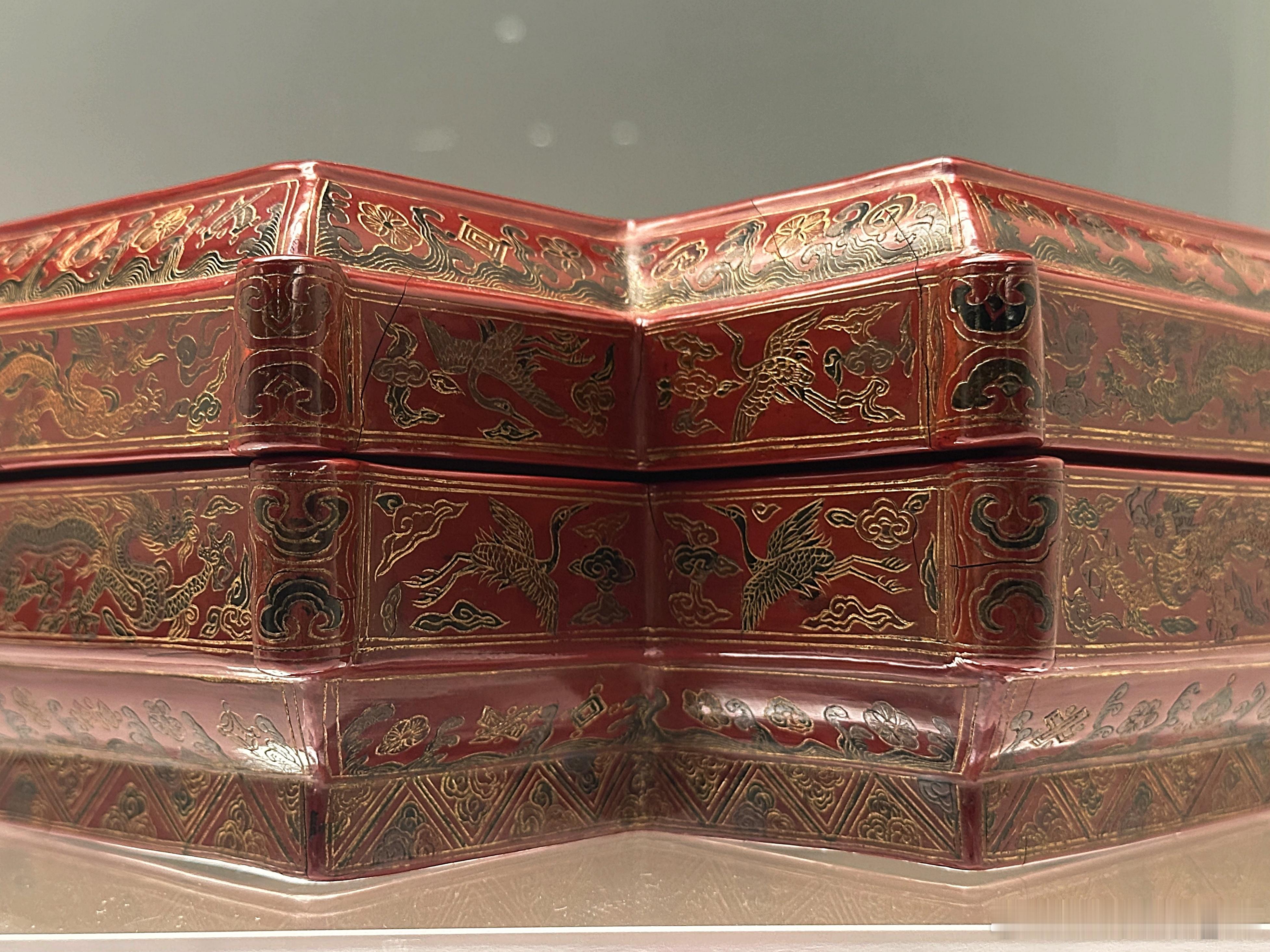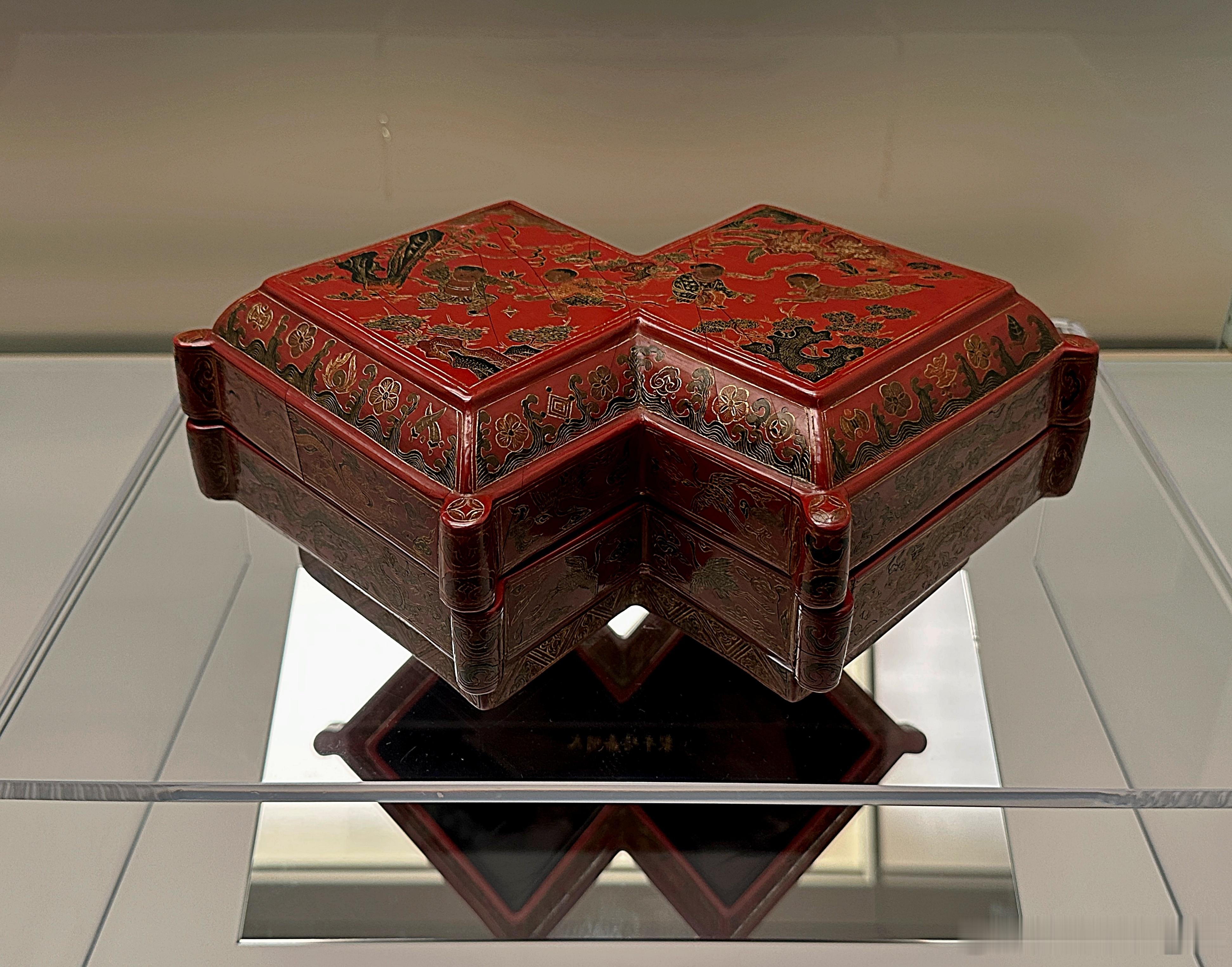 木胎,方胜形(六角带圆脊)盒,随形圈足。通体髹朱漆为地,雕填彩漆并施戗金纹饰。盖面左右各饰二童子嬉戏图。盖边与盒身近足处饰杂宝纹,上下止口饰云龙、仙鹤等纹饰。底髹黑漆,中部刀刻填金“大明嘉靖年制”楷体横行款。 此器造型吉祥新颖,填漆饱满,做工精良,为嘉靖朝漆器新造型。