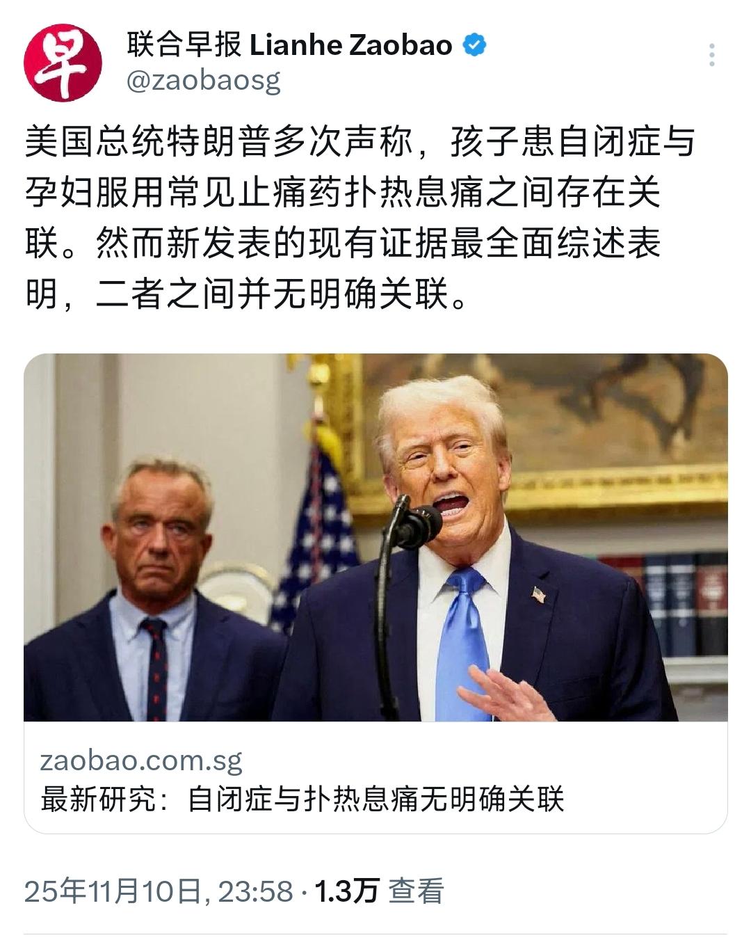 外媒11月10日报道:“美国总统特朗普多次声称,孩子患自闭症与孕妇服用常见止痛药扑热息痛之间存在关联。然而新发表的现有证据最全面综述表明,二者之间并无明确关联。” 特朗普的“医学言论”其实早有前科。他在上次任时期就曾多次发表过缺乏科学依据的健康建议,从新冠病毒的防护方法到疫苗的安全性,再到这次关于扑热息痛的说法。 都引发了不少医学界的质疑和辟谣。问题的关键不在于他是不是医生,而在于他是美国总统,他说什么都有一大堆人信。 他只需要发推、开个发布会,说一句话就有无数人点赞转发,而真正搞科研的专家却得辛辛苦苦做实验、写论文、通过同行评审,才能让一句话被公众听见。 这种信息传播的不对等,让本该属于专业领域的话题被带上了不少情绪和误解。这次关于扑热息痛的争议,其实已经不是第一次被炒起来了。 早在几年前,就有一些研究指出孕期使用扑热息痛可能与儿童某些神经发育问题有关,但这些研究本身方法有限,样本选择也有偏差,结论并不一致。 科学讲究的是证据的积累和验证,不能一看到某个研究结果就下定论。因此,最新这项系统综述的意义就在于,它不是只看一两篇论文。 而是把现有的几十项研究综合分析,得出的结论更加全面也更有说服力。结果很清楚:目前没有足够证据支持孕妇吃扑热息痛会导致孩子患自闭症。 科学家并没有说“绝对安全”或者“绝对无害”,但至少说明目前我们不该对这种药物产生不必要的恐慌。其实说到底,这类争议的背后是公众对健康问题的焦虑,以及对信息来源的不信任。 尤其是在社交媒体时代,谁声音大谁就容易被当成权威。特朗普作为一个极具话题性的公众人物,他的每句话都带着流量体质。 可惜的是,医学不是靠流量做决定的。你不能因为一个人发了个带感的推文,就开始拒绝医生开的药方。这就像之前他鼓吹某些未经验证的“神药”治新冠,结果不少人真信了,后果不堪设想。 值得注意的是,这种现象其实不仅仅发生在美国。在全球范围内,尤其是在疫情之后,公众对于医学信息的辨别能力成了一个不得不面对的现实问题。 不管是扑热息痛还是疫苗,很多时候我们看到的不是科学本身,而是被包装后的情绪和立场。而科学的节奏往往很慢,它需要时间、实证、反复论证,而不是谁喊得响就算谁对。 医学专家们不能靠喊口号,他们要写报告、做实验、提交给期刊、通过同行评审,还要接受公众的检验。相比之下,公众人物说一句话,只要够耸动,就能引发一波舆论地震。 这也让我们反思一个更深层次的问题,那就是公共领域里专家话语权的弱化。当专业知识不再被尊重,而是被流量和情绪左右,那我们该如何判断什么才是真正值得信赖的信息? 尤其是在涉及孕妇和儿童健康这种高度敏感的议题上,更不能被非专业人士带节奏。这一点,国内媒体和专业机构其实做得越来越好了。 比如中国疾控中心就经常通过官方渠道发布权威科普,药品监管部门对常用药物的安全性也有严格评估。这种机制本身就是在给公众一个可靠的参考。 再回头看特朗普的这番言论,其实本质上不是他一个人的问题,而是一个时代背景下的信息乱象缩影。当一个总统可以随意发言影响数百万人的健康观念。 而科学家却要在实验室里默默奋斗十几年才能让一句话被听见,这本身就值得我们警惕。科学不是不能质疑,但质疑必须建立在证据之上,不是靠凭空想象和个人直觉。 这次关于扑热息痛的结论虽然给公众吃了一颗“定心丸”,但也提醒我们,面对健康话题,听谁的比说什么更重要。 不是所有话都有同样的分量,更不是谁粉丝多谁就说得对。在这个信息爆炸的时代,保持一点理性和判断力,可能比什么都重要。
