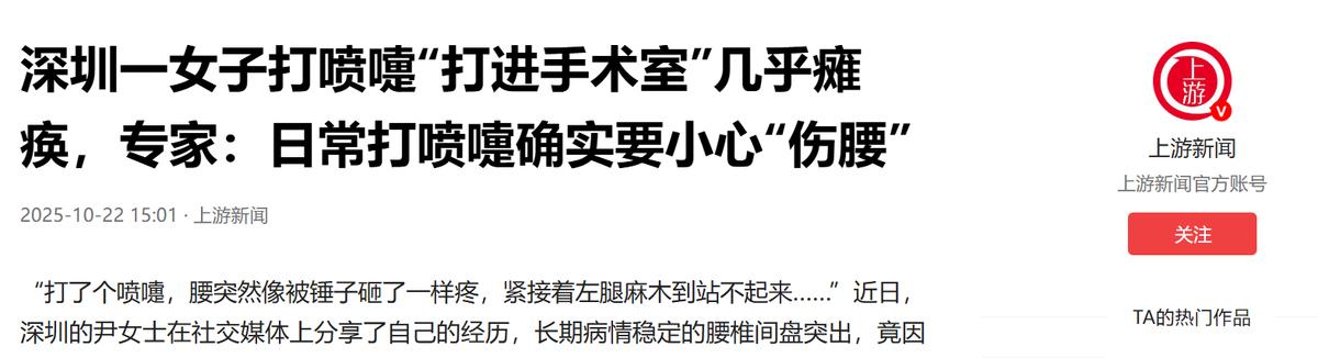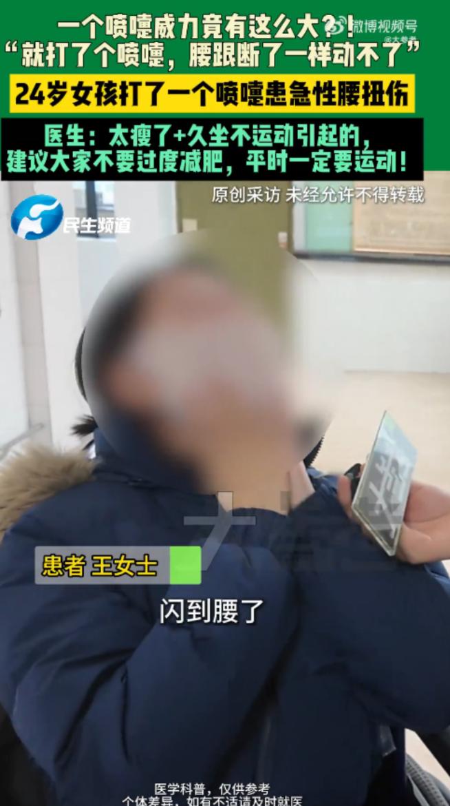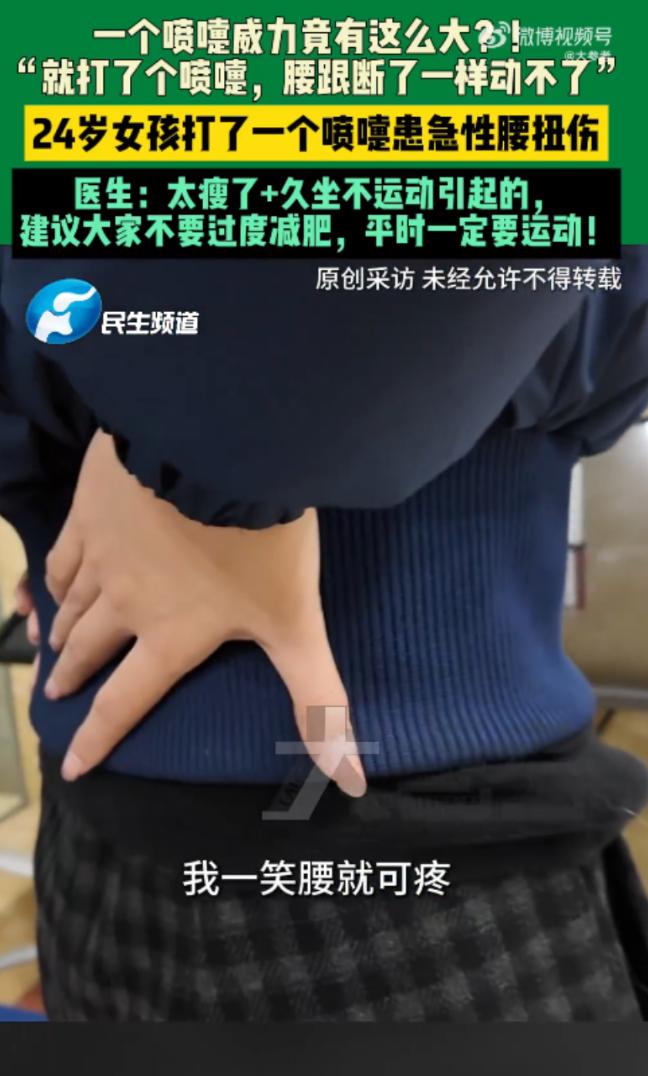 “悲剧还是发生了!”11月7日,河南郑州,一女子打了个喷嚏,随后腰部传来“咔嚓”一声脆响,接着整个人跪在了地上,怎么起都起不来!送往医院后经检查,女子这是急性腰扭伤,主要还是因为她太瘦了。网友:又有不减肥的理由了。 最近郑州朋友圈里都在聊一件挺有意思又让人揪心的事,一个再日常不过的喷嚏,居然把人给 “撂倒” 了,说出来谁都觉得不可思议,但这事还真就发生在咱们身边,全是普通人的真实遭遇,想想都挺感慨的。 11 月 7 日那天郑州已经透着冬天的凉意了,尤其是到了傍晚,风一吹就冻得人缩脖子,24 岁的王女士下班回家,可能是路上着凉了,到家没多久就觉得鼻子发痒,忍不住打了个喷嚏。 谁能想到就是这么一个再平常不过的动作,“咔嚓” 一声脆响突然从腰部传来,那一下疼得她直接跪倒在地上,眼泪都差点飙出来试着撑着地起身,可腰上像断了似的,怎么使劲都站不起来。 家里人赶紧过来扶她,看着她疼得直咧嘴也不敢随便挪动,立马打了 120,把她送到了附近的医院,医生检查完说这是急性腰扭伤,而且情况还不算轻,追问之下才知道王女士平时特别爱美,一直执着于减肥,一米七的个子,体重才刚过 100 斤,属于典型的 “纸片人” 身材。 医生说她这腰伤看着是喷嚏引发的,其实根源还是太瘦了,身上没多少脂肪缓冲冲击力,核心肌群也薄弱得很,打喷嚏时腹腔压力突然增大,脊椎没了足够的保护,一下就扛不住了。 这事传到网上后网友们都炸开了锅,好多人开玩笑说 “这下好了,又有不减肥的理由了”,还有郑州本地的网友调侃 “早说嘛,咱郑州的胡辣汤、烩面多香啊,吃饱了才有力气护腰”,当然也有人认真说不是不让减肥,是别追求这种极端瘦健康才是真的好看。 其实不止郑州的王女士,深圳还有位 38 岁的尹女士,也因为一个喷嚏遭了罪,她之前就有腰椎间盘突出的老毛病,平时看着恢复得还行,还会偶尔去做些力量训练。 结果有天在医院,突然打了个喷嚏,当场就觉得腰部剧痛,后来检查发现,椎间盘被挤得突出了,还压迫到了神经差点就影响到走路。 说真的谁能想到打个喷嚏还能有这么大风险?咱们平时生活里,打喷嚏、咳嗽都是再正常不过的事,可偏偏就是这些小事,能看出身体的 “底子” 好不好,郑州的王女士是因为太瘦,没了天然的 “保护垫”,深圳的尹女士则是有旧伤,没注意养护,一个喷嚏就成了压垮骆驼的最后一根稻草。 不过也不用太恐慌,不是说打喷嚏就一定会伤腰,关键还是得给身体 “加固”,比如咱们感觉要打喷嚏的时候,别硬扛着下意识用手扶住腰,或者靠在墙上、椅子上,这样能分散不少冲击力,不至于让所有压力都集中在脊椎上。 要是像王女士那样偏瘦的朋友,也别一味追求体重秤上的数字,咱郑州人讲究实在,身体健康比啥都强,可以适当增点重,调到正常体重范围,再每周抽时间做做平板支撑、小燕飞这些简单的训练,把核心肌群练结实了,脊椎自然就有了 “肌肉铠甲”,要是有腰椎旧伤的,就别瞎折腾做高强度训练了,像游泳、温和的瑜伽这些运动就挺好,平时多注意保暖,别让腰受凉,真要是觉得不舒 服,别想着靠按摩缓解,赶紧去医院看看才靠谱。 现在想想王女士这事看着有点戏剧性,网友们的调侃也挺有意思,但背后其实是给咱们提了个醒,咱们天天忙工作、忙生活,总容易忽略身体的感受,要么拼命减肥追求骨感,要么仗着年轻瞎折腾身体,可身体这东西就像咱们郑州的老房子,得好好养护平时多注意一点,别等出了问题才后悔。 (信息来源:上游新闻——深圳一女子打喷嚏“打进手术室”几乎瘫痪,专家:日常打喷嚏确实要小心“伤腰”)