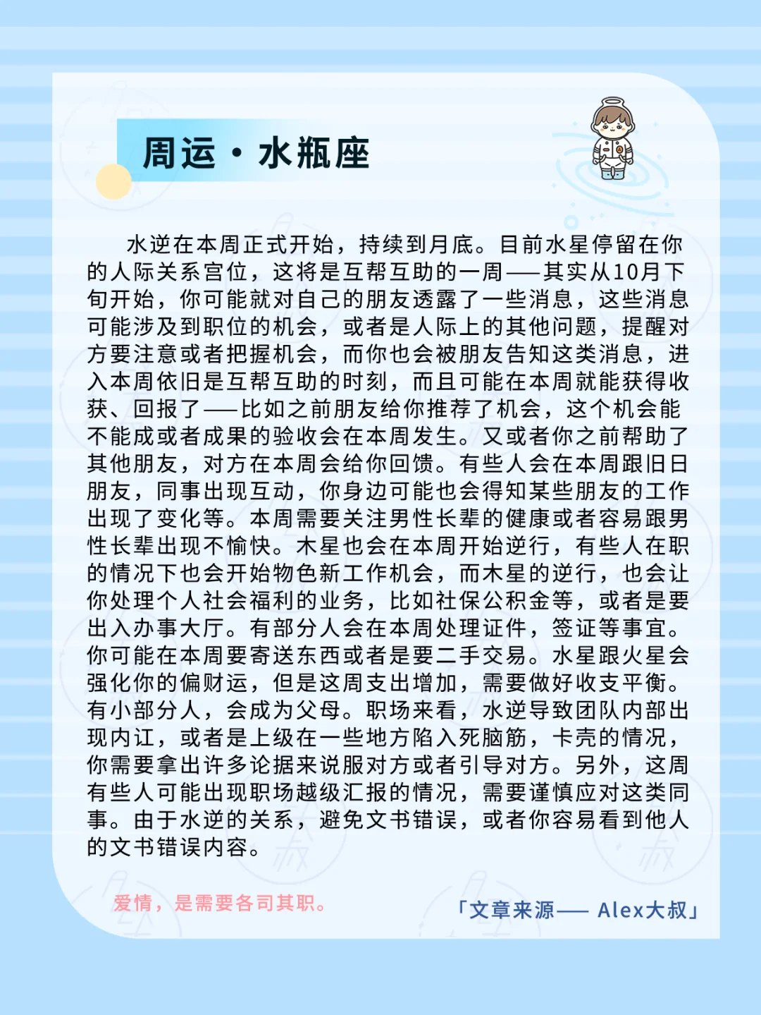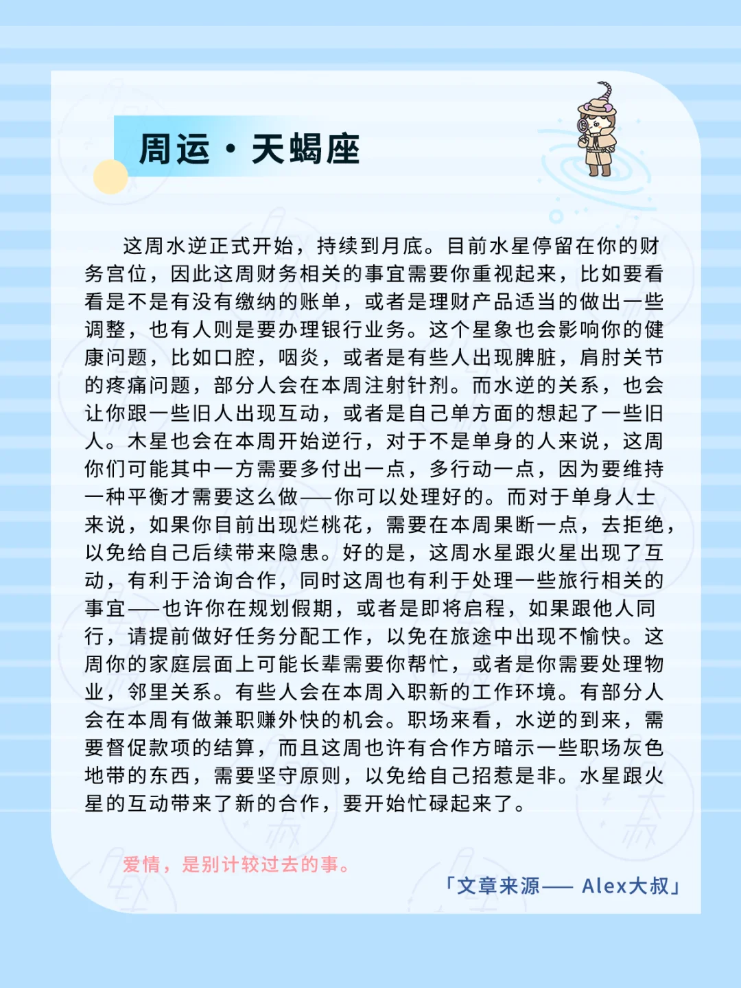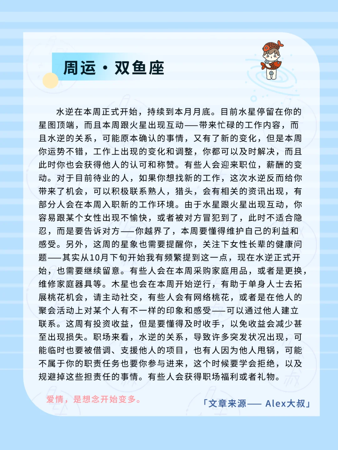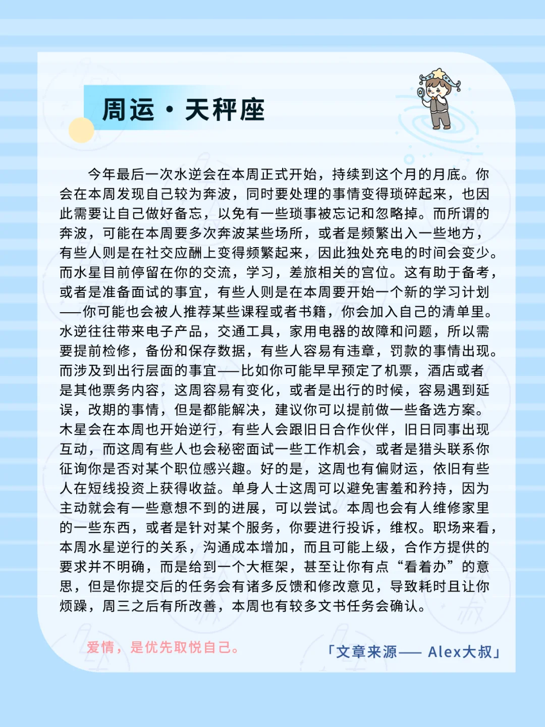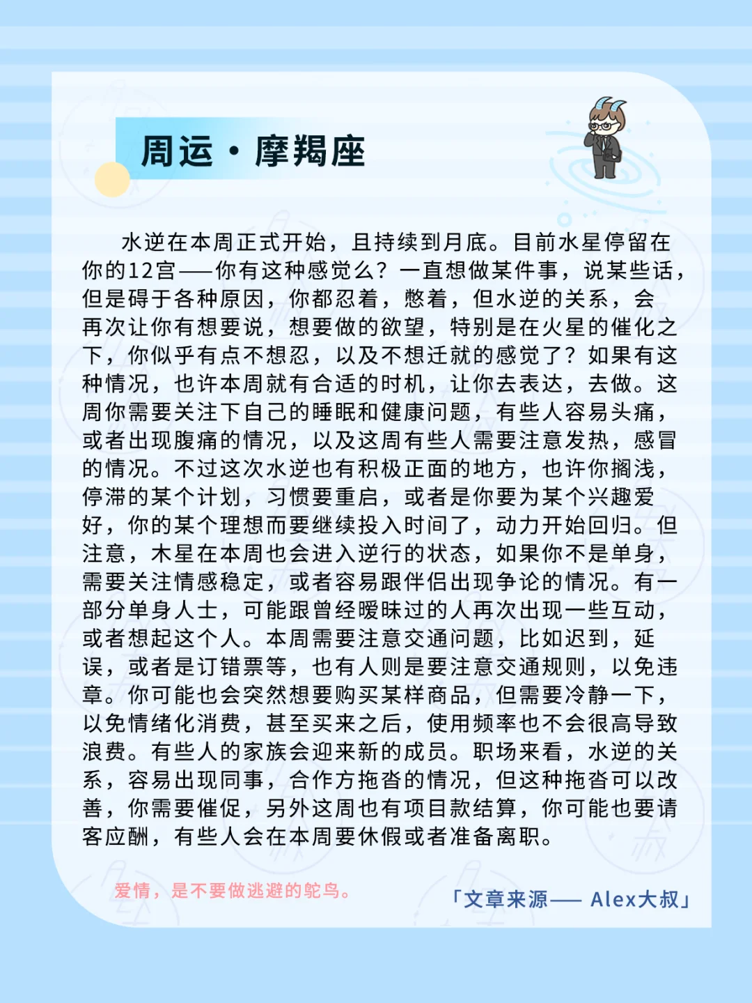 木星也会在本周进入逆行的状态——我们需要注意或者思考的是:那些能够给我们带来安全感的东西,现在还稳固吗,还能持续给我们带来力量吗?也许在木星逆行期间,可能需要我们进行一些脱敏的训练,因为逐渐发现,似乎一些让我们获得安全感的东西,正在慢慢松动,不稳定。而在木星逆行开始后,可能有不少人会想要重新规整自己的房屋格局,或者是要装修,搬迁等。另外,请你关注——你的家中,哪个空间最能给你带来治愈,放松,安全感呢?那么就需要留意这个空间,可能会有东西坏了,要维修,或者是要补充、更新,购买新的东西来增加,填补这个空间。