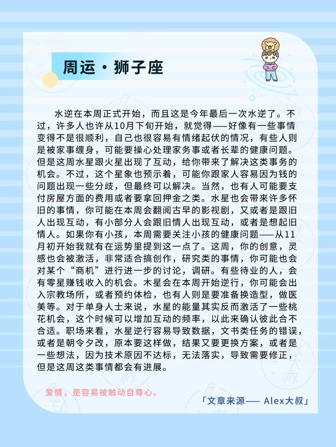 星体的逆行往往带来回溯过往的影响,而在10月下旬的时候,我们就已经进入到水逆开始前的阴影期,而这周水逆正式开始逆行,所以怀旧的氛围还会继续持续。这其中包括我们想起了往事,看到了以前对自己有纪念意义,价值的东西,又或者是频频开始想起旧人,或者跟旧人出现互动,有些人则是会想起旧情人或者是出现跟旧情人互动的情况。