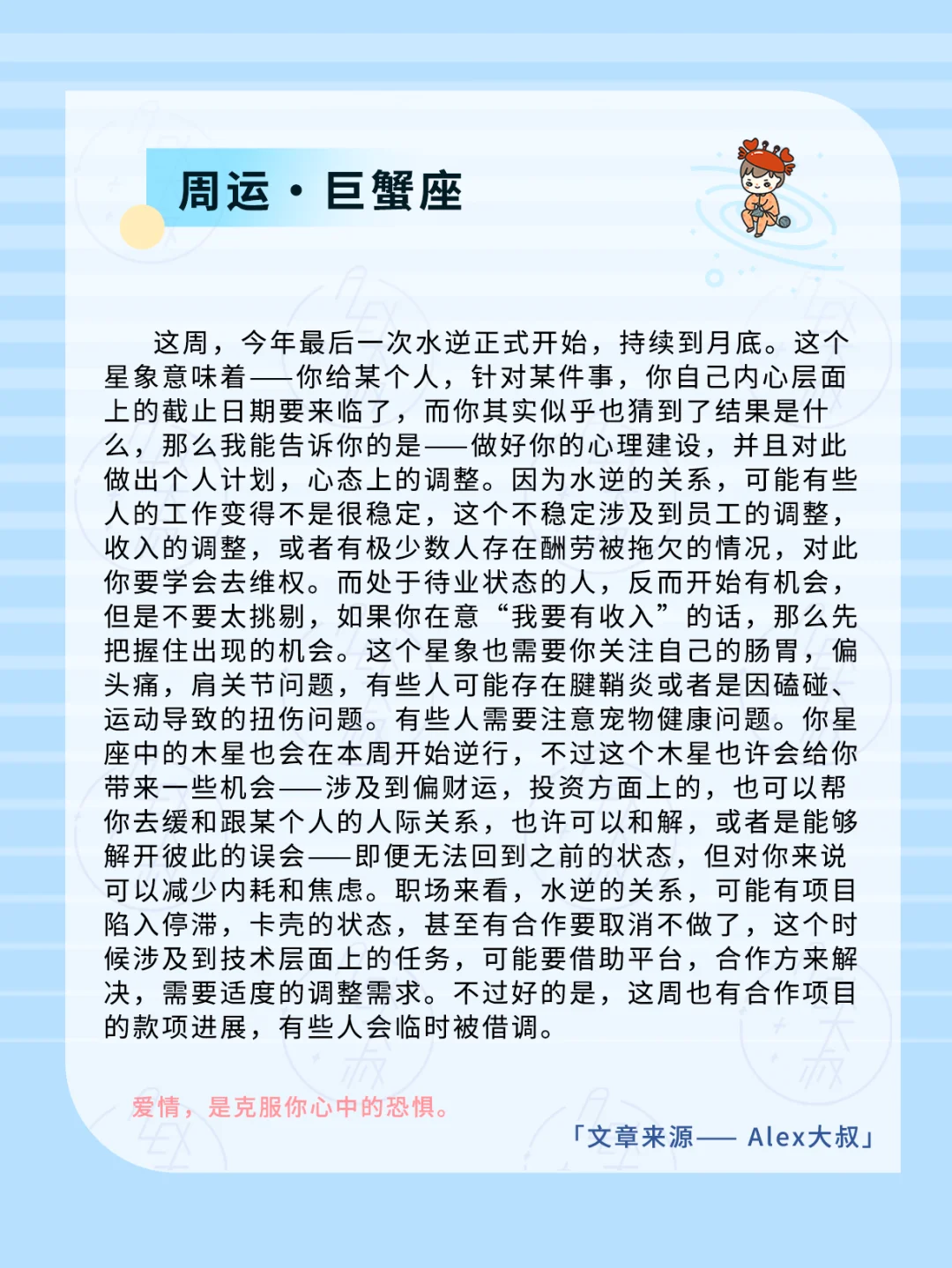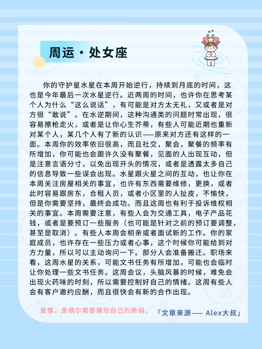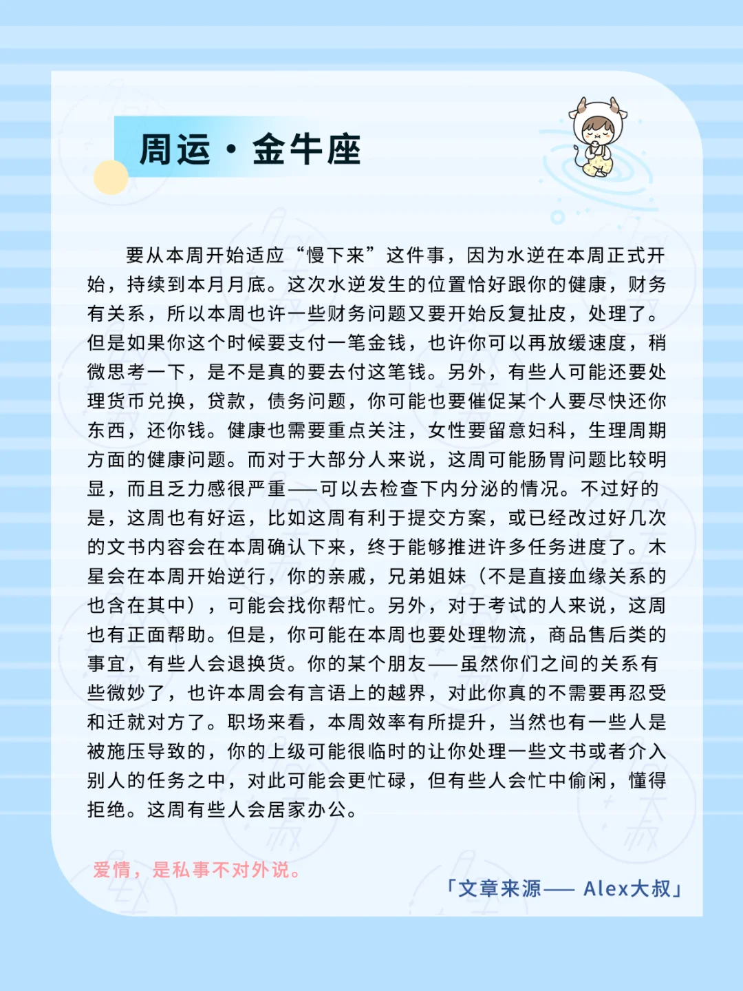 水星掌管着沟通,交流,而在水逆期间,沟通不畅这件事会显得格外明显,两方也容易出现矛盾,争论,配合本周的其他星象,你会觉得大家似乎都有火气,缺乏耐心。这也可能是因为我们高看,低估他人导致的。与此同时,这周开始到月底期间,发送信息,沟通方式上,请你留存证据,因为很可能出现许多变动,反悔的事情,必要时,可能这些证据会有助于你维权,摆脱连带责任等。