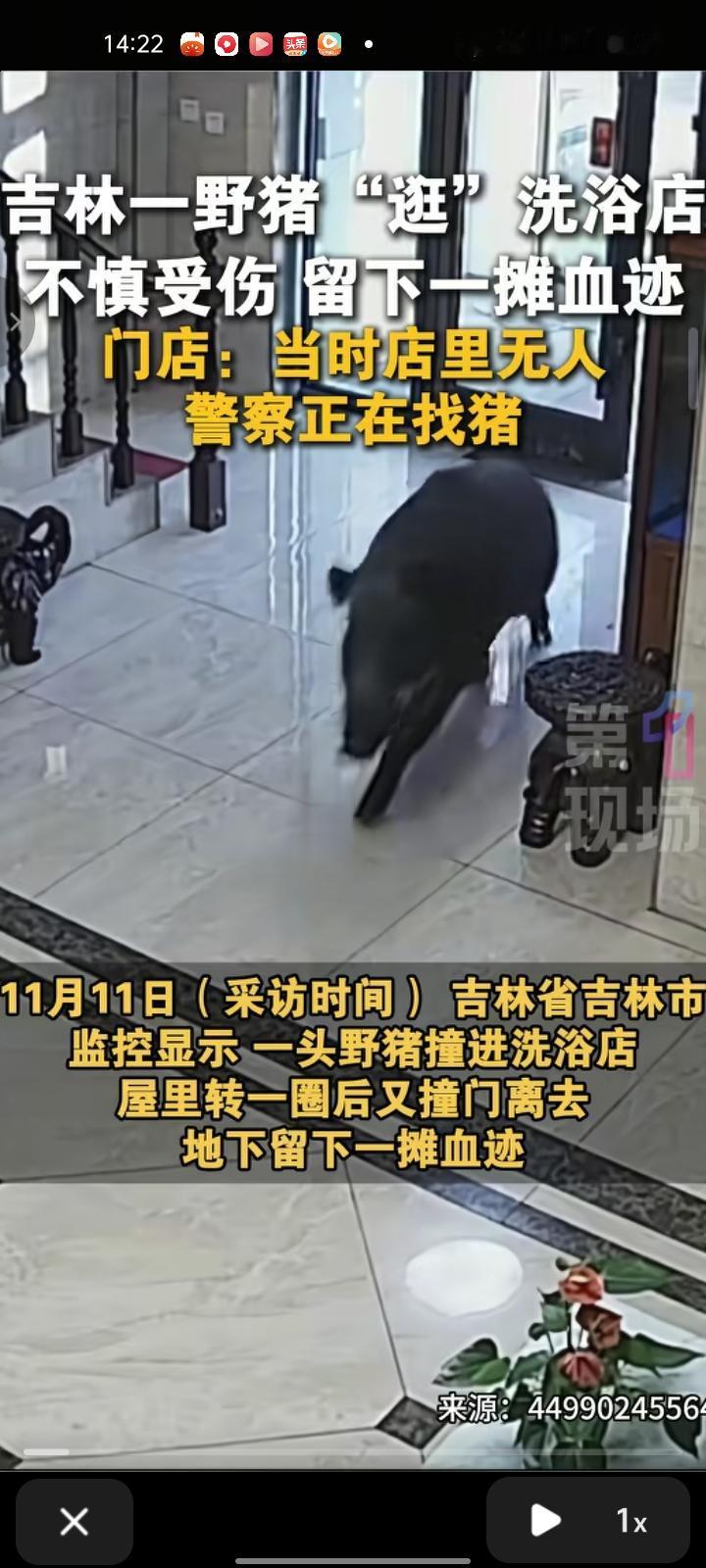 11月10日,吉林省吉林市。监控画面显示,一头野猪撞进洗浴店,屋里转一圈后又撞门离去,地上留下一摊血迹。野猪进洗浴店时店里没有人,地面的血应该是嘴巴撞坏了,目前警察在四处找野猪
