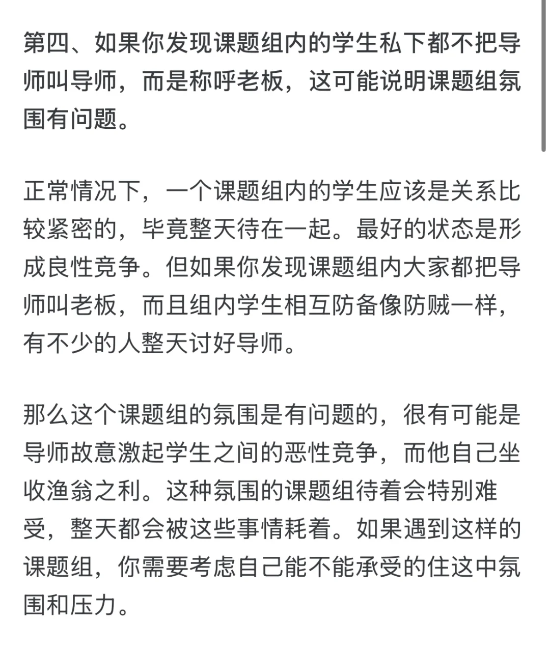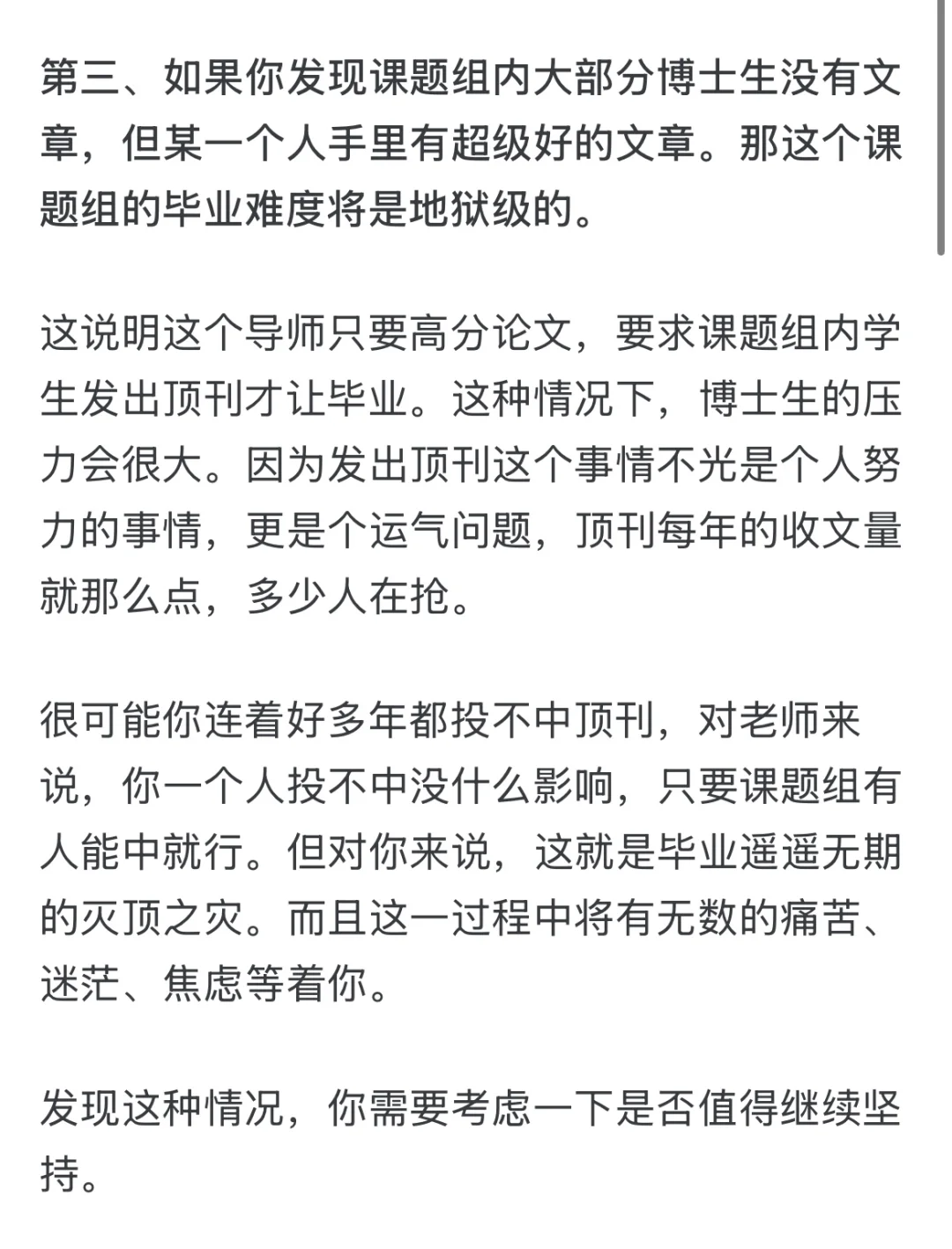 第一、如果组内有两个以上超过最长在读年限的老博士而且他们的小论文早已满足学校的毕业要求,说明存在导师过度压榨的可能性。我遇到过一个师姐,科研能力超级强,正常的四年学制内发表了远远超过学校毕业要求的小论文,而且大论文初稿早早都写好了。