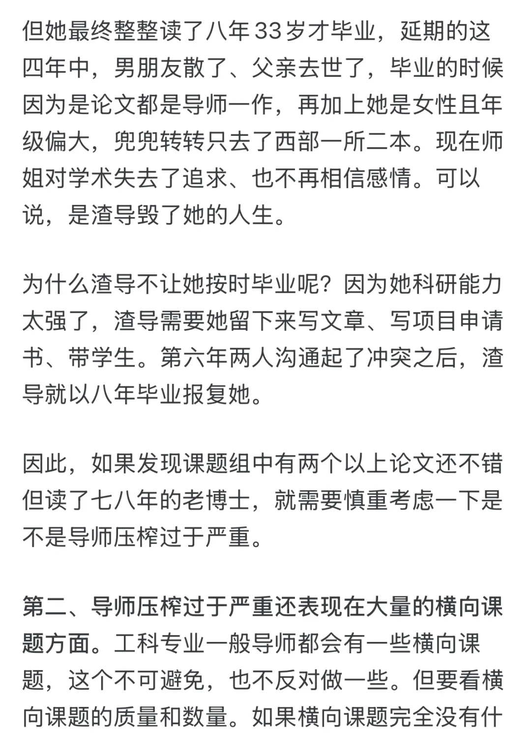 但她最终整整读了八年33岁才毕业,延期的这四年中,男朋友散了、父亲去世了,毕业的时候因为是论文都是导师一作,再加上她是女性且年级偏大,兜兜转转只去了西部一所二本。现在师姐对学术失去了追求、也不再相信感情。可以
