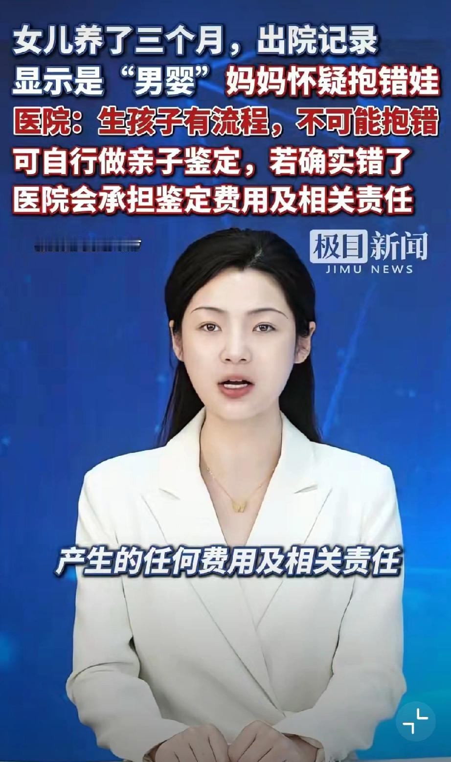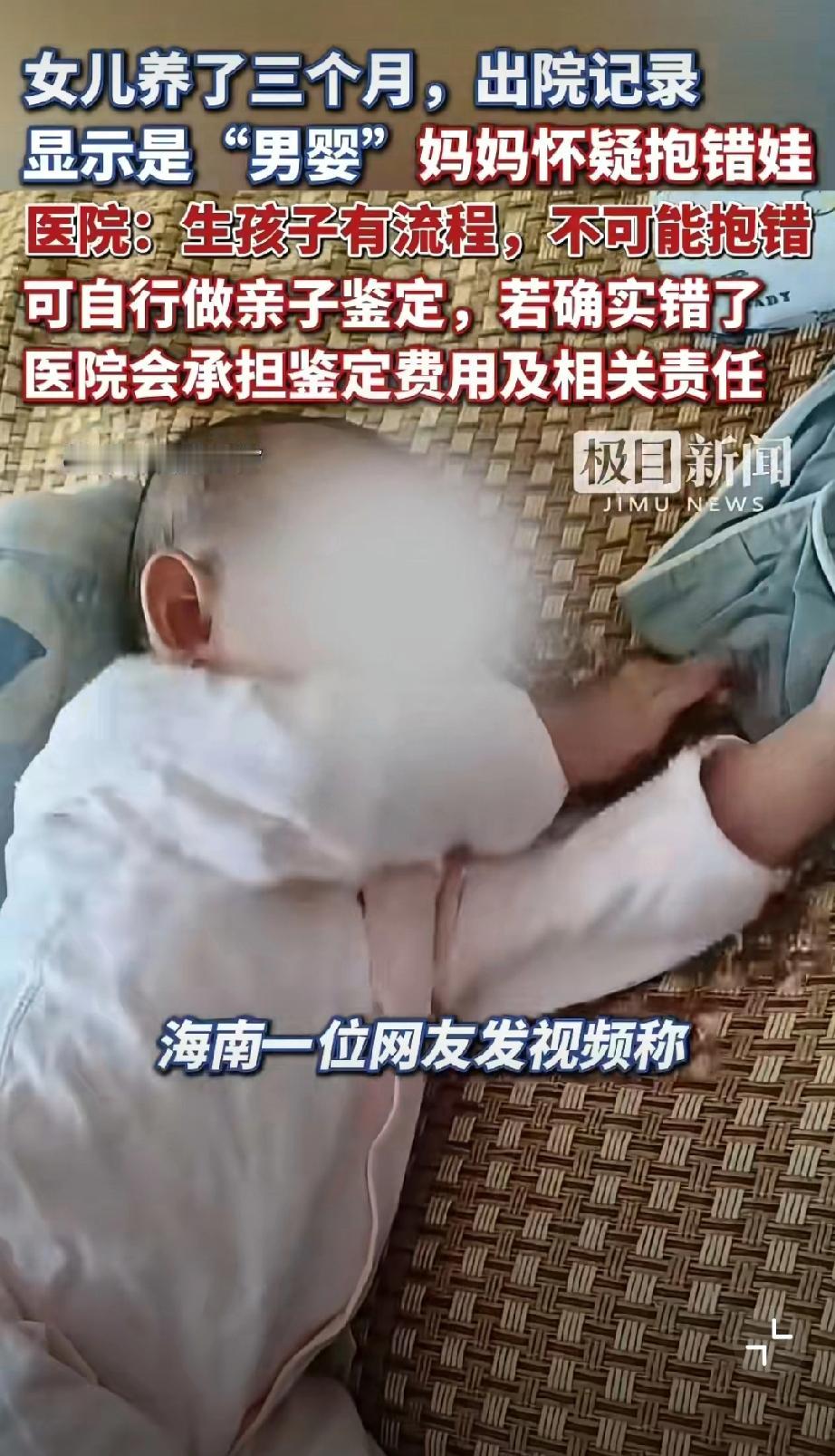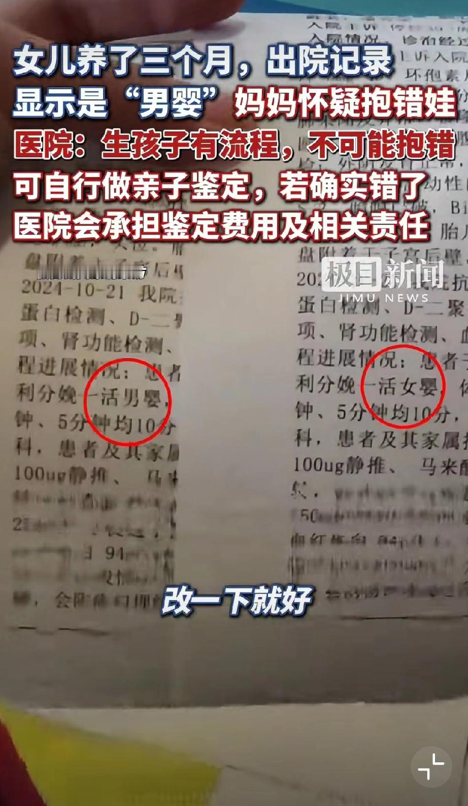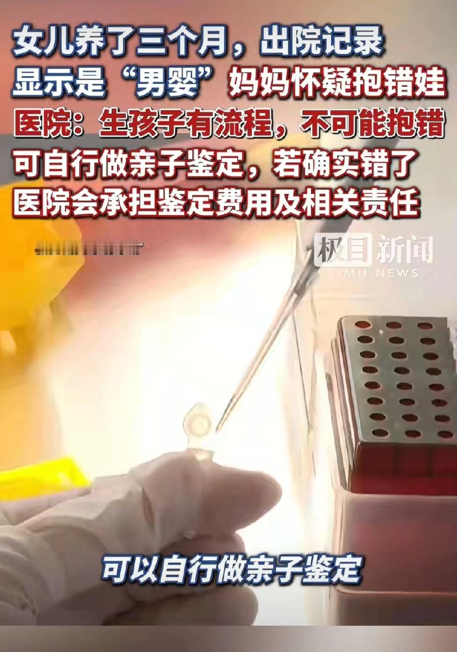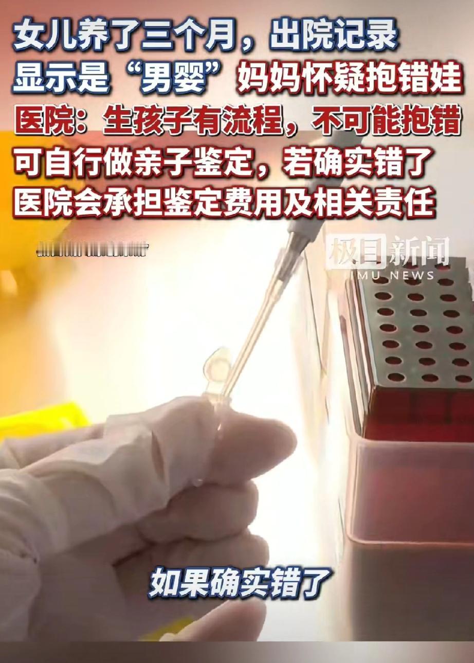 女儿养了3个月出院记录显示是男婴。 无关男女。但医生回应“只是打错了,改一下就好”;医院工作人员说,“可自行做亲子鉴定,如果确实错了,产生的费用及相关责任医院都会承担”显然有些轻飘飘了。虽然写错挺正常的,毕竟人非圣贤都会犯错。但家属有疑问也正常,医院这回应明显是不想承担因自身工作失误引发的后果。个人建议,假如真的要亲子鉴定,无论是否出错,这个DNA检测费应该医院承担。胎儿性别鉴别 孕期亲子鉴定 无创亲子鉴定