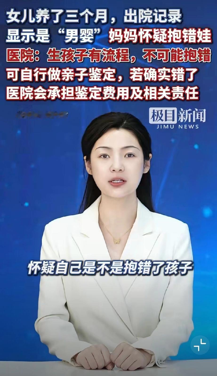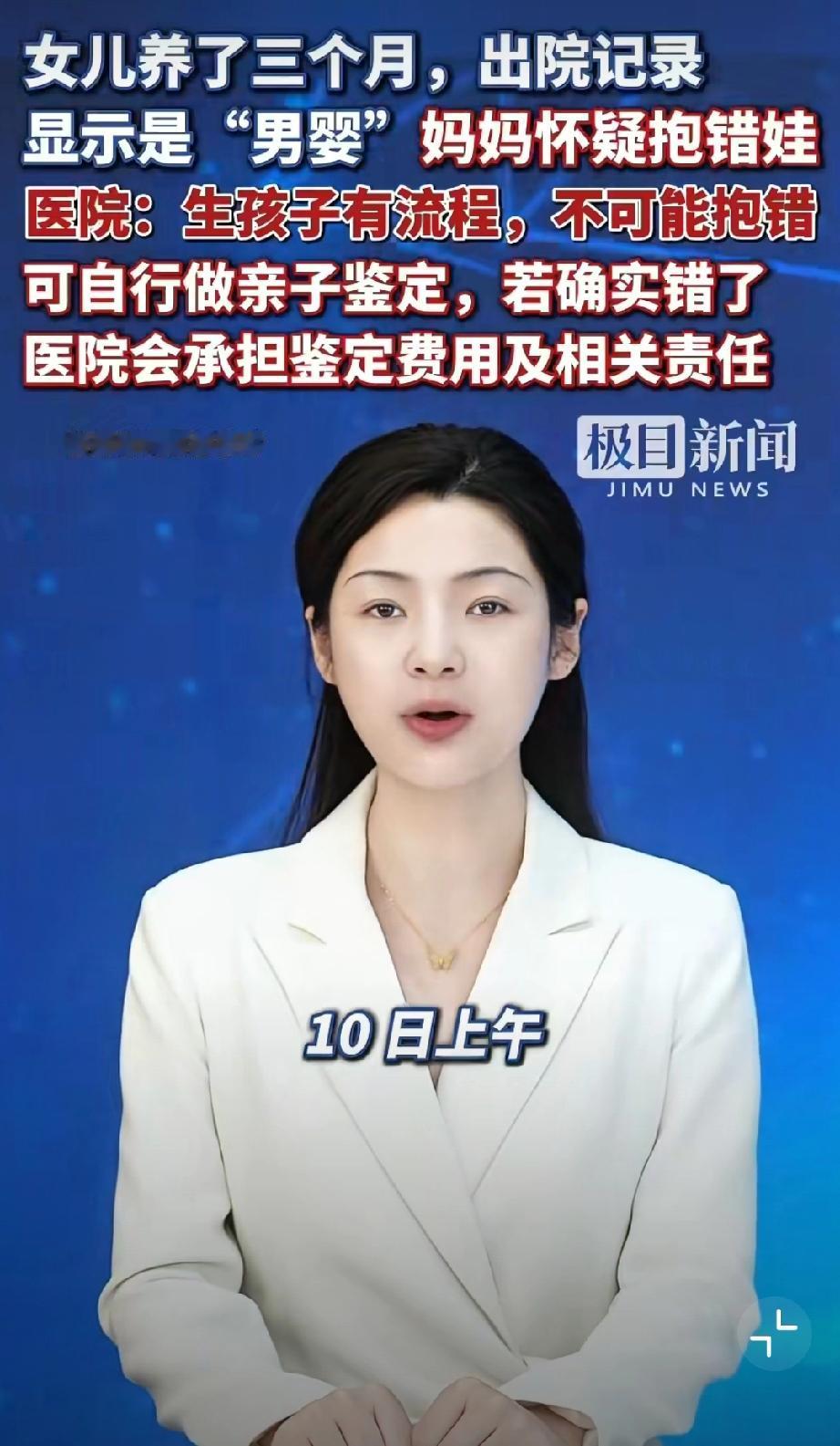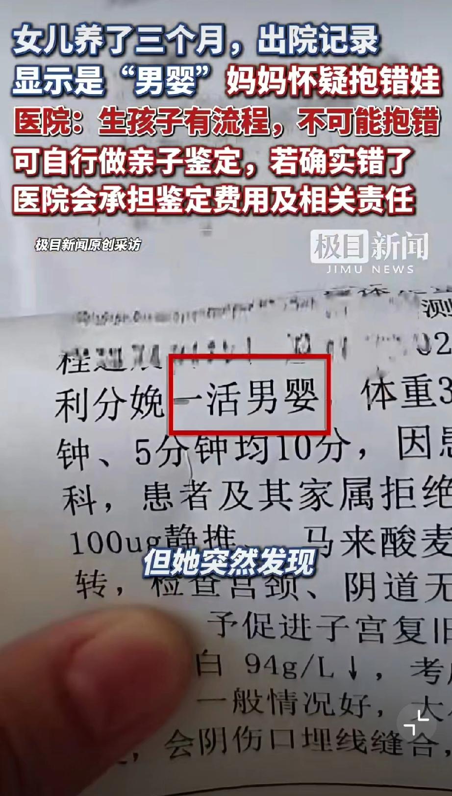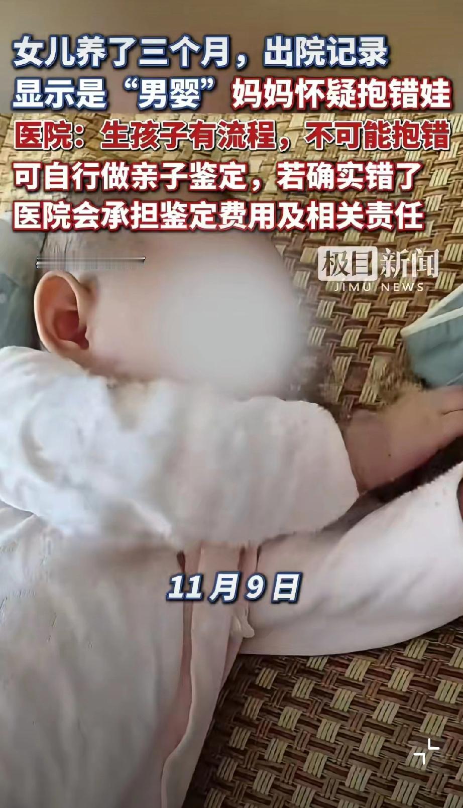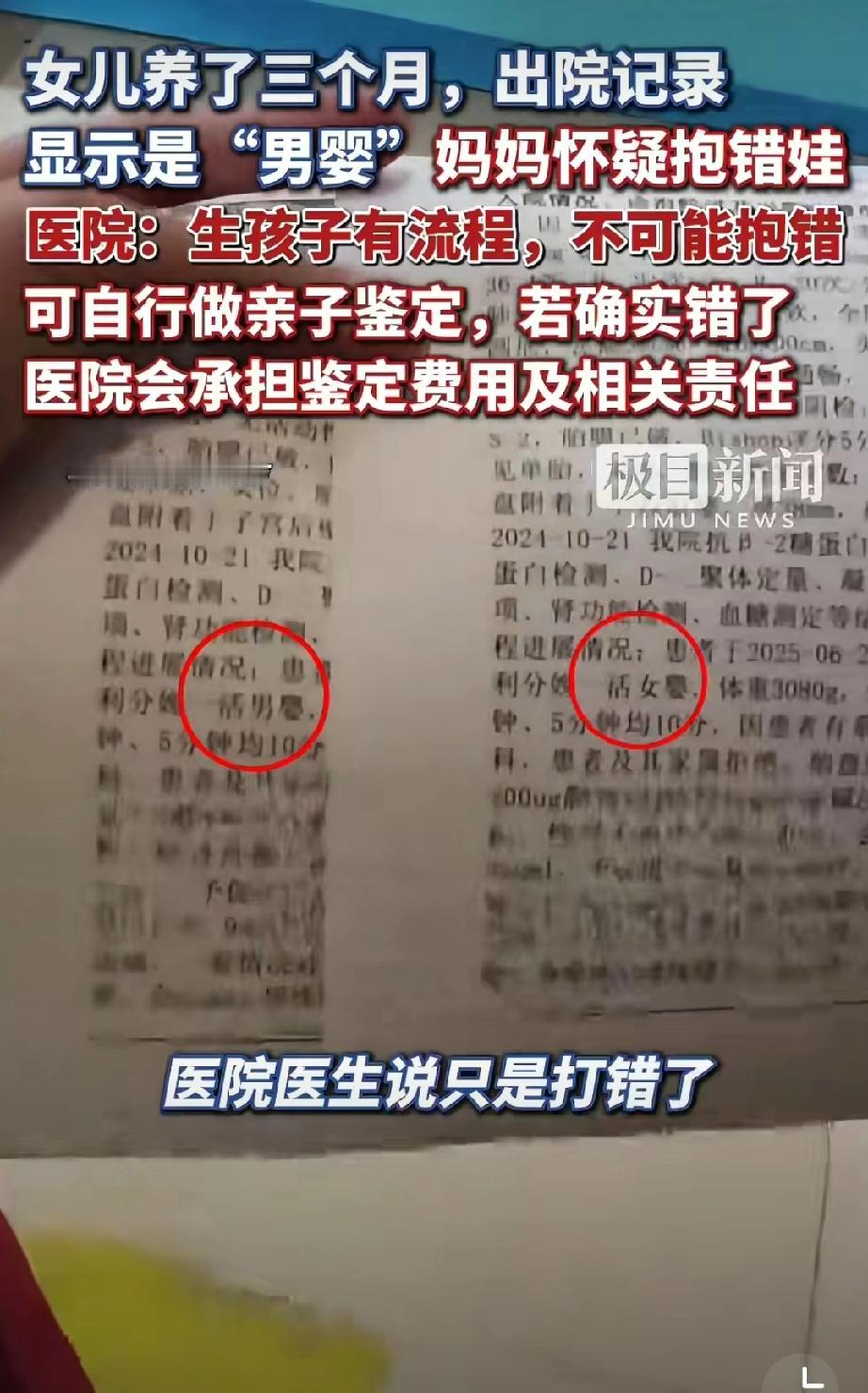女儿养了3个月出院记录显示是男婴。 无关男女。但医生回应“只是打错了,改一下就好”;医院工作人员说,“可自行做亲子鉴定,如果确实错了,产生的费用及相关责任医院都会承担”显然有些轻飘飘了。虽然写错挺正常的,毕竟人非圣贤都会犯错。但家属有疑问也正常,医院这回应明显是不想承担因自身工作失误引发的后果。个人建议,假如真的要亲子鉴定,无论是否出错,这个DNA检测费应该医院承担。胎儿性别鉴别 孕期亲子鉴定 无创亲子鉴定