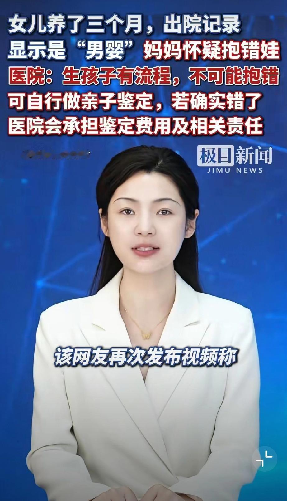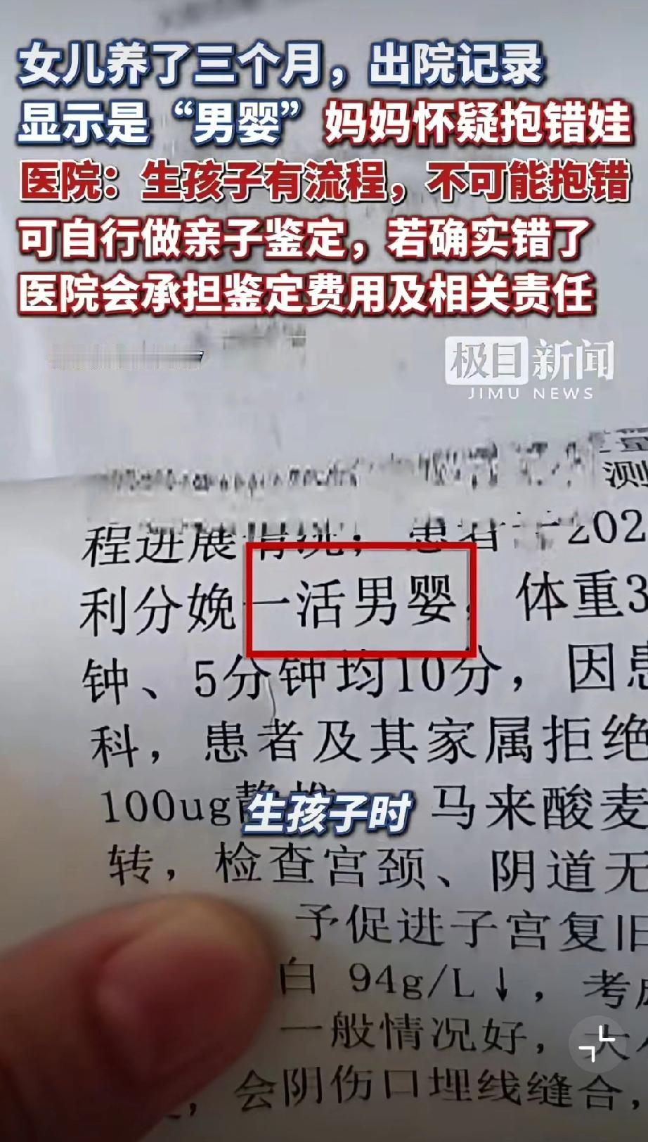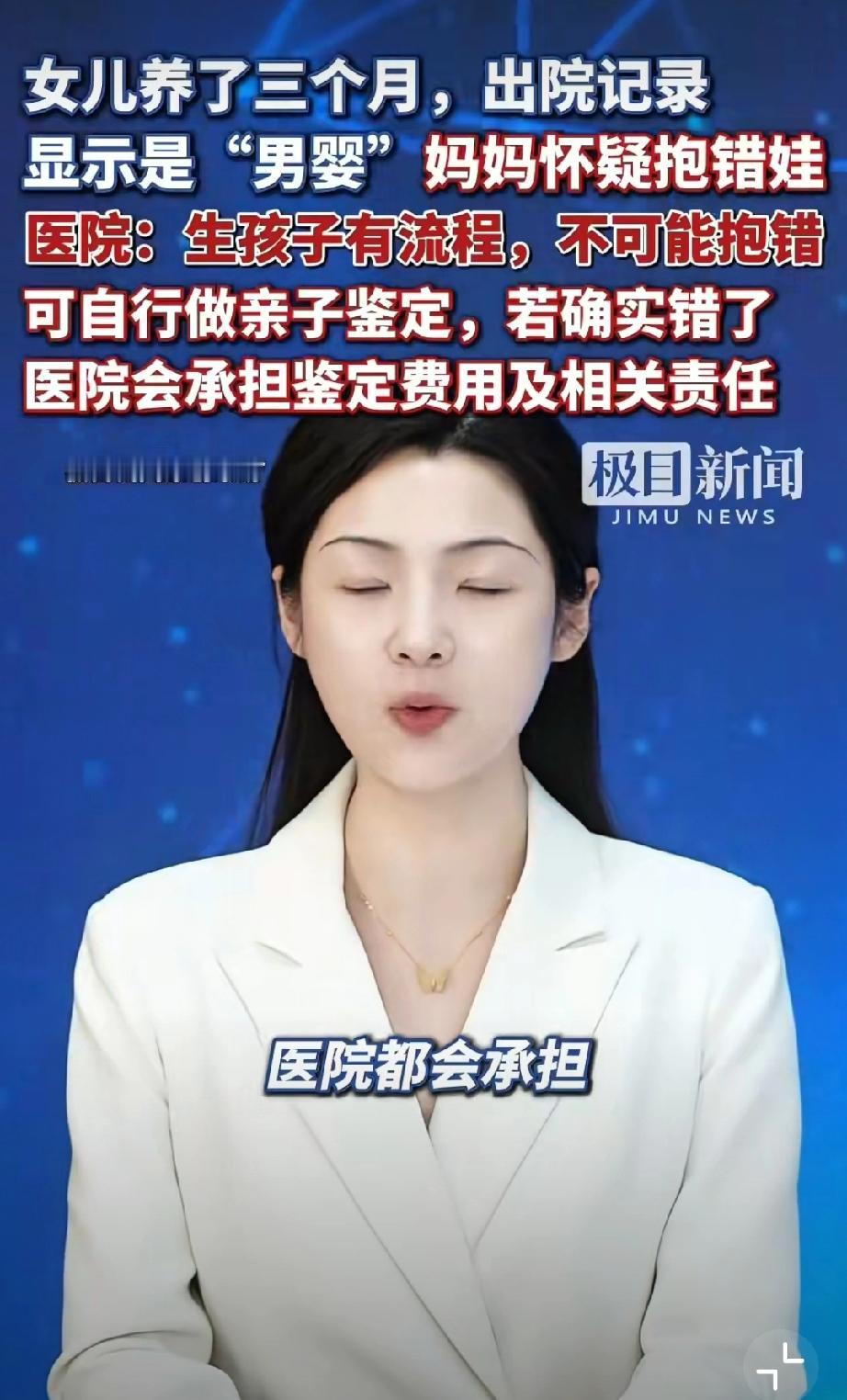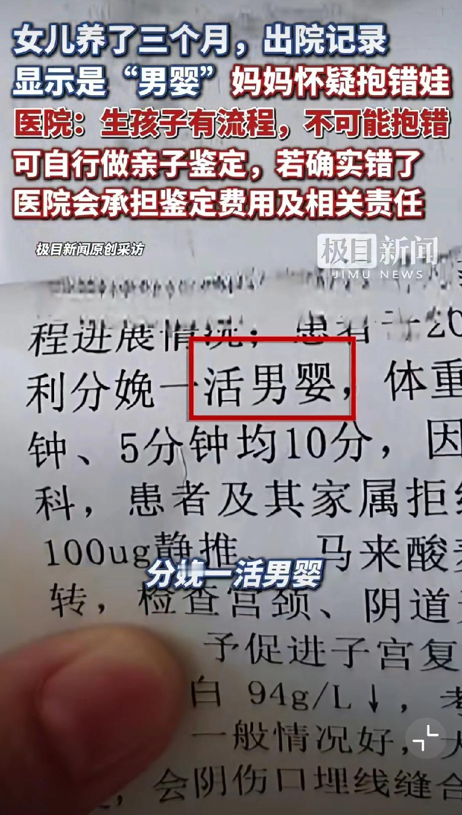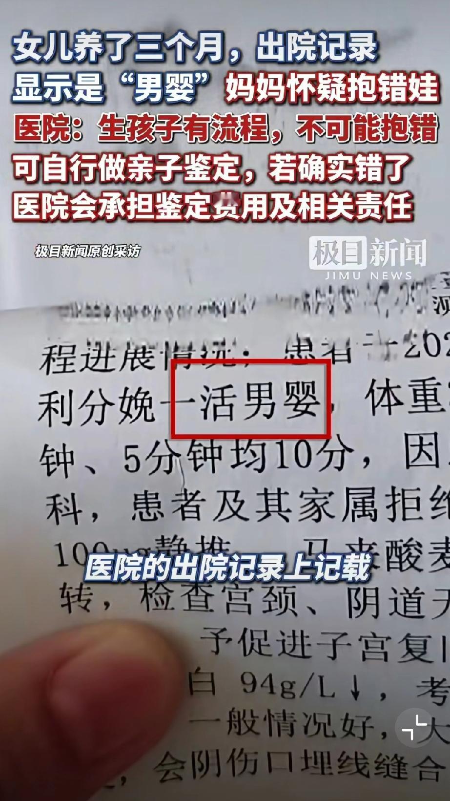 女儿养了3个月出院记录显示是男婴。 无关男女。但医生回应“只是打错了,改一下就好”;医院工作人员说,“可自行做亲子鉴定,如果确实错了,产生的费用及相关责任医院都会承担”显然有些轻飘飘了。虽然写错挺正常的,毕竟人非圣贤都会犯错。但家属有疑问也正常,医院这回应明显是不想承担因自身工作失误引发的后果。个人建议,假如真的要亲子鉴定,无论是否出错,这个DNA检测费应该医院承担。胎儿性别鉴别 孕期亲子鉴定 无创亲子鉴定