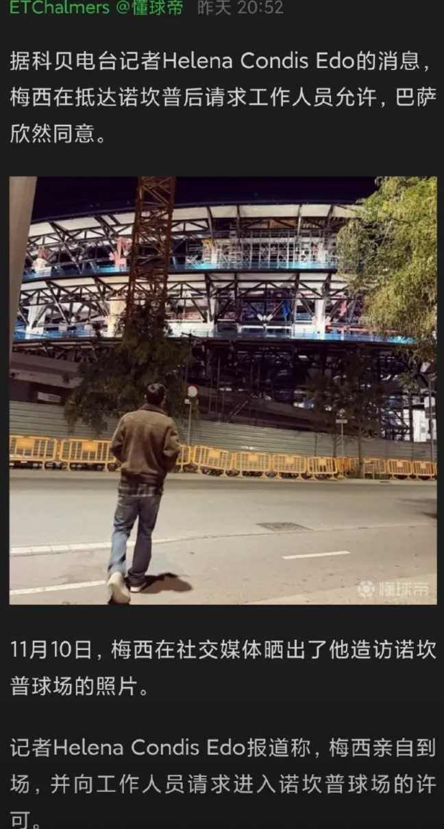 【梅西是个绝顶聪明的人,应该是临时问保安,而保安也高兴地放行了】巴萨的官员在公开训练课上表示,希望以梅西告别战为新诺坎普揭幕。梅西则疑似回应了这一表态。一身休闲装的梅西,仿佛是无意中来到了这里。在周日午夜时分进入了诺坎普,没有联系巴萨的任何人来请求许可或通知,在前往阿利坎特与国家队会合之前,他决定顺道诺坎普看看。 俱乐部方面看到照片后想了一会,提供的版本是,梅西亲自到场并向Limak的安保人员请求进入诺坎普,而俱乐部表示梅西永远是受欢迎的。梅西身边的人则表示,他并不是在收到俱乐部通过建筑公司的安保请求许可后才进入的。这是他的临时起意,前往阿根廷国家队报到途中,特意绕路巴塞罗那,完全是个人自发的怀旧之旅。