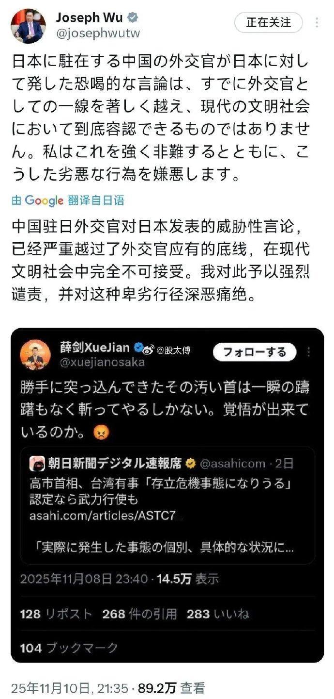 简直找死,吴钊燮大骂薛剑,数典忘祖,脸都不要了! 11月初,日本那边有人不安分了。日本首相高市早苗公然放话,臆测什么“台湾有事”,甚至扬言这可能被日本认定为“存亡危机事态”,要启动集体自卫权出兵介入。 这意思再明白不过,就是想把他们的军事触角伸到中国的台湾。 面对这种赤裸裸的挑衅,咱们这边能惯着吗? 中国驻大阪总领事薛剑直接在社交媒体上回了段狠的:“只能毫不犹豫地斩掉那擅自闯入的肮脏头颅,你已经做好心理准备了吗?” 这话掷地有声,明确告诉某些人:玩火者,必自焚! 日本国内很多人坐不住了,这个正常,但是弯湾那边,居然一些人也坐不住了。 岛内那个伪安全会议的秘书长吴钊燮,昨晚(11月10日)迫不及待地跳出来加戏了。他摆出一副痛心疾首的嘴脸,叫嚣什么薛剑总领事的言论“严重越过外交官底线”,是“卑劣行径”,还说他“强烈谴责”。 这就很搞笑了。 我们先来看看这事的本质。日本政客率先发出军事干涉中国内政的狂妄言论,这是在对一个中国原则的严重挑衅。我们外交官基于国家核心利益,发出义正辞严的警告,是天经地义的防卫与反击。 吴钊燮之流,平日里,面对日本对待湾湾的霸道行为,比如在渔业上的霸凌(肆意逮捕台湾渔民),一般屁都不敢放一个,转过头来却对自家外交官维护主权的正义之声重拳出击。这叫什么?典型的“挟洋自重”,是数典忘祖的奴才心态! 他跳出来“强烈谴责”,无非是想刷一波存在感,在国际上扮演“受欺负”的可怜角色,企图博取不明真相者的同情。但这套戏码,早就演烂了。 吴钊燮们到底在怕什么? 他们真正害怕的,是中方越来越坚定、越来越直接地戳穿“台独”的幻想。我们外交官如今锋芒毕露的发言,打碎了他们试图营造的“温情”假象,把“台独”势力与外部干涉势力勾连的险恶用心,赤裸裸地晾在了台面上。 这让他们慌了。他们的“台独”事业,见不得光,尤其怕这种直白、硬朗的真理。 所以吴钊燮才会气急败坏。他的“强烈谴责”,恰恰证明我们的反击打到了他们的痛处,打碎了他们妄图“倚外谋独”的迷梦。 需要明确的是,台湾问题纯属中国内政,轮不到任何外部势力说三道四,更不容日本之流借题发挥,搞军事冒险。 吴钊燮之流的表演,改变不了一个铁的事实:台湾是中国领土不可分割的一部分。他们越是上蹿下跳,越是证明其内心的虚弱与恐惧。他们以为抱紧外部势力的大腿就能高枕无忧,却忘了历史潮流浩浩荡荡,逆之者亡。 我们早已把话挑明:勿谓言之不预也。谁想试试“斩首”的锋芒,大可以放马过来。