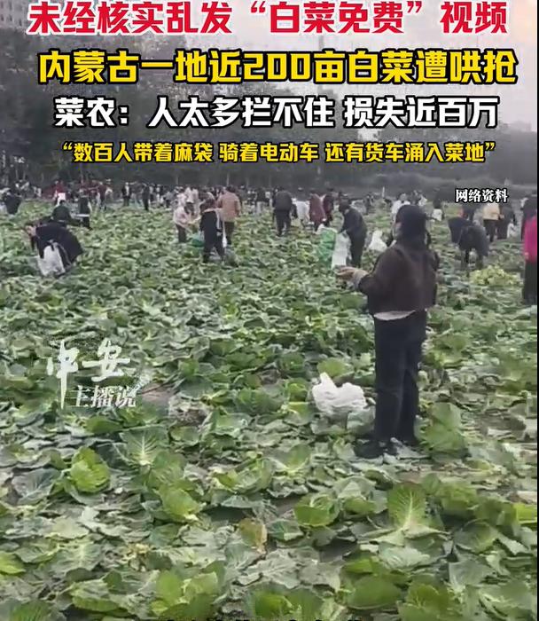 “这是什么世道!”近日报道,内蒙古赤峰,男子承包了200亩地种大白菜,辛苦了一年,眼瞅着要卖钱了,万万没想到,突然来了700多人,拿着麻袋,骑着电动车,甚至开车来哄抢,男子损失高达100万,一年白辛苦了。背后的原因,竟是有人使坏,在网上发布“白菜免费”的视频,当地媒体未经证实也开始转发,男子崩溃。 “这哪是捡白菜啊,这分明是抢人家的血汗钱!”谁能想到,在一片两百亩的白菜地里,竟然会上演一场让人心疼的闹剧:承包这片地的李先生,眼睁睁看着七百多人朝地里涌来,麻袋、电动车、三轮车等等齐上阵,不到半天工夫,半年的辛苦就这么被抢空了。而起因,竟是一段不知谁发的“白菜免费”的短视频。 刚开始还只是三五个村民在地边转悠,试探着问是不是真能随便拿。李先生还耐心解释,说那是谣言,菜是要卖的。可后来人越聚越多,他的声音很快就被淹没了。不知谁喊了句“再不动手就没了”,人群就一股脑全冲进了菜地。那场面,不像在捡菜,倒像在比赛谁装得快。 有经验的专挑好的砍,麻袋装满了就往电动车后座垒;开车来的更利索,后备箱一开,整排整排的白菜往里扔。李先生站在地头,嗓子喊哑了,胳膊抡酸了,却拦不住这汹涌的人潮。他后来回忆说,那一刻的感觉不是生气,是绝望,就像眼睁睁看着自己的房子着火,却连一盆水都递不上去。 说起来真让人哭笑不得,那条惹事的短视频拍得还挺“像那么回事”,地里确实有些白菜被冰雹打了,叶子破了几处,可镜头专挑坏的拍,还配上“免费啦”的声音,谁看了不动心? 更气人的是,就连当地一个有不少人关注的媒体账号,也没核实就转了出去,给这场闹剧添了一把火。消息传得太快,真话却追不上,这就是如今这个时代的悲哀,而这份悲哀,最后全压在了一个普通农民身上。 其实,参与这场哄抢的未必都是坏人,不少起初犹豫的,看见大家都在拿,也就说服了自己:“法不责众嘛”、“不就几棵白菜”。那种“不拿就亏了”的想法,让做人的底线在从众心理面前彻底垮了。而那个乱发消息的人,可能只是随手一拍,却从没想过,手机那头连着的是一个人全部的家当。 李先生算过一笔账,一亩地投入的种子、化肥、人工加起来差不多五千,两百亩就是一百万。这不是冷冰冰的数字,是他每天天不亮就下地,深夜才回家的全部生活。 他本来打算用这笔钱给孩子交学费,给老人看病,或许还能攒点钱把家里的旧房子修一修。可现在,地里只剩下一片乱七八糟,踩烂的菜叶、乱七八糟的车辙,和丢得到处都是的麻绳。 事情传开之后,倒也不是全让人寒心。有人偷偷回来道歉,说要赔钱;乡政府的人也来了,说会帮忙追查。但损失已经造成了,就像地里的脚印,深深浅浅的,一时半会儿是平不了的。 这让人想起那些总是在发生的类似事情,哪里水果卖不出去了,就有人理直气壮地去“帮忙”;哪里工地有材料,就有人顺手“捡”回家。每次都说“损失不大”,可又有谁算过,这些“不大”加在一起,是多少个李先生一年的汗水? 虽说法律的事交给法律,但法律之外,还有良心这杆秤。要知道,每一条不经核实的转发,每一次“大家都拿我也拿”的念头,都可能成为压垮别人的最后一根稻草。 只希望这片地能早点恢复生机,更希望这样的闹剧,别再在任何一个丰收的季节重演了。 信源: 红星新闻 2025-11-10—— “白菜免费”引哄抢,传谣信谣不能法不责众 文|一阳 编辑|史叔