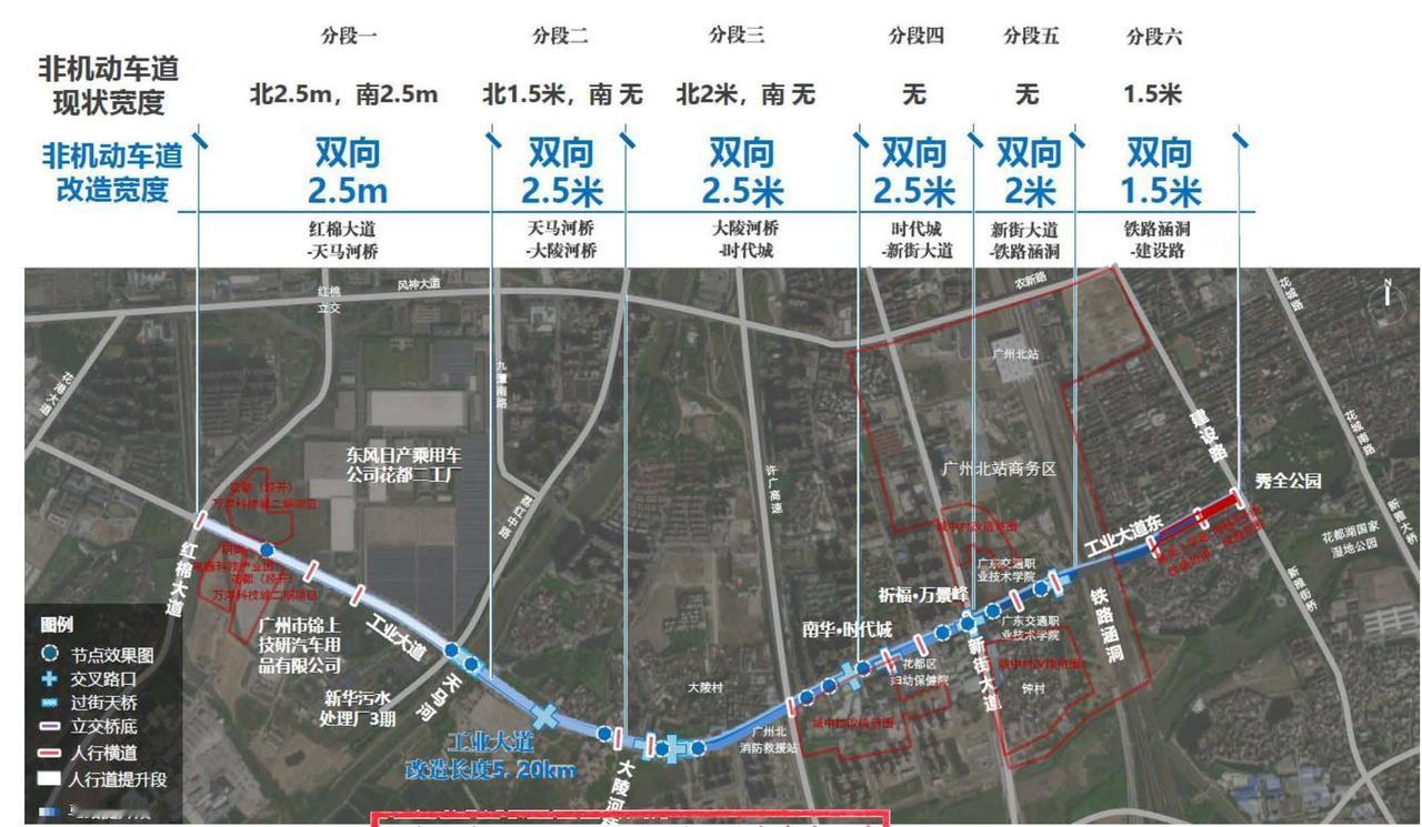 花都区华南路工业大道 (红棉大道~建设北路)将改造,全线设非机动车道。 华南路工业大道沿线(红棉大道~建设北路)道路改造工程位于广州市花都区秀全街、新华街。 本道路工程西起红棉大道,沿现状线位向东上跨天马河、大陵河,下穿广清高速,和新街大道平交,下穿武广铁路,全长5.20 公里。 工业大道为城市次干路,设计速度为40km/h,规划宽度40 米,华南路为支路,设计速度为30km/h,规划宽度18 米。 改造内容包括交通组织优化,路面修护、加铺,环境改造,以及管线、交通、照明等附属设施更换。更换人行道(含建筑退缩空间)铺装、重新交通划线以及环境改造。 本次施工总承包最高投标限价:72236659.82 元。 本项目施工总工期: 270个日历天。 目前,华南路工业大道沿线(红棉大道~建设北路)道路改造工程正在进行施工总承包公开招标。