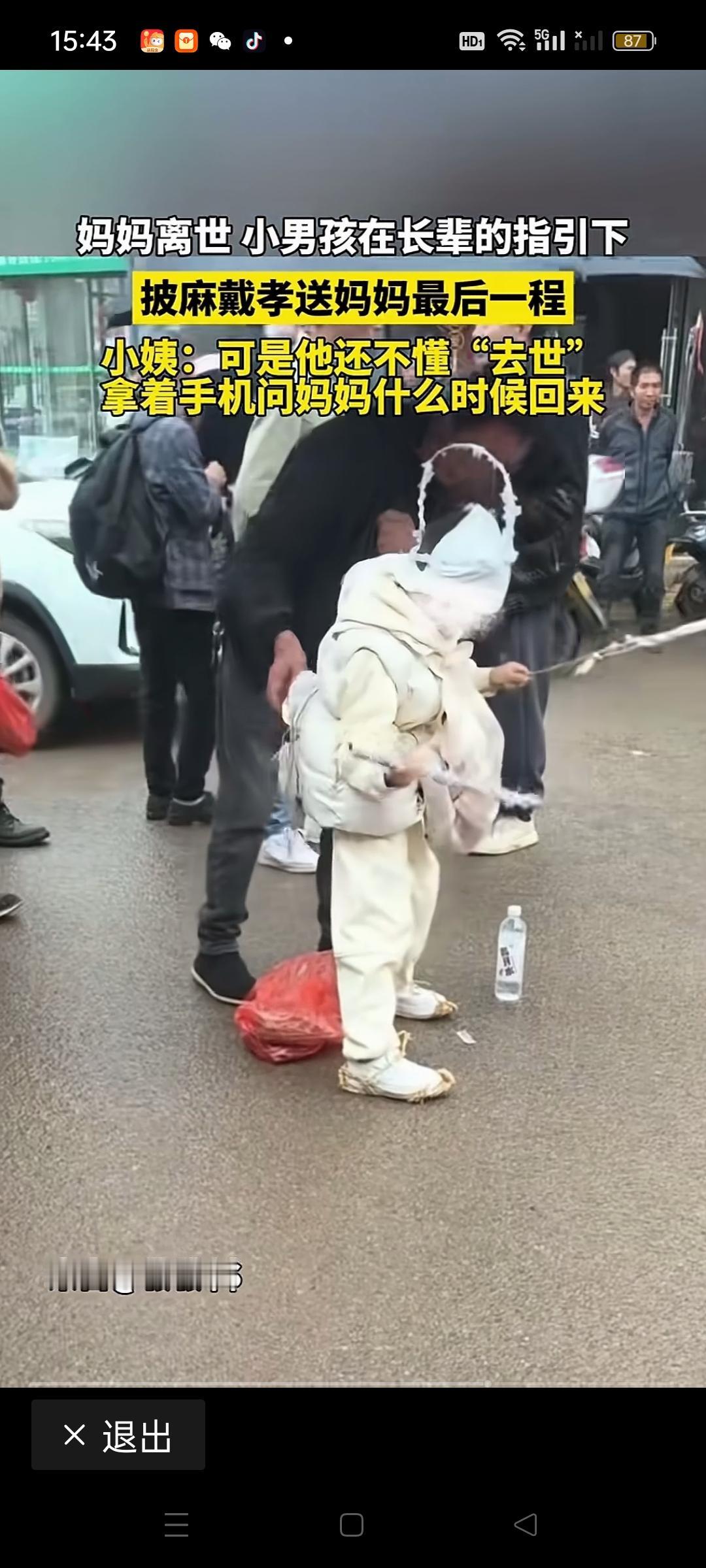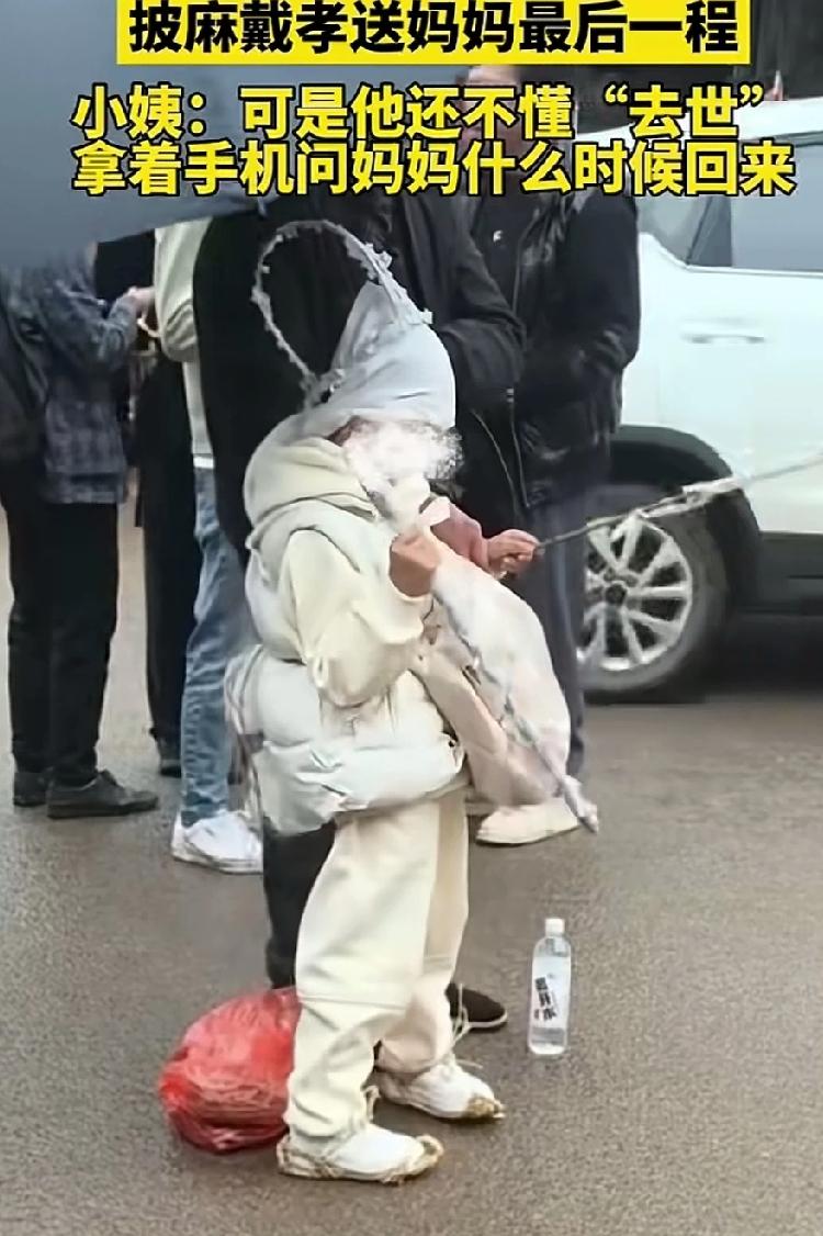 妈妈离世小男孩在长辈的指引下,披麻戴孝送妈妈最后一程,拿着手机还问妈妈什么时候回来? 男孩也就六七岁他不懂离世的含义,也许幻想着妈妈会回来,可他哪知道再也见不到妈妈,孩子正需要呵护的时候妈妈离去,命运太残忍了,怎么忍心让这么小的孩子失去妈妈,孩子一身白衣服是为妈妈穿的感谢妈妈几年的养育之恩,这么小的孩子就经历失母之痛,怎不令人揪心!