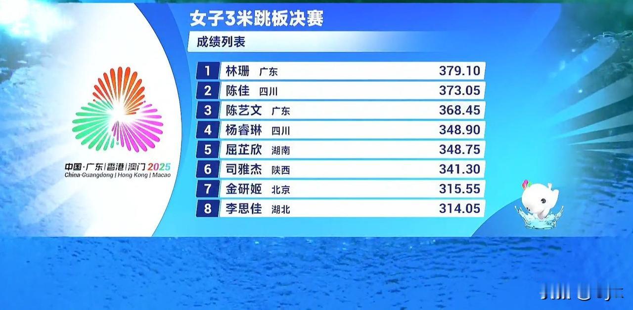 恭喜林珊,全运会女子3米跳板夺冠,收获个人第三金。 在刚刚结束的全运会女子3米跳板决赛中,广东选手林珊以379.10分的成绩摘得金牌,这是她在本届全运会上获得的第三枚金牌。四川选手陈佳以373.05分获得银牌,广东奥运冠军陈艺文则以368.45分获得铜牌。 林珊在比赛中表现稳定,动作难度与完成质量俱佳,一路领先并最终夺冠。这枚金牌是对自己长期努力的最好回报。陈佳和陈艺文也展现了高水平的竞技状态,为观众带来了一场精彩的比赛。 本次比赛不仅展现了中国跳水项目的强大实力,也让观众看到了新一代选手的成长与进步。