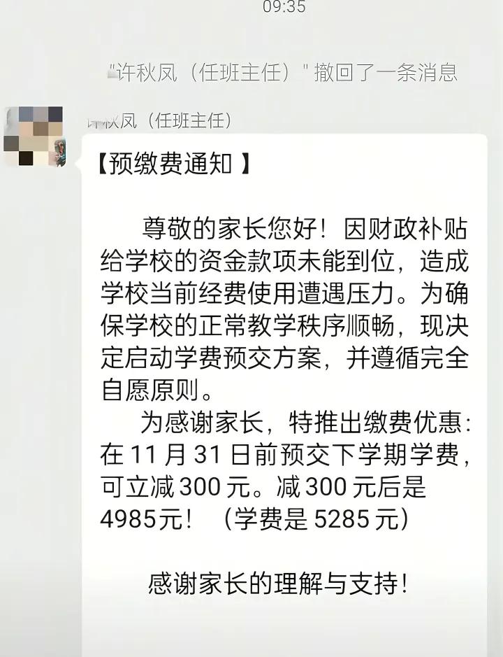 以前有期房,后来有期车,现在期校也来了吗? 有家长发文称某学校发布“提前预缴学费”通知,提前缴费有优惠,跟期房、期车一个调调。 虽说是自愿原则,但是依旧引起家长担忧,不少网友猜测学校是不是开不下去了? 从来都是开学时交学费,从来没见过提前四五个月收学费的,老师工资恐怕都开不出来了,这种通知发出来,确实让家长比较担忧。