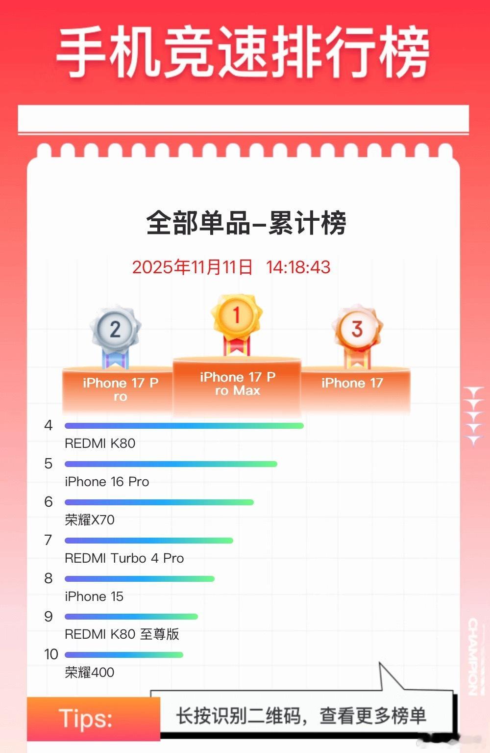今天已经是11月11号了,又是iPhone 17系列销量登顶,甚至第五iPhone 16 Pro,第八iPhone 15