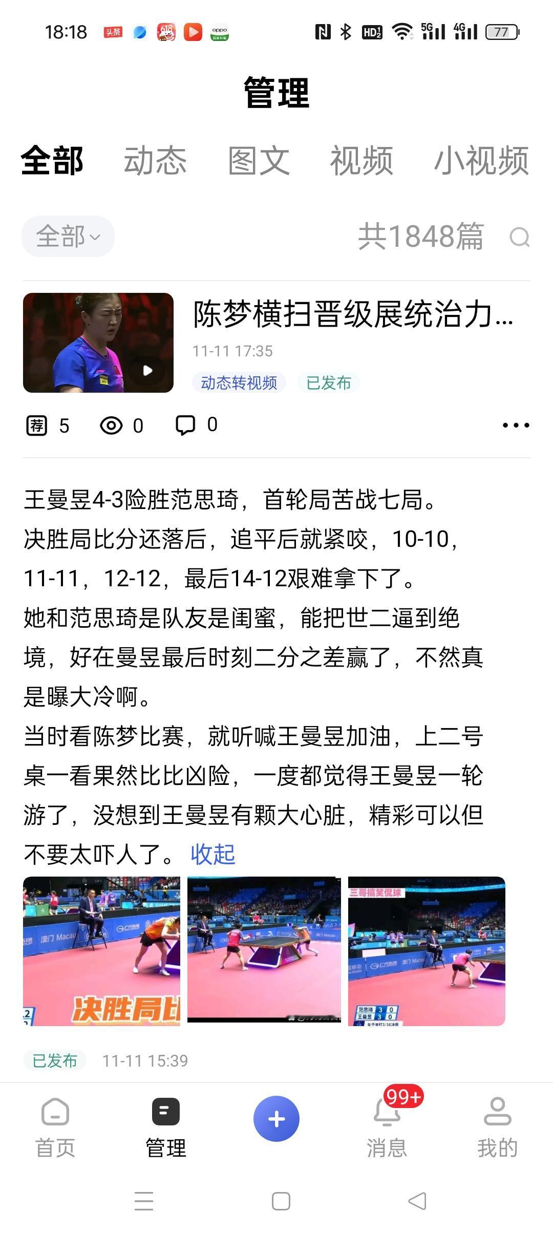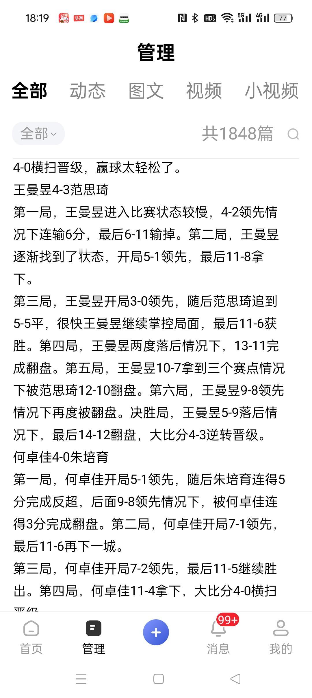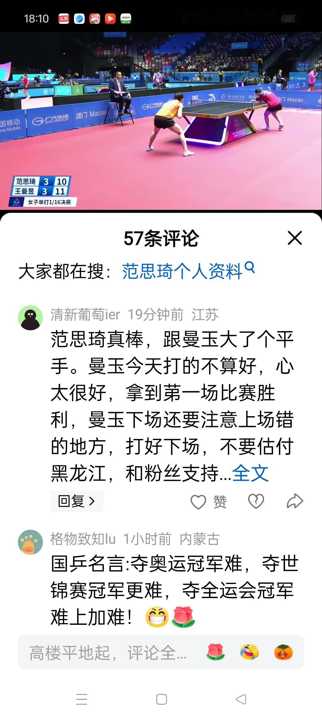 曼昱今天打的不太好,范思琦太棒了,整场比赛我为曼昱担心,希望她能赢。 曼昱首轮苦战七局。4:2的状况下连输6分,范思琦11:6赢了曼昱。 曼昱第二轮调整心态,赢了范思琦。 第三轮范思琦0:3落后追到和曼昱5:5随后被曼昱掌控局面6:11输给曼昱。 第四轮范思琦二度领先曼昱,被曼昱翻盘11:3输给曼昱。 第五轮范思琦7:10落后曼昱,奋力追赶12:10领先曼昱。 第六轮范思琦8:9落后曼昱,再次翻盘拖到决胜局9:5领先曼昱,没想到曼昱逆转14:12大比分4:3晋级。太高兴了。 这场比赛,世界第二的曼昱打的艰难,范思琦虽然输了,仍然很棒! 为王曼昱、范思琦点赞! 我新发布的内容被官方推荐啦!👍你也快来发布一条吧!带