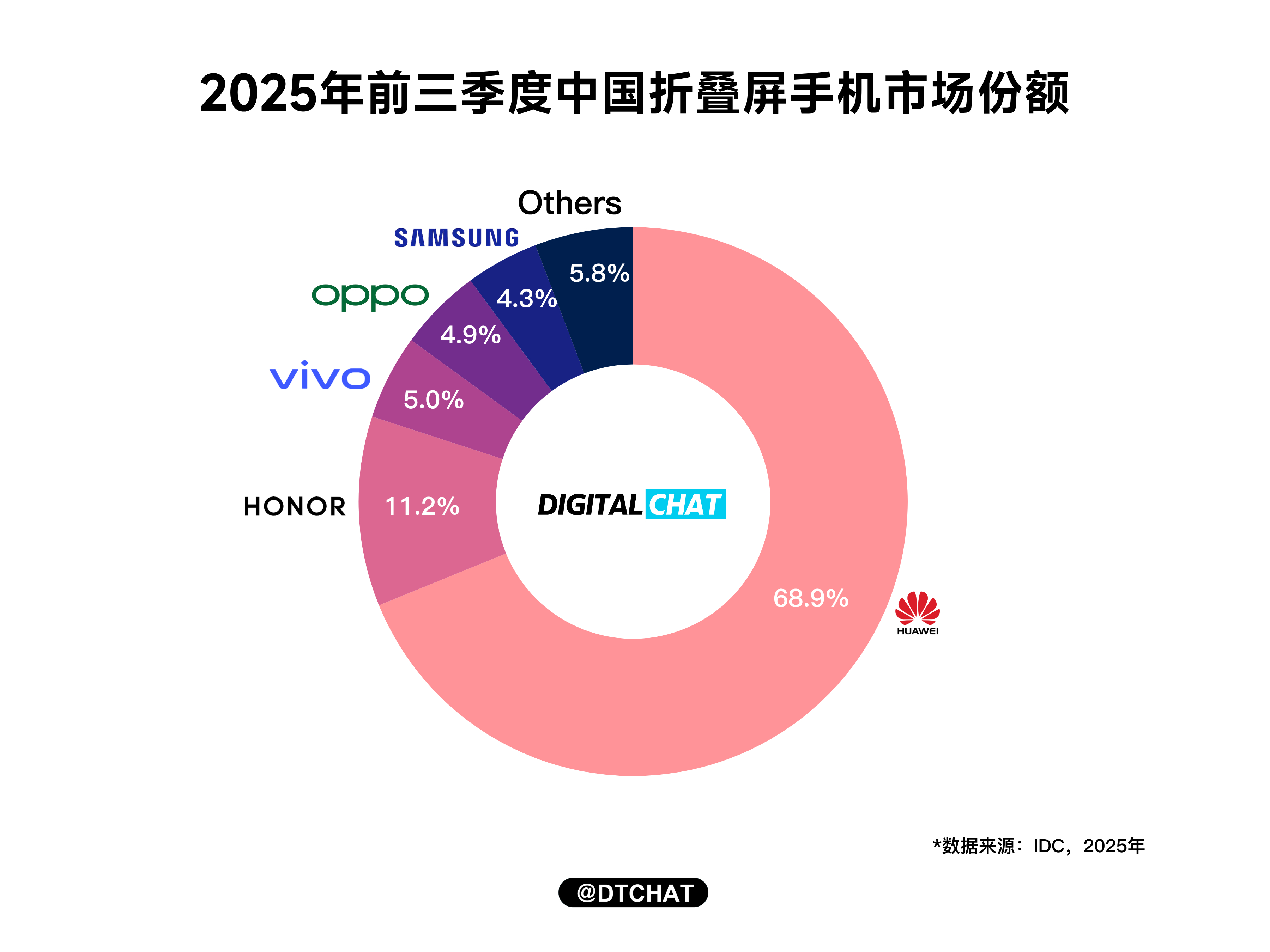2025年前三季度中国折叠屏手机市场数据出来了,华为以接近70%的份额断档领先,成为首个折叠屏累计出货突破1500万台的国厂品牌。排在后面的则是荣耀、vivo、OPPO、三星。华为的产品形态应该是最多的,除了常规的小折叠手机、大折叠手机,还有三折叠和阔折叠,而且阔折叠的销量一直保持不错。其他家主要还是以大折叠屏为主,这几年开始都主打轻薄,并且提升与iOS生态的互联能力,构建差异化优势。荣耀凭借新品Magic V5与Magic V Flip系列的出色表现,以11.2%的市场份额位居行业第二;vivo则以5.0%的份额位列第三,用了这么久的vivo X Fold5,我觉得原子工作台确实挺不错;OPPO凭借Find N5系列率先搭载旗舰芯片的先发优势,市场份额第四;三星则通过Galaxy Z Fold7系列在轻薄化和质感方面的显著进步重返市场前五。