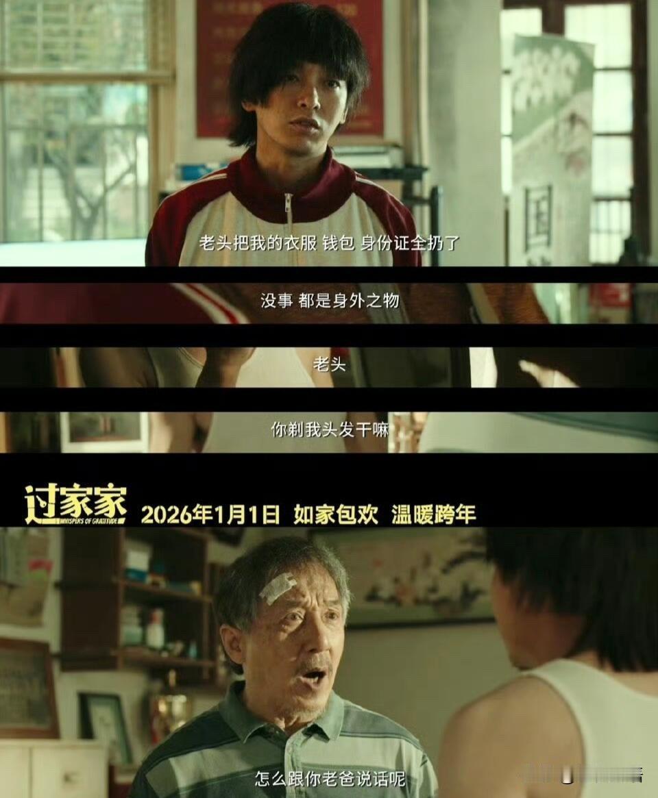 成龙彭昱畅新片《过家家》定档了! 2026元旦上映,光看预告就鼻酸! 71岁的成龙啊! 没了动作巨星的妆造, 一头花白乱发,满脸褶子全露着, 素颜演个“老糊涂”房东,真的戳心! 前阵子看《捕风追影》, 还为他“宝刀未老”拍案叫绝, 这会他认彭昱畅当儿子, 半夜剪人头发、掀被子催起床, 甚至扔人衣服钱包,活脱脱家里长辈! 彭彭那生无可恋的样子, 和成龙的喜感撞一起,又暖又好笑。 想起他年轻时跳钟楼、挂公交的拼命, 再看现在银幕上会愣神的老头, 突然就懂了“看一部少一部”的感慨。 不用硬拼特技也好看啊! 2026第一场电影,就冲这对“临时父子”! 成龙 请说出一部电影,证明你不再年轻