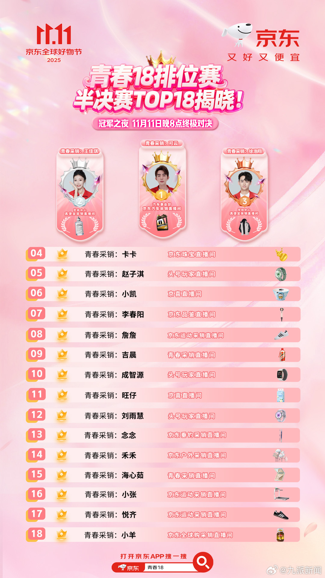 双十一想买得划算又放心?《青春18排位赛》火热开燃,卡卡、赵子淇、小凯等 带着京东采销的硬核底气,“海蓝之谜”、“新飞、”苹果“等好物免费送~还有超多惊喜大礼等你来拿!锁定京东青春采销直播间,双十一闭眼冲不踩雷~