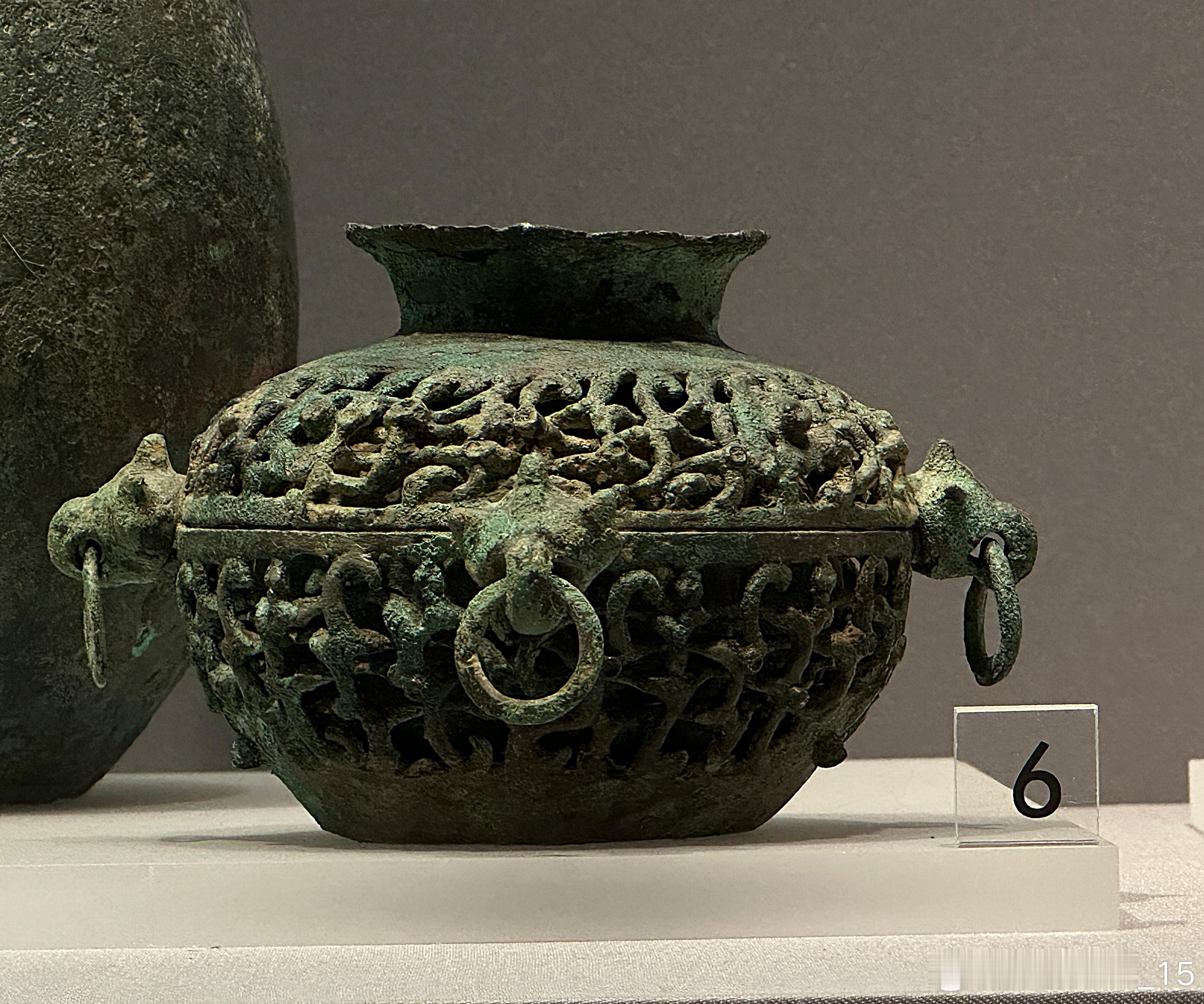 青铜瓿战国 南京博物院藏江苏邳州市刘林墓出土。高7.4,直径9 厘米。青铜铸造,采用部分焊接工艺。器体形小,分内外两层,内层素身壶形,矮颈、反唇、圆肩、鼓腹、平底,底上有锉痕。外层分上下两截,错综复杂,铸造精工。上截边缘有四耳,中三缺,形立体,作兽面衔环状。此器造型精巧,花纹特殊,亦有浓厚的时代特色,可能为温酒之器。