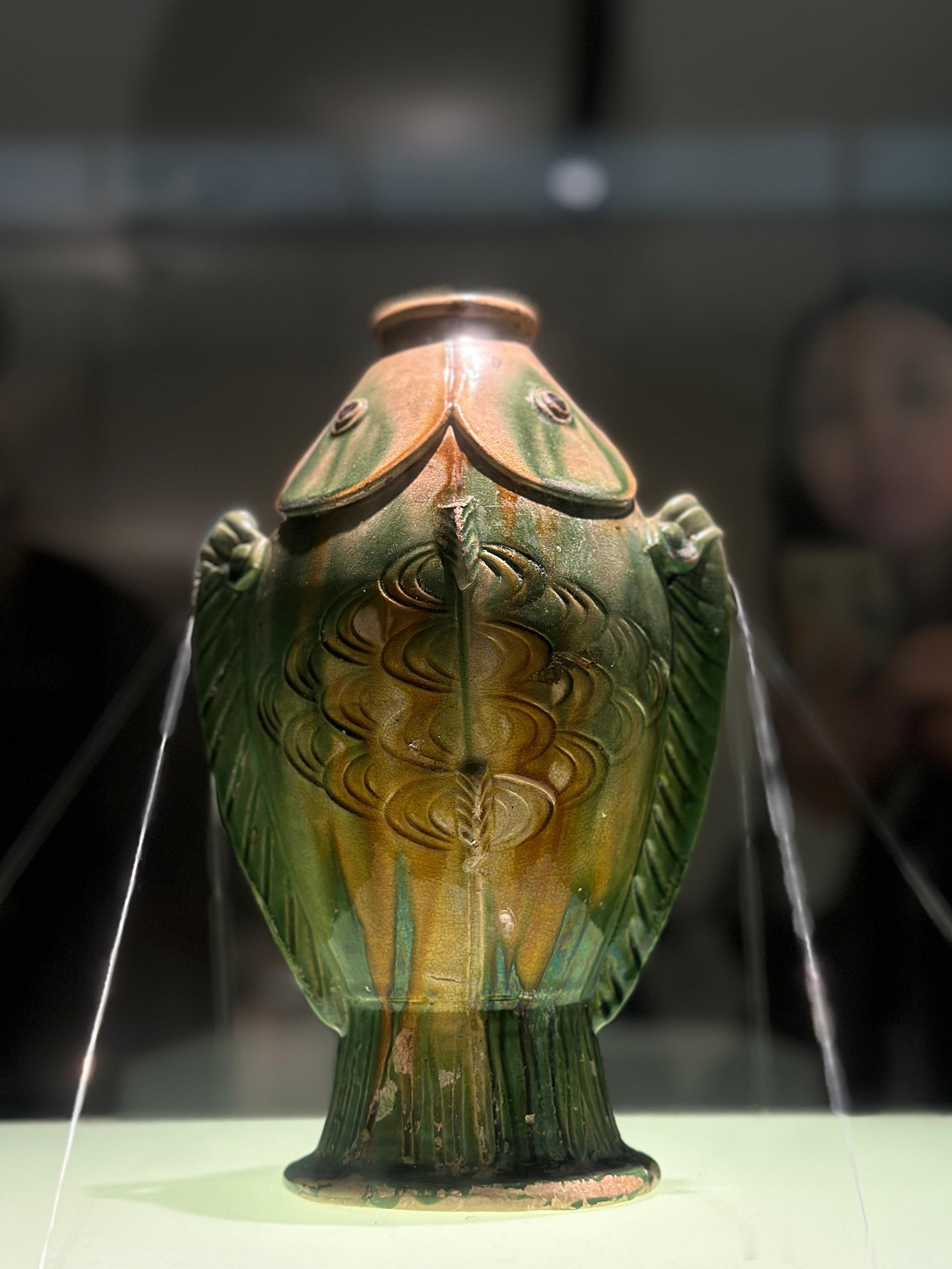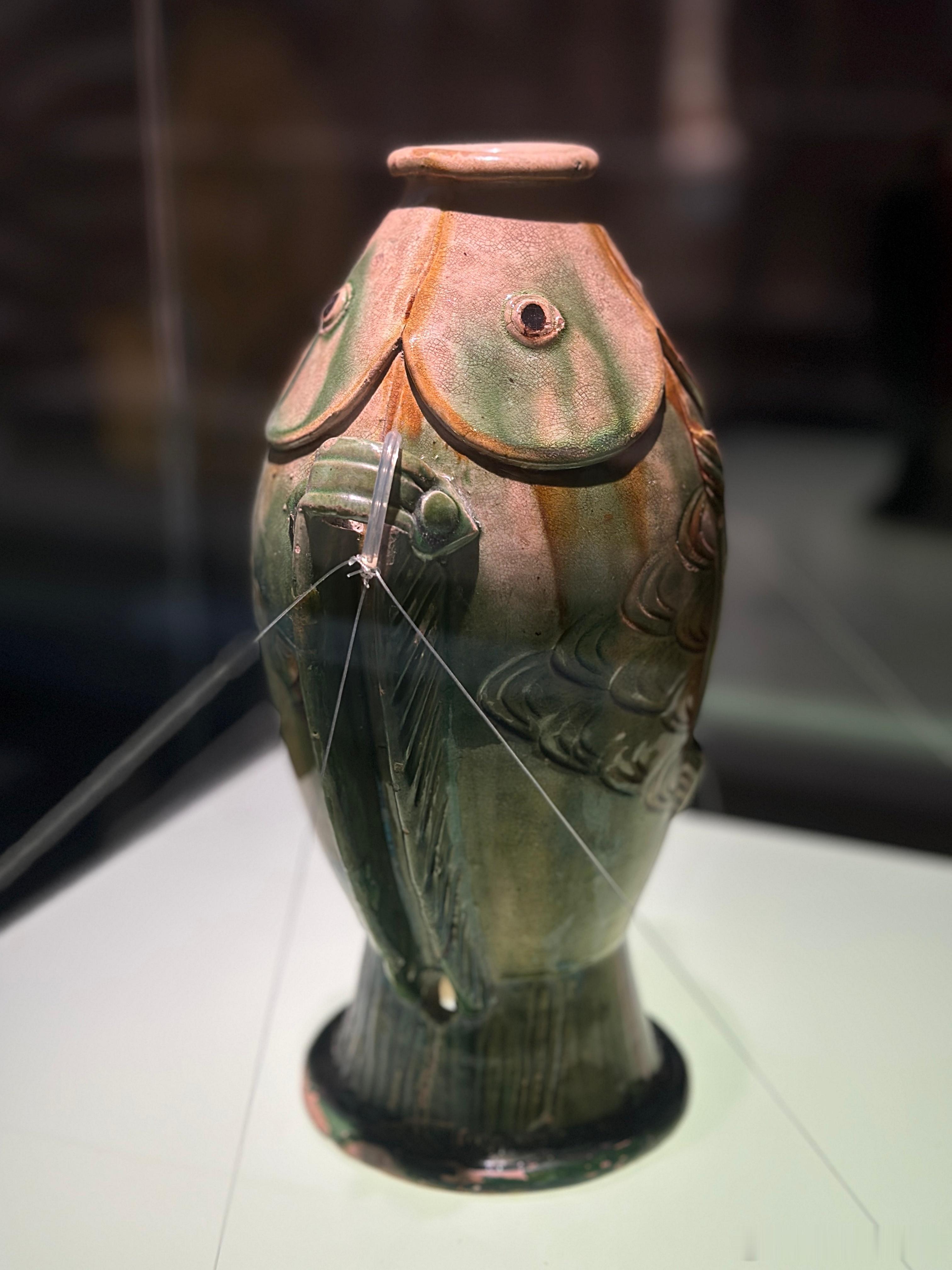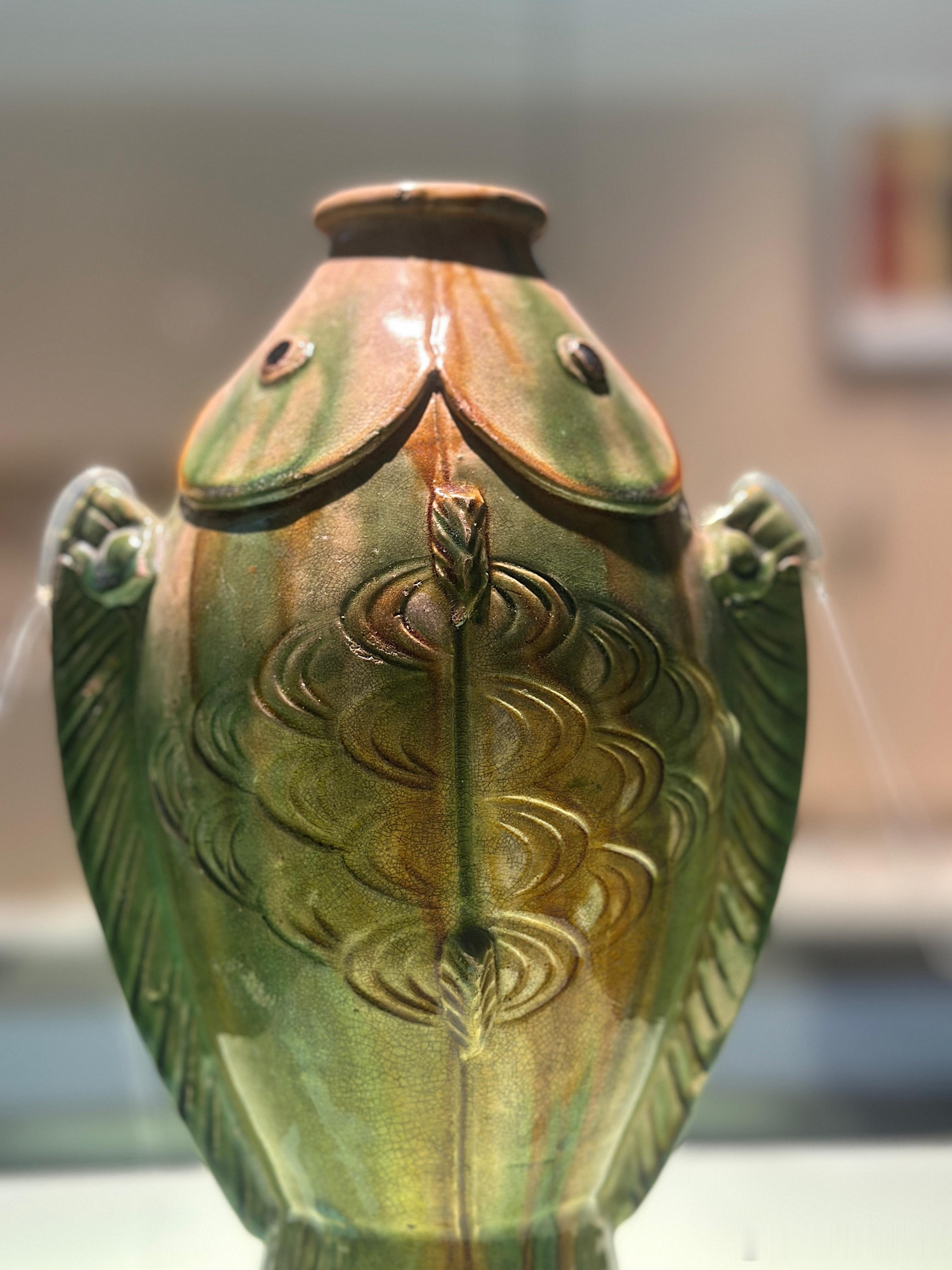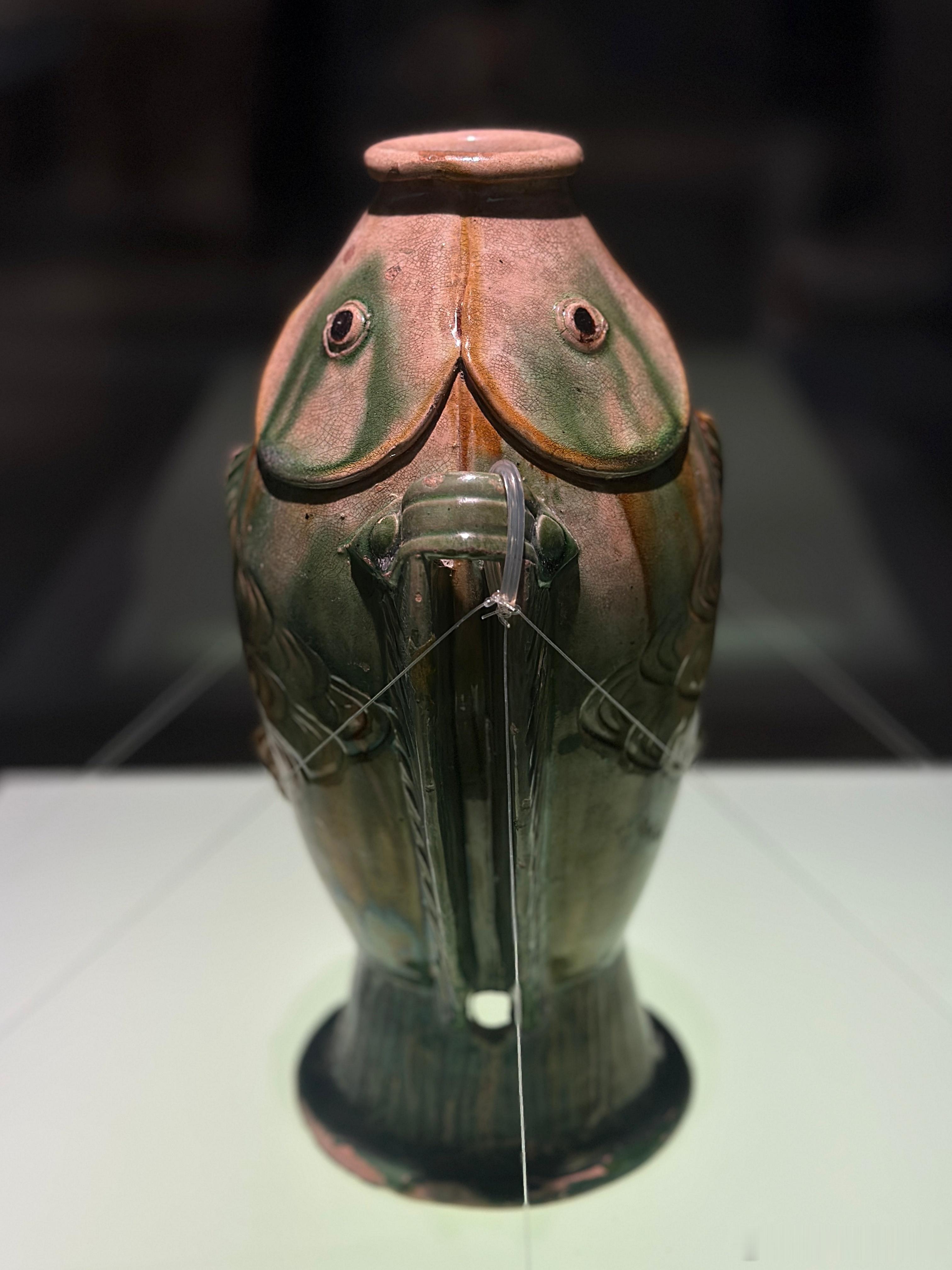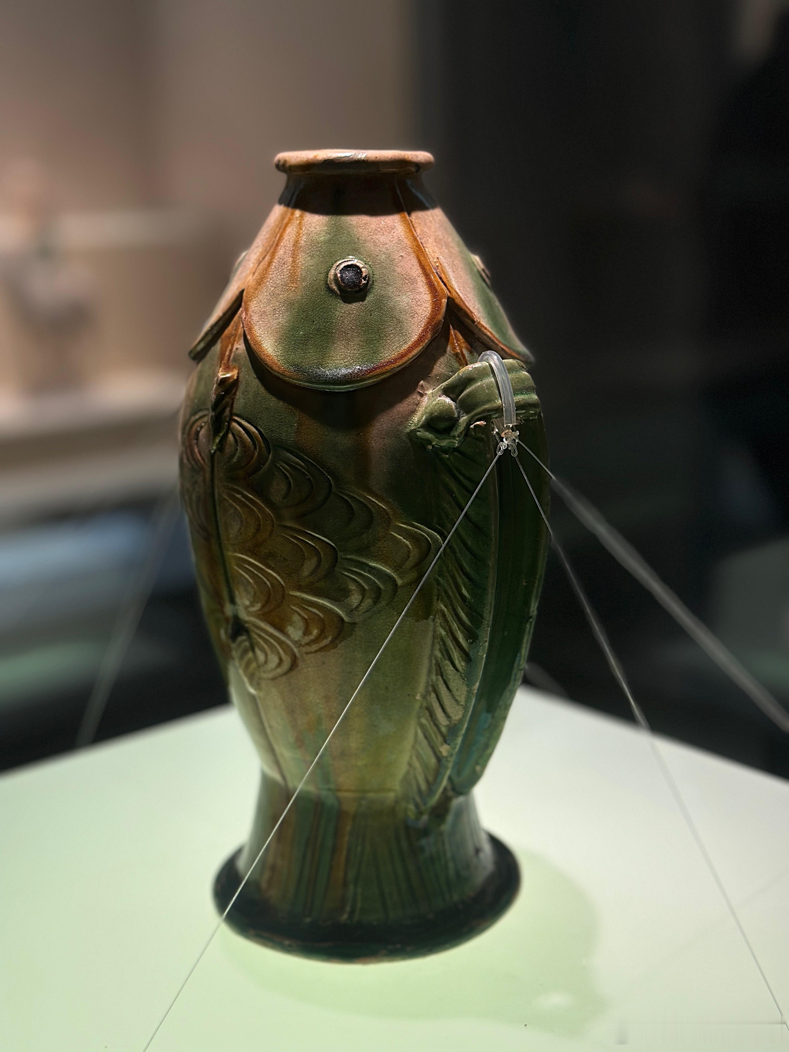 三彩陶双鱼瓶唐 (公元618-907年)南京博物院藏1975年江苏扬州扫垢山遗址出土。腹径11.2厘米,高23厘米。淡红色胎,釉色鲜艳,与中原地区三彩器的稳重浑厚有明显不同,是南方三彩器的特征,以水生动物为造型。此瓶塑成腹部相对的双鱼形,鱼口即瓶口,双脊即为双系,尾部制成瓶底,鱼目、鱼鳞、鱼鳍一应俱全,表面挂有绿、黄、褐三色釉,三色互相浸润交融。