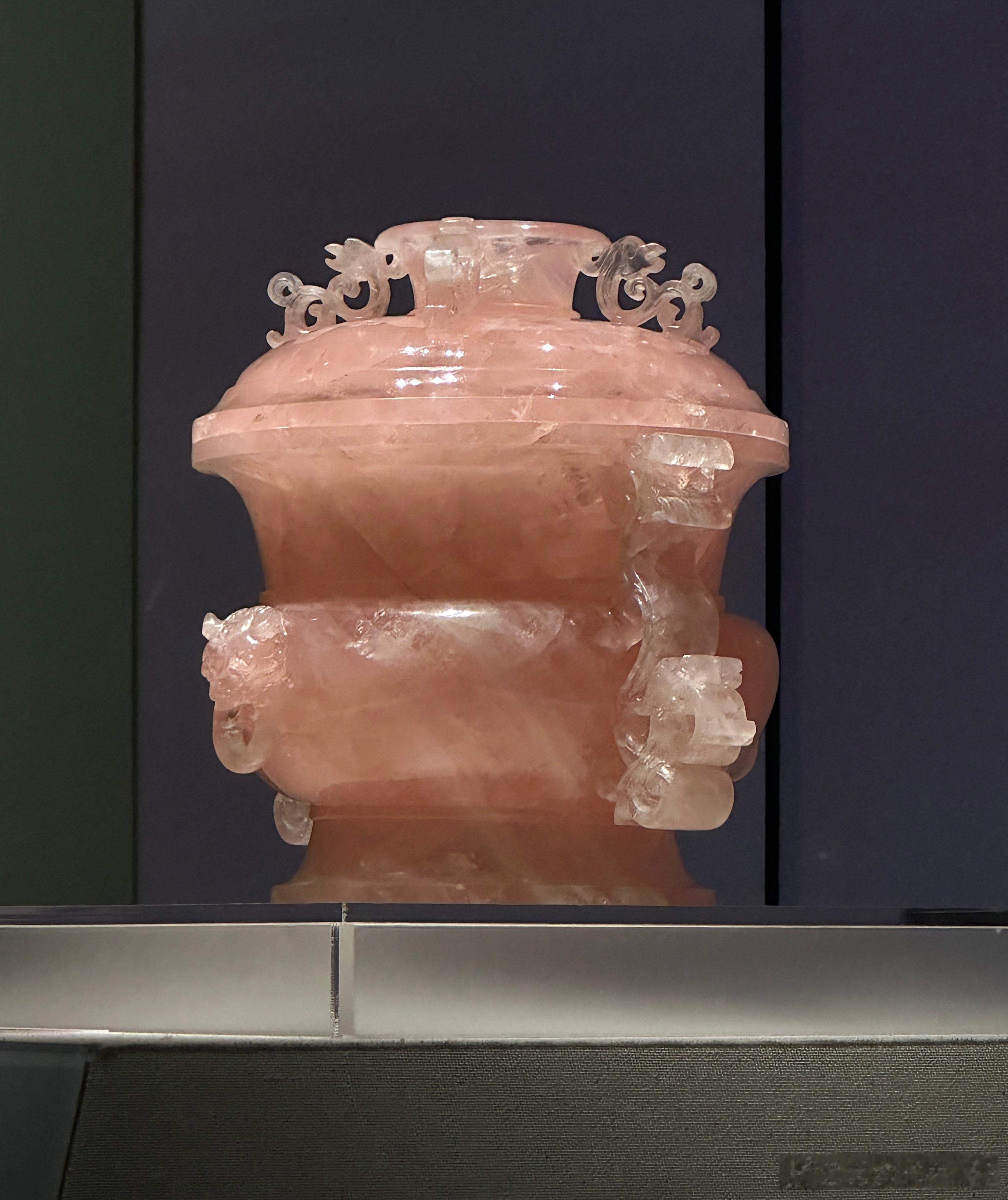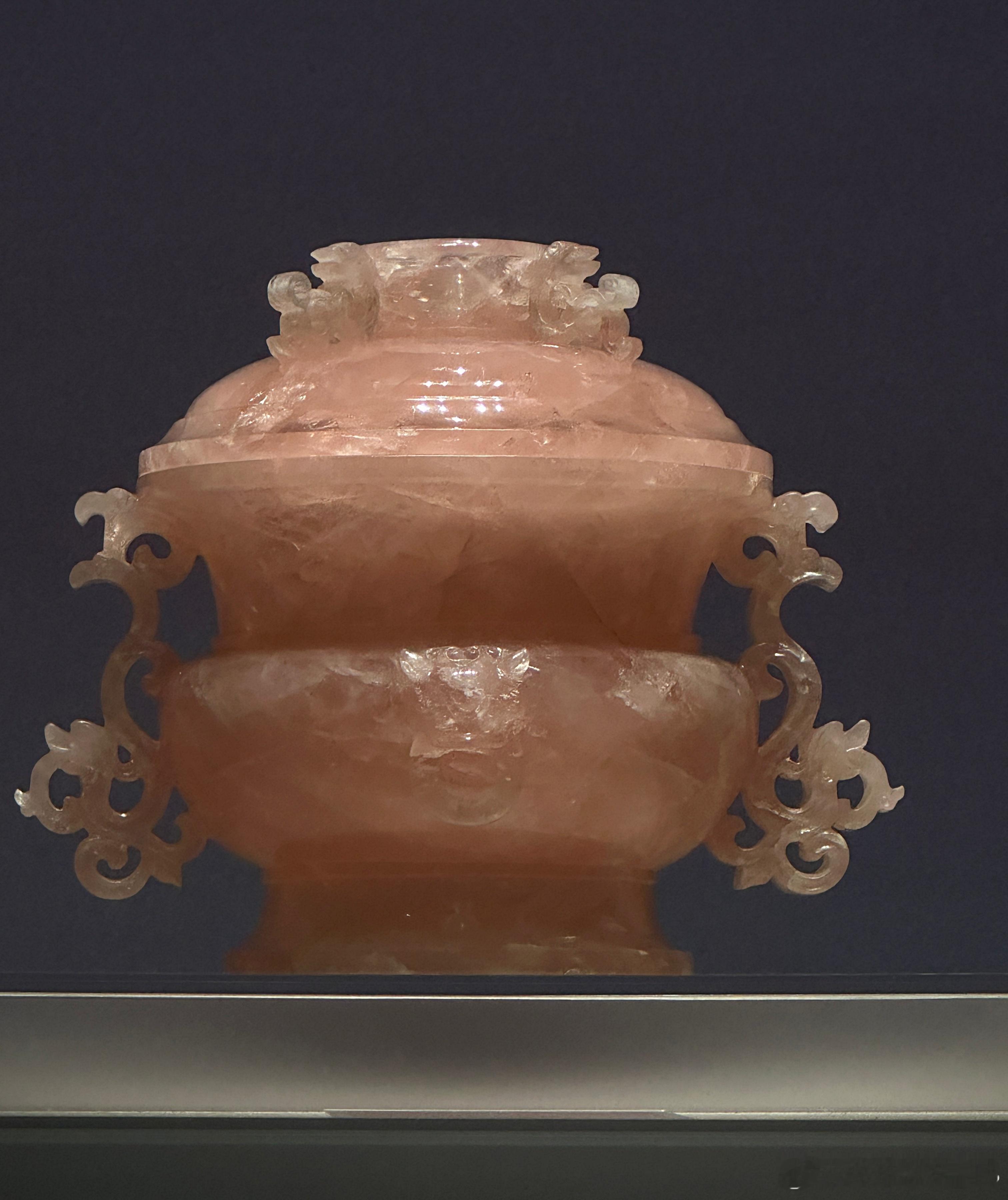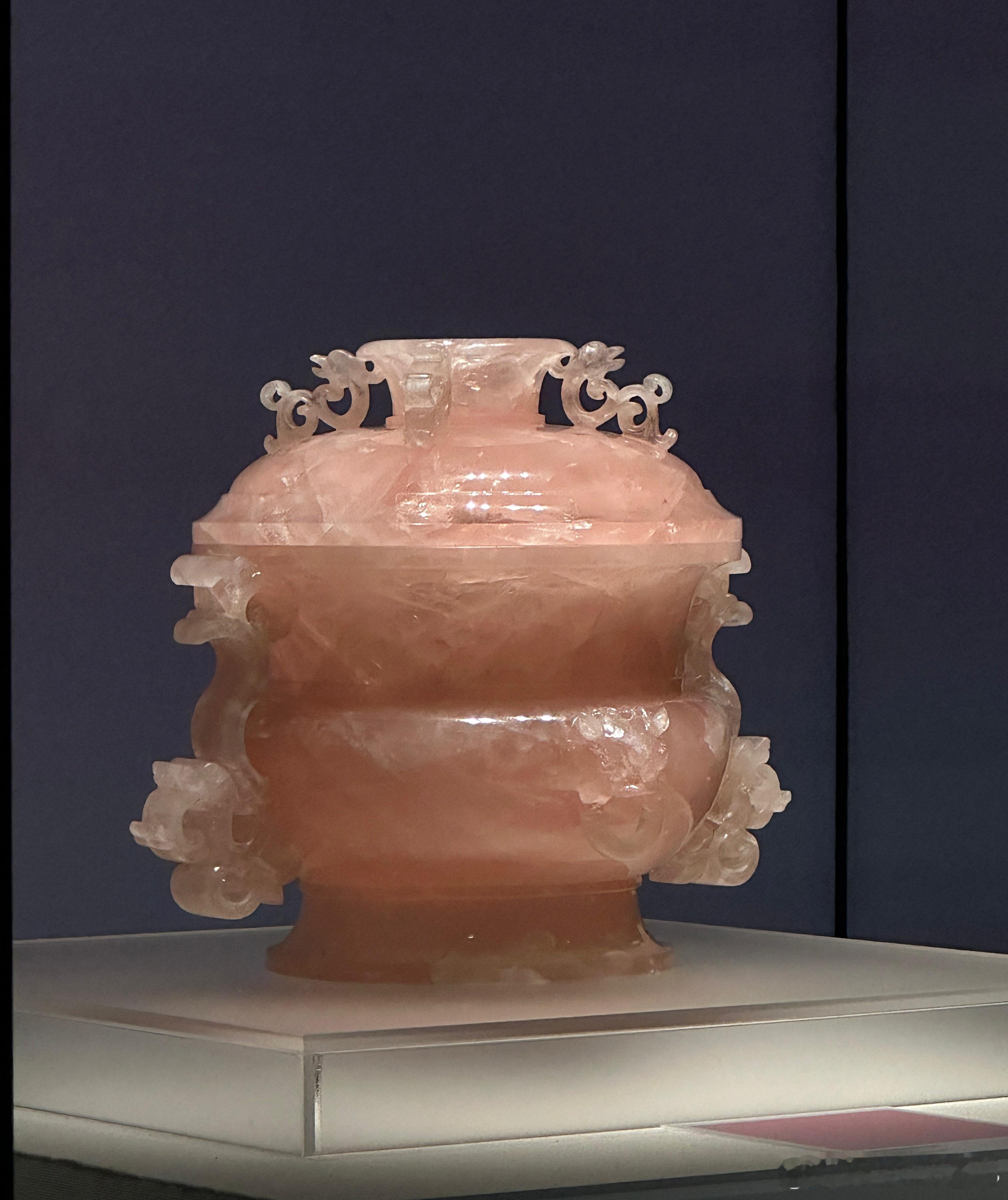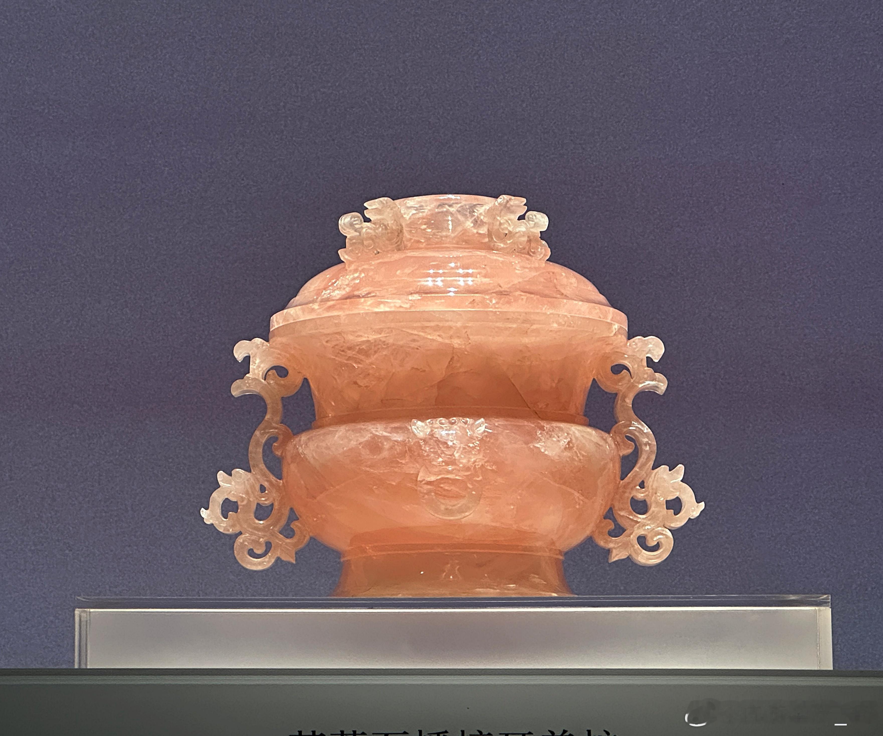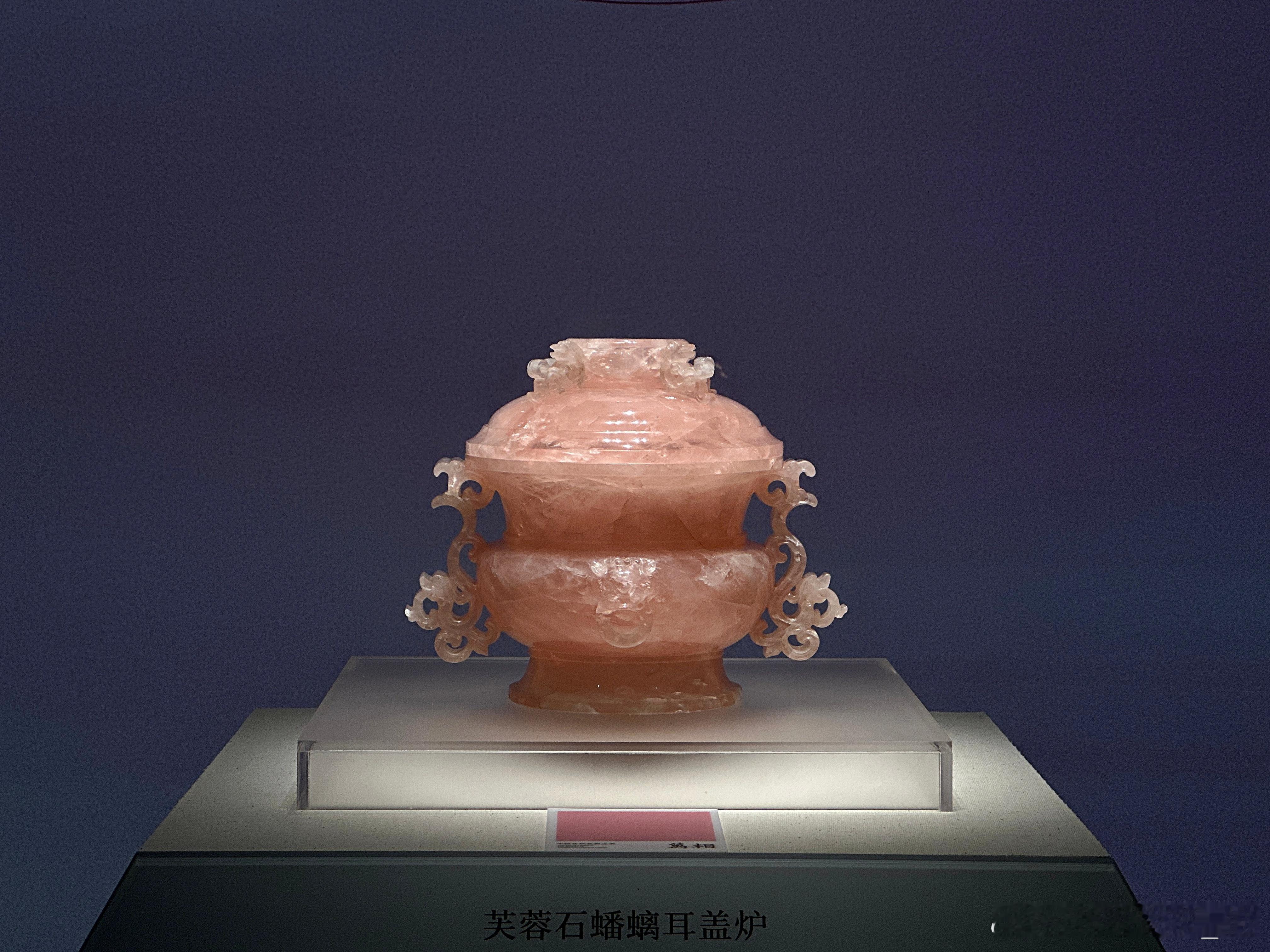 芙蓉石蟠螭耳盖炉 清乾隆 南京博物院藏何以成为南博的顶流,这件文物最特备的地方在于它的材质——芙蓉石,一种来自斯里兰卡的珍稀材料粉水晶。这种粉色的水晶在清代极为稀有,乾隆皇帝也珍爱无比,为了突出石材本身的天然美感,选取了造型相对简洁的香炉。香炉带盖,盖顶雕有四条小蟠螭,两侧为龙首双耳,耳下有小环,腹部雕饰对称的蟠螭和铺首衔环。粉色的芙蓉石看起来柔和温润,是一件好看又实用的香炉。